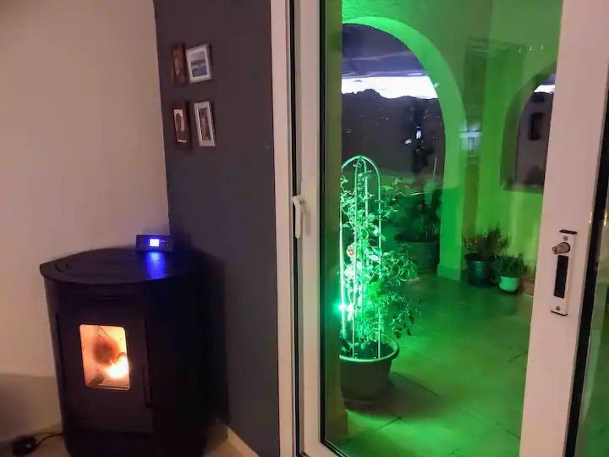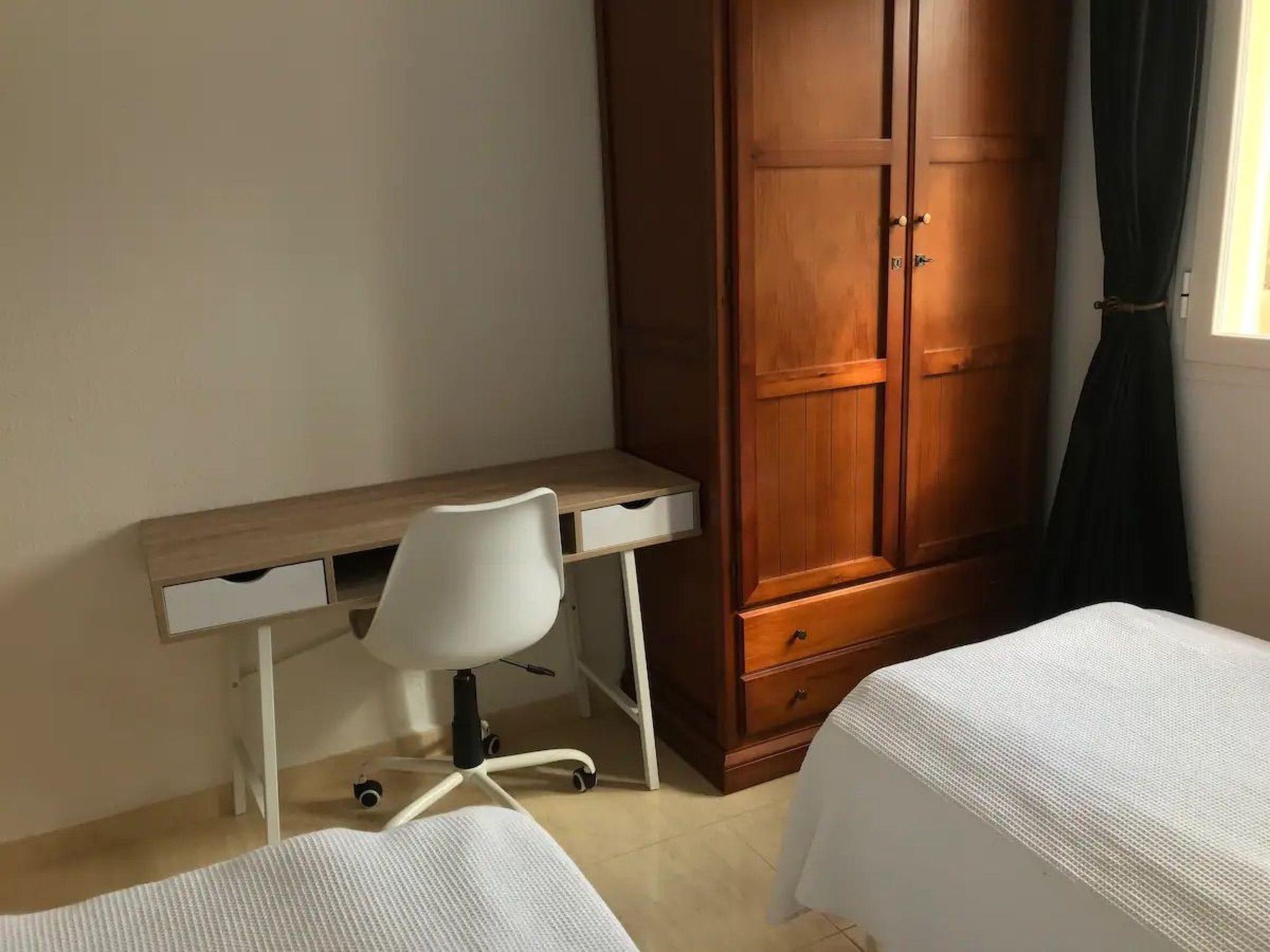 The flat is on 1 level. There are 5 steps up to the front door. Our flat has 3 bedrooms, 2 with double bed, 1 with 2 single beds. Two bathrooms. One with a bathtub and a cupboard containing the washing machine and water tank. The kitchen is in open connection with the living room. In the living room there is a dining table with 6 chairs. In the living area there is a 2 x 2 person leather sofa, coffee table and TV.