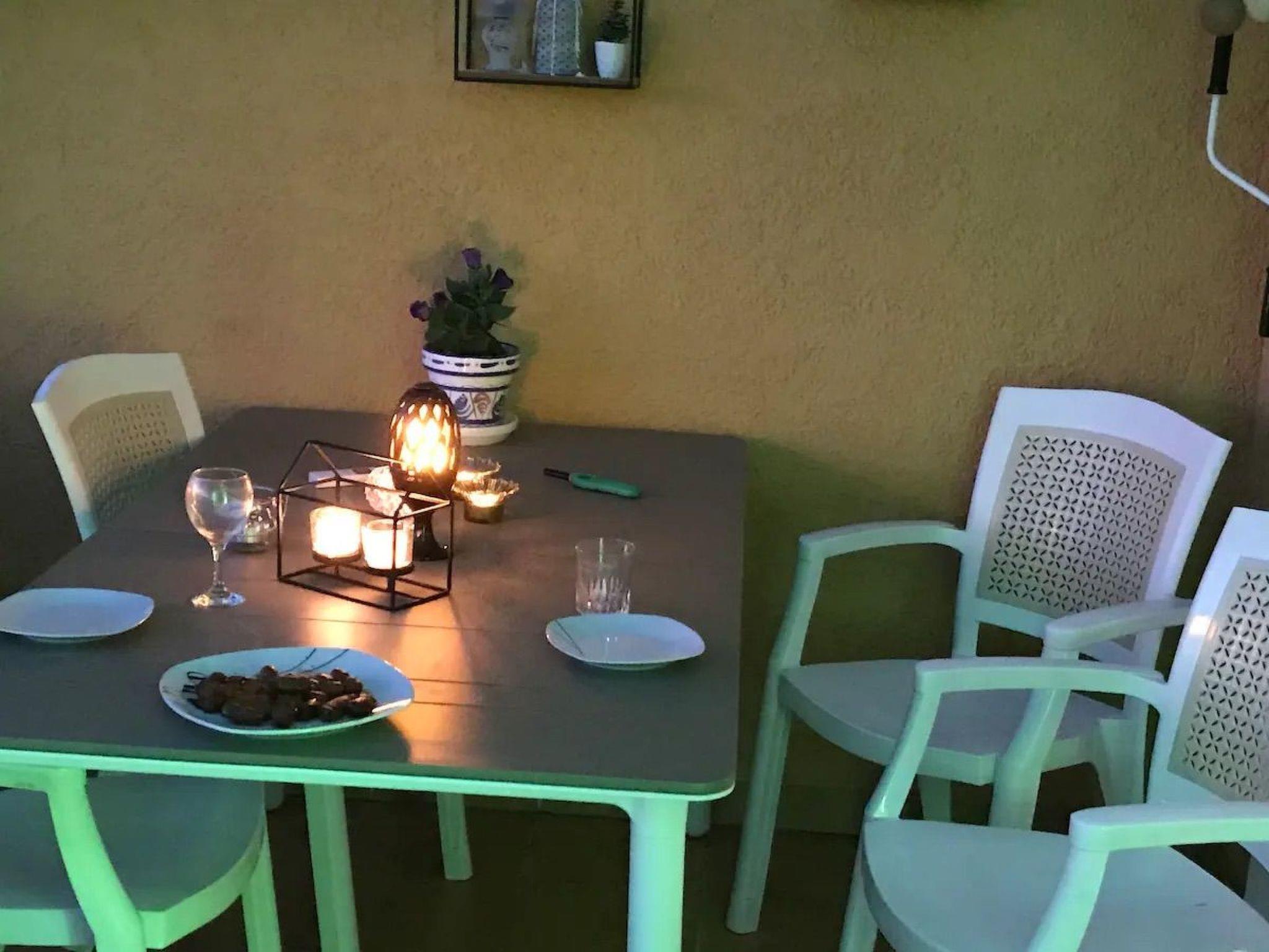 On the balcony there is a table with 6 chairs, 1 barbecue, 1 parasol.