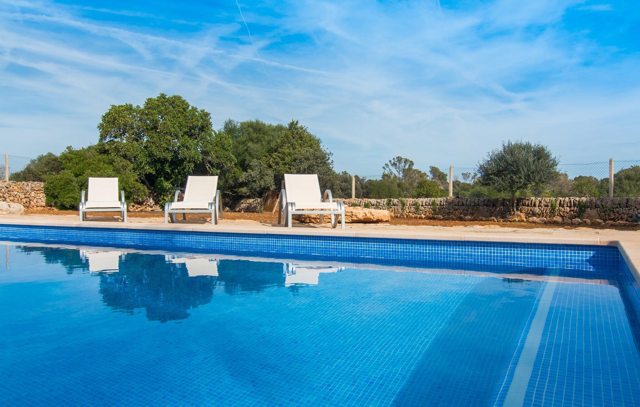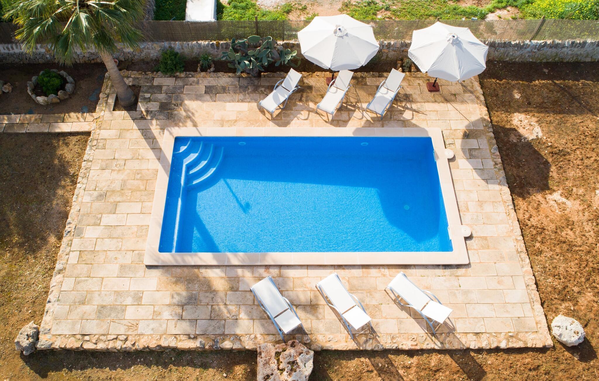 Tillbringa avkopplande dagar vid poolen, ta en promenad till den närliggande stranden, spendera mycket tid med familj eller vänner - en finca på Mallorca lovar många härliga semesterstunder. Ca Na Lida får poäng framför allt för sitt fantastiska läge nära den vackra bukten Santanyí, men det privata poolområdet, omgivet av solstolar och parasoller, är också riktigt imponerande. En liten konstgjord gräsmatta med loungemöbler inbjuder dig att njuta av en morgon cortado och erbjuder utrymme för små konversationer. Dyk ner i det svala vattnet i skuggan av palmen, njut sedan av en utsökt drink och avrunda kvällen på den täckta terrassen med matbord - det är så här du föreställer dig din semester på en finca på Mallorca. En vanlig landsväg leder till huset och du kan parkera direkt framför det på gatan.