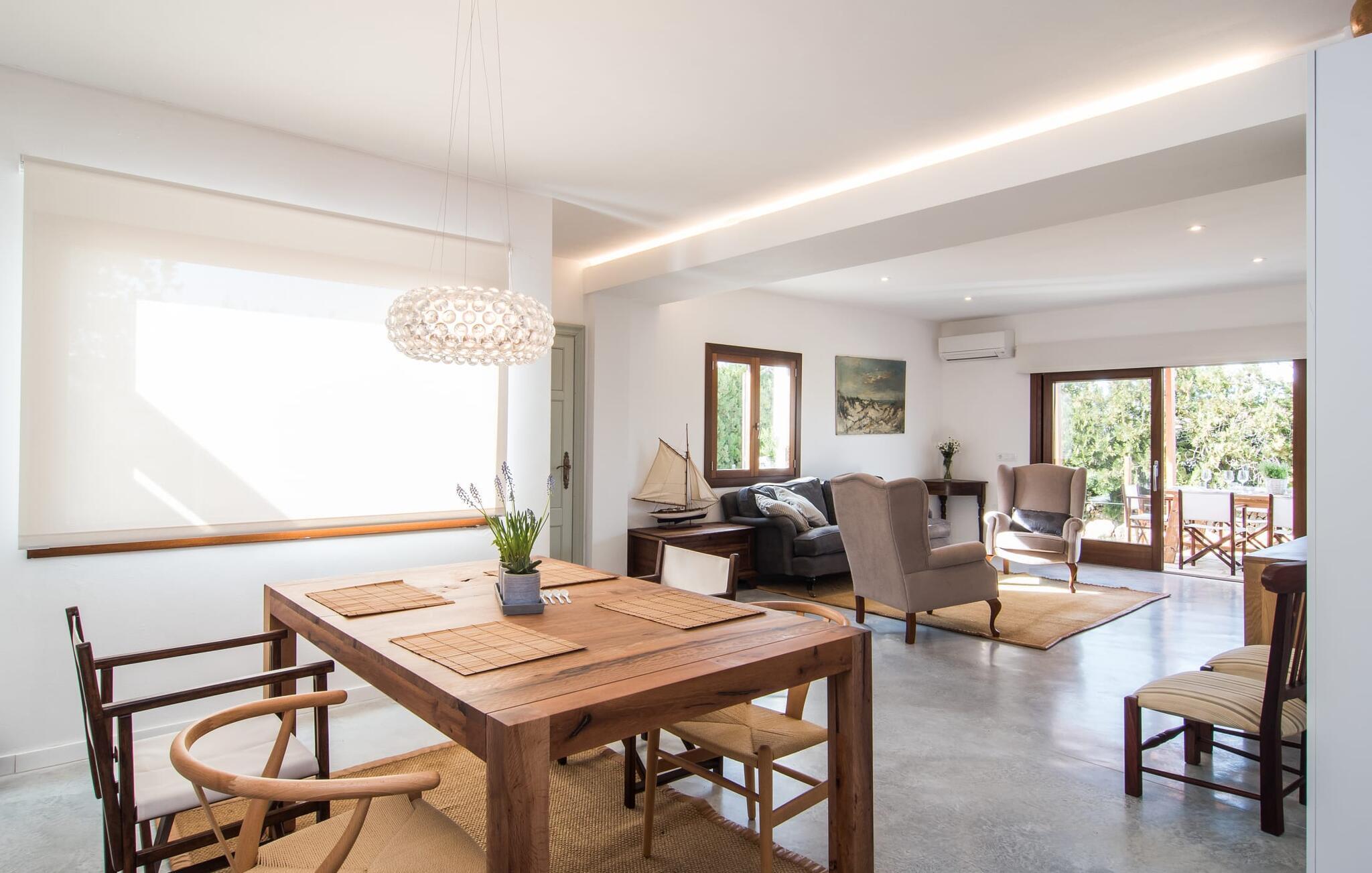 En stor glasdörr förbinder inomhus- och utomhusområdena, så det finns alltid gott om utrymme att tillbringa tid tillsammans. Den täckta terrassen leder direkt in i det ljusa vardagsrummet med soffhörna, TV och mysig öppen spis. Möblerna i ton-i-ton smälter harmoniskt in i det ljusa rummet, där sten och trä har kombinerats på ett behagligt sätt. Köket och matbordet ligger i ett annat hörn av rummet. Semester på en finca på Mallorca: en mysig grillkväll med hela gänget är alltid ett måste. Och den lokala matlagningsön är idealisk för avslappnade timmar av förberedelser. Praktiskt och bekvämt: vart och ett av de tre sovrummen med dubbelsäng (två enkelsängar på vardera 0,90 m x 2,00 m) har också ett attraktivt, modernt badrum. Finca Ca Na Lida ligger i ett lugnt område ca 1,3 km öster om byn Cala Santanyí på Mallorcas sydkust. Stormarknader, småbutiker och bra restauranger kan nås till fots på cirka en kvart, med bil tar det bara några minuter. Fincan ligger på den akustiskt märkbara vägen som förbinder Cala Santanyí med Cala Figuera. Detta gör att de omgivande, vackra stränderna är särskilt lätta att nå. Om du vill fylla på med delikatesser från regionen kan du besöka den färgstarka veckomarknaden i Santanyí, som ligger bara tio minuters bilresa bort.