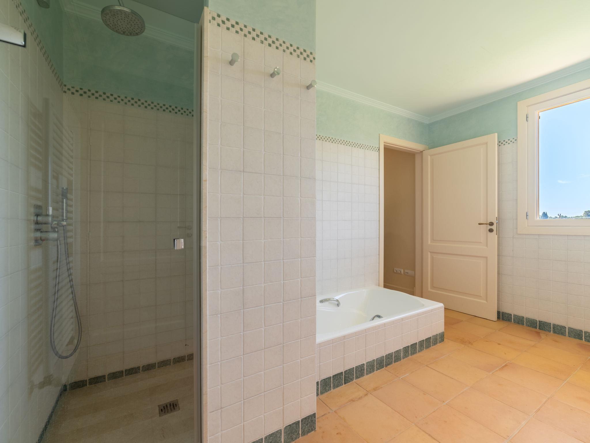 Caimari 1 km from Selva: Large, very comfortable villa "Son Maguet", built in 2010, surrounded by trees, meadows and fields. Outside the resort, 1 km from the centre of Caimari, in a quiet, sunny position on top of a hill, 100 m from the edge of the forest, 25 km from the sea, 25 km from the beach, in the countryside. Private: natural state property (fenced), large, beautiful terraced garden with lawn and trees, meadow, swimming pool angular (10 x 5 m, seasonal availability: 01.Jan. - 31.Dec.). Shower/WC in the pool area, outdoor shower, pergola, terrace, garden furniture. In the house: internet access, WiFi, storage room for bicycles, central heating system, air conditioning, washing machine. Motor access (via unmade road). Parking at the house on the premises. Grocery 700 m, supermarket, restaurant 700 m, bar 900 m, bakery 1.2 km, café 1 km, pub garden 900 m, 15 minute walk to the centre, bus stop 1 km, sandy beach 27 km pebble beach 27 km, shingle beach 27 km, rocky beach 27 km. Sports harbour 27 km, marina 27 km, golf course (18 hole) 28 km, surf school 27 m, sailing school 33 km, tennis 1 km, riding stable 4 km, sports centre 1 km, cycle lane 200 m. Please note: suitable for families, suitable for seniors. Object suitable for 12 adults groups of teenagers on request only. Loading and unloading of baggage is possible at the holiday house. Animals in the neighbourhood.