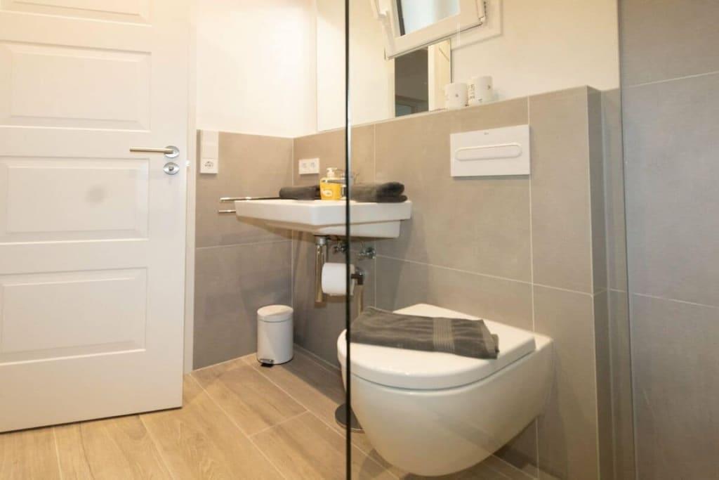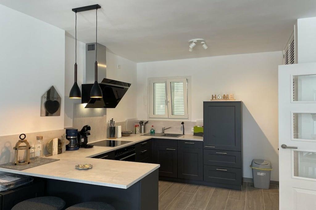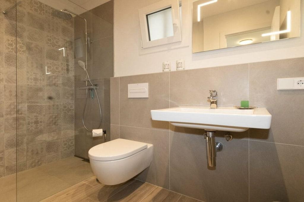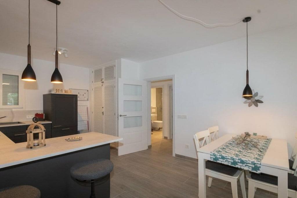 Lägenheten är cirka 80 kvadratmeter stor och har två sovrum, två badrum, ett stort vardagsrum och ett nytt, modernt kök. Det finns två balkonger i söderläge (alltid varma!) och plats för fyra personer vid matbordet, där man kan sitta ute även sent på kvällen, även utan vind. Luftkonditioneringen säkerställer en behaglig temperatur i lägenheten.