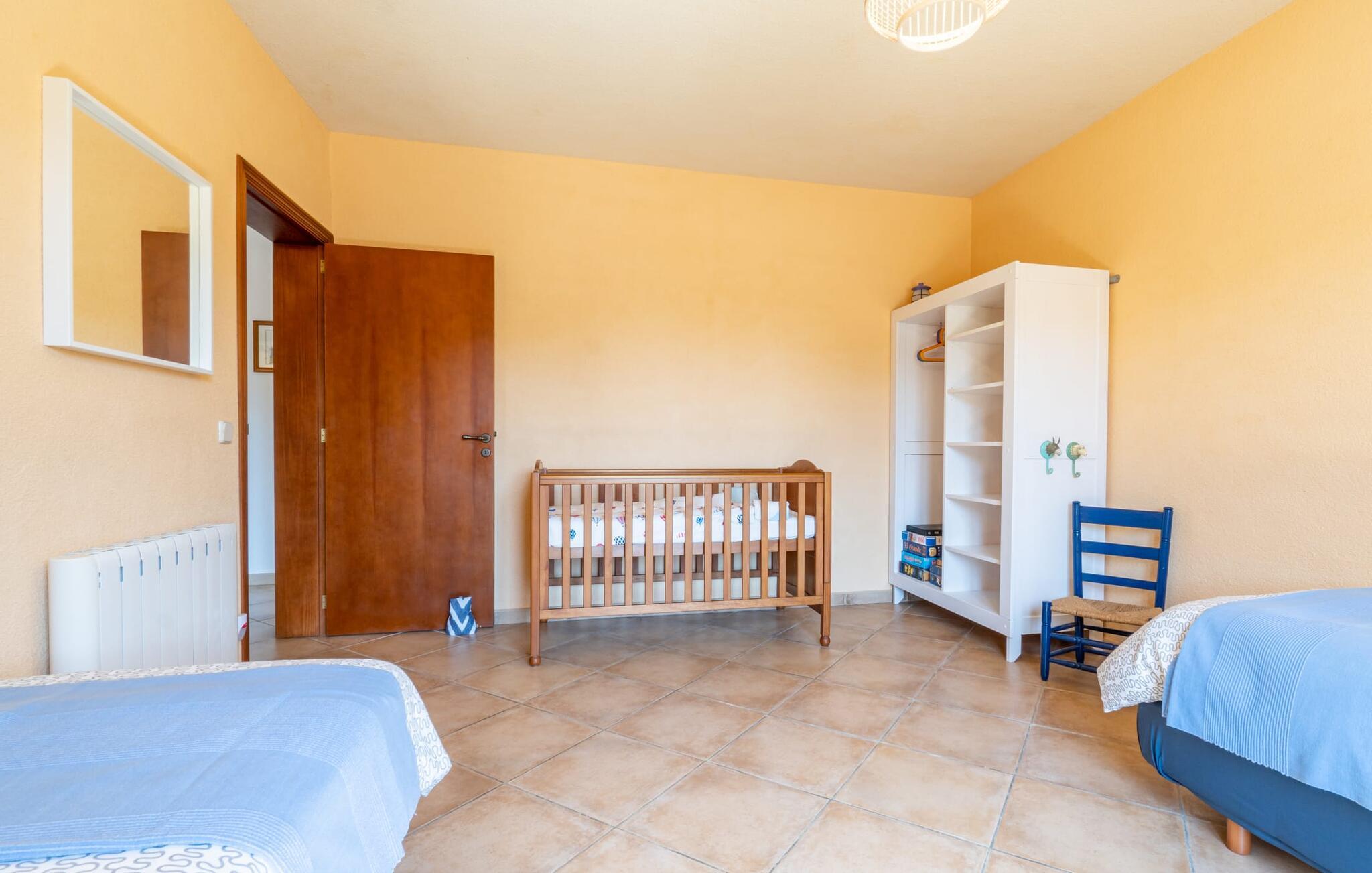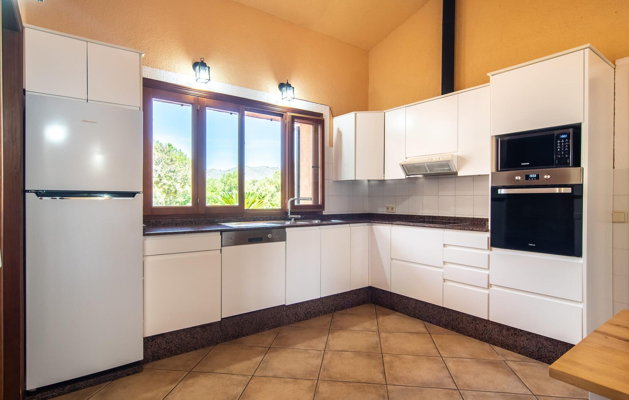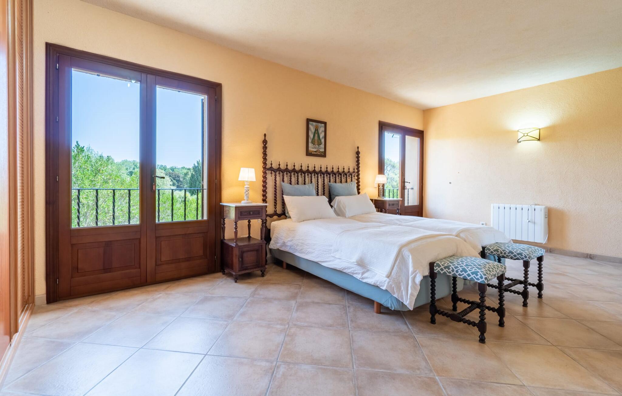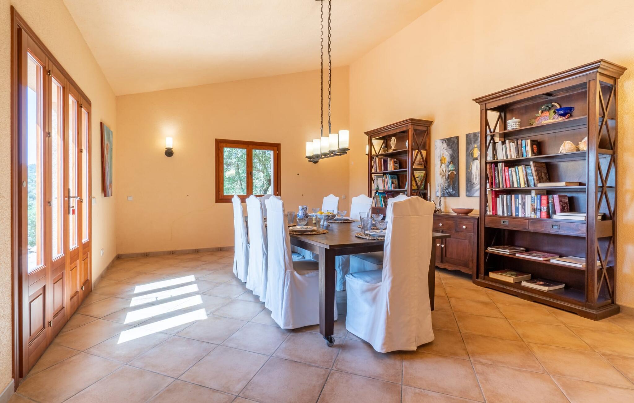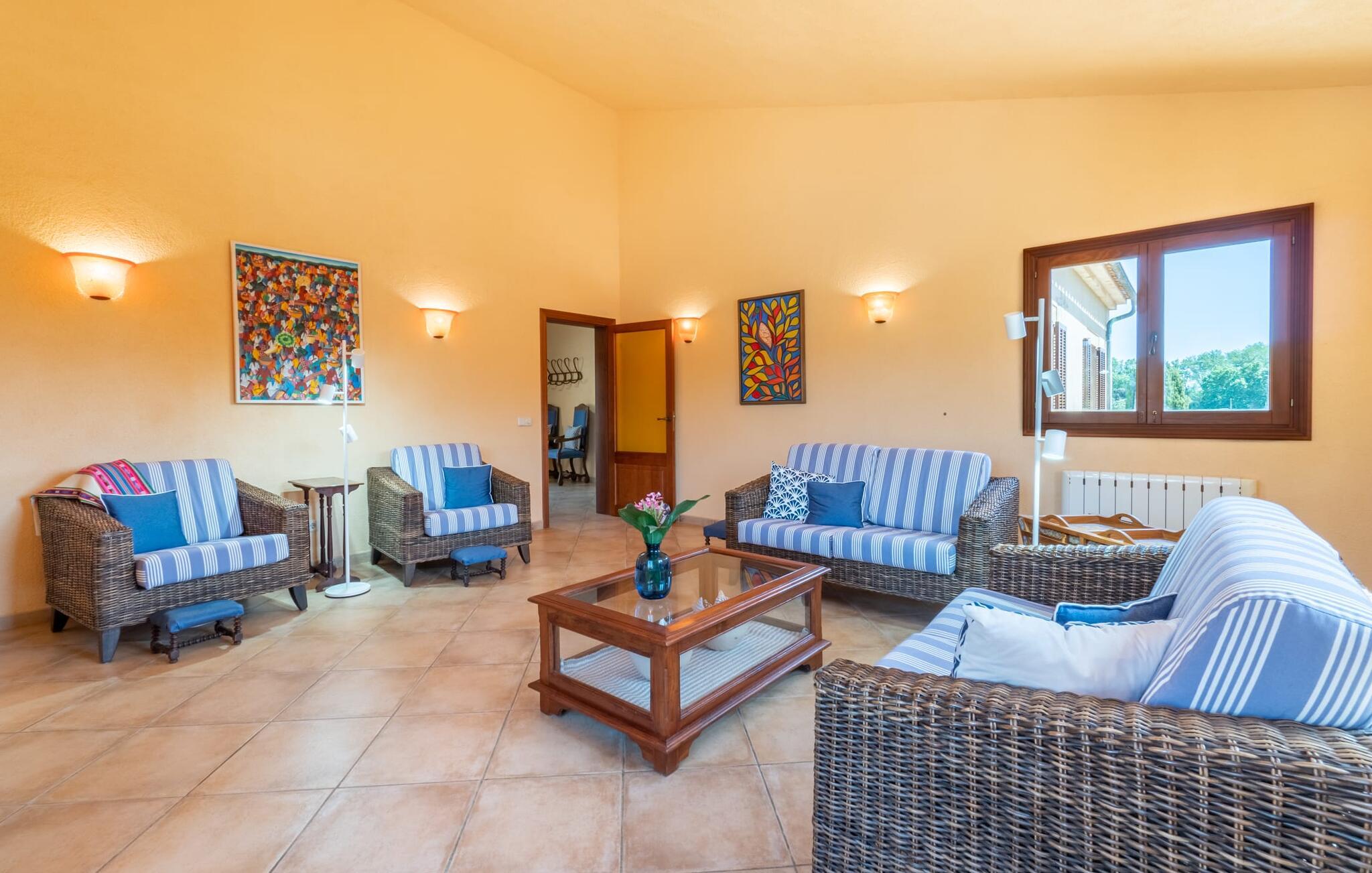Från terrassen som vetter mot poolen leder flera fönster från golv till tak direkt in i den rymliga matsalen och vardagsrummet. Den mysiga atmosfären med pastellfärgade väggar, mycket trä, eleganta möbler och färgglada accenter gör detta envåningshus riktigt inbjudande. Ljuset fyller vardagsrummen, inklusive det fullt utrustade köket, och understryker husets charm. Här finns tre bekvämt inredda sovrum, kompletterade med två badrum, vart och ett med dusch. Den vackra stora hallen välkomnar dig när du kommer in genom huvudentrén och sätter scenen för en underbar semesterupplevelse.