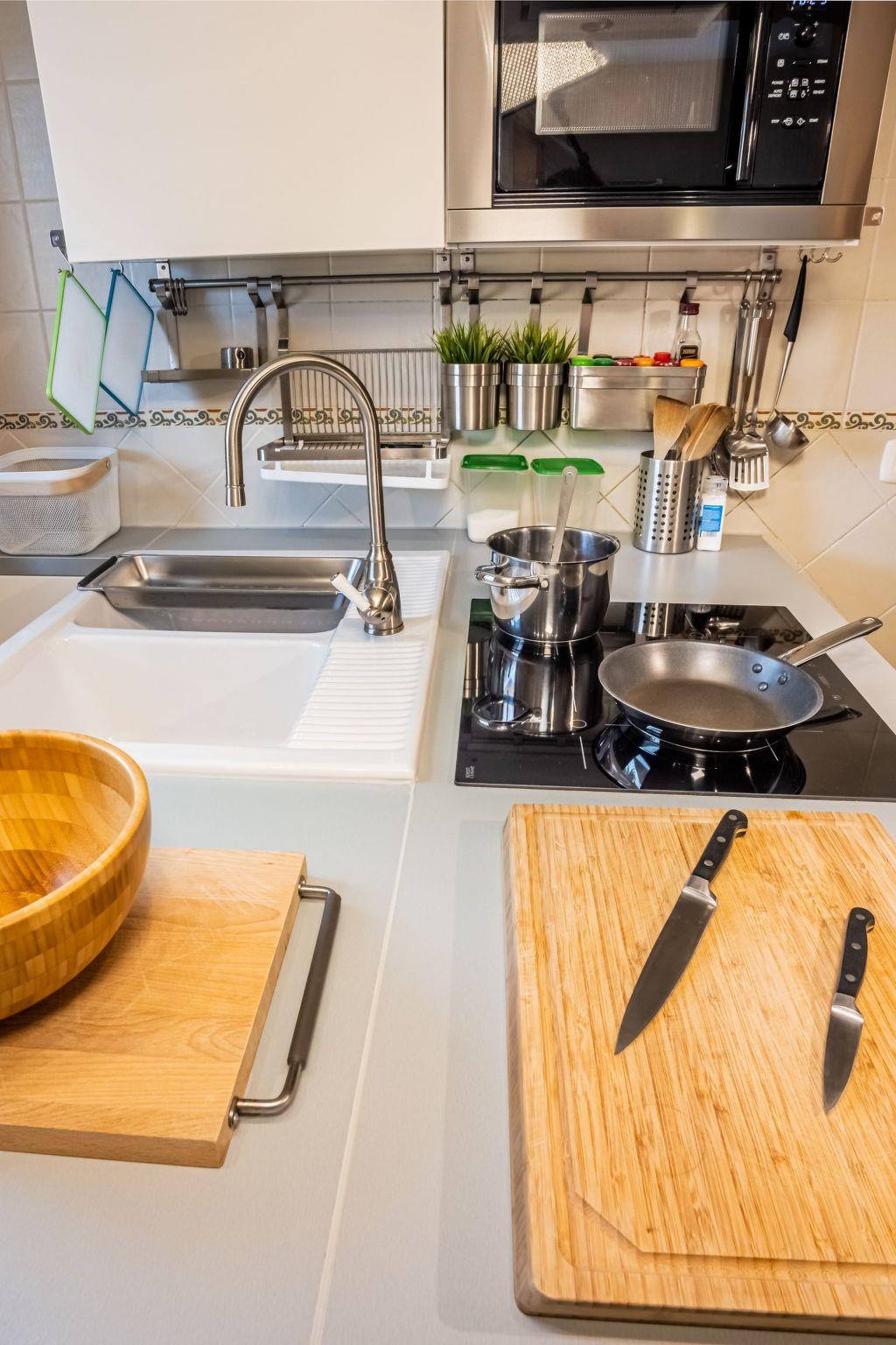 The kitchen is equipped with a dishwasher, full-size oven and 4-zone induction hob. The large free-standing fridge has 3 freezer drawers.