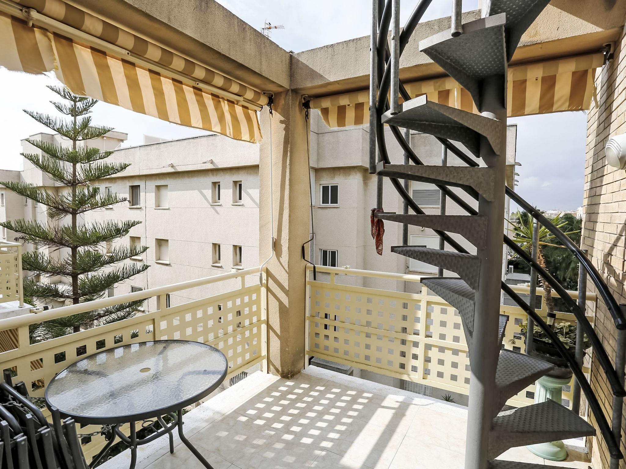 3-room penthouse 68 m2 on 3rd floor. Comfortable and modern furnishings: living/dining room with 1 sofabed, satellite TV, digital TV, hi-fi system, DVD, air conditioning and fan. Exit to the terrace. 1 room with 1 french bed, air conditioning and fan. 1 room with 2 beds and fan. Kitchen (4 hot plates, oven, dishwasher, microwave, freezer) with dining table, fan. Shower/bidet/WC. Heating, air-conditioning, forced-air heating. Terrace 32 m2, terrace 12 m2. Terrace furniture, deck chairs (5). View of the sea. Facilities: washing machine. The 32 m2 terrace is a sun terrace which is accessed by a spiral staircase leading from the terrace. HUTT-006191 // Reg. Nr.: ESFCTU00004302600014721200000000000000000HUTT-0061915