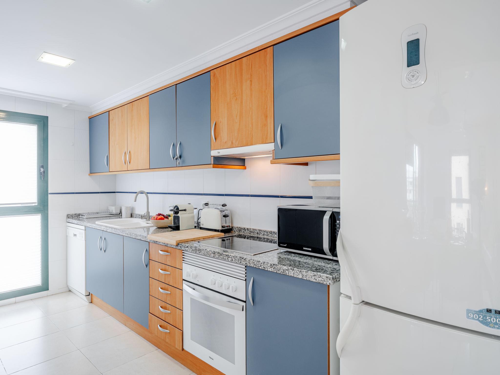 "La Darsena", 3-room apartment 88 m2. Spacious, comfortable and stylish furnishings: living/dining room with digital TV, air conditioning, fan and forced-air heating. Exit to the terrace. 1 room with 1 double bed (2 x 90 cm, length 190 cm), air conditioning and forced-air heating. 1 room with 2 beds (90 cm, length 190 cm), digital TV, air conditioning, fan and forced-air heating. Open kitchen (oven, dishwasher, 4 ceramic glass hob hotplates, toaster, kettle, microwave, freezer, electric coffee machine, Capsules for coffee machine (Nespresso) extra). Bath/bidet/WC. Large terrace. Terrace furniture. Beautiful view. Facilities: washing machine, iron, hair dryer. Internet (WiFi, free). Garage space n 6. Please note: TV only ES. CV-VUT0491706-A // Reg. Nr.: ESFCTU0000030550005773010000000000000CV-VUT0491706-A8