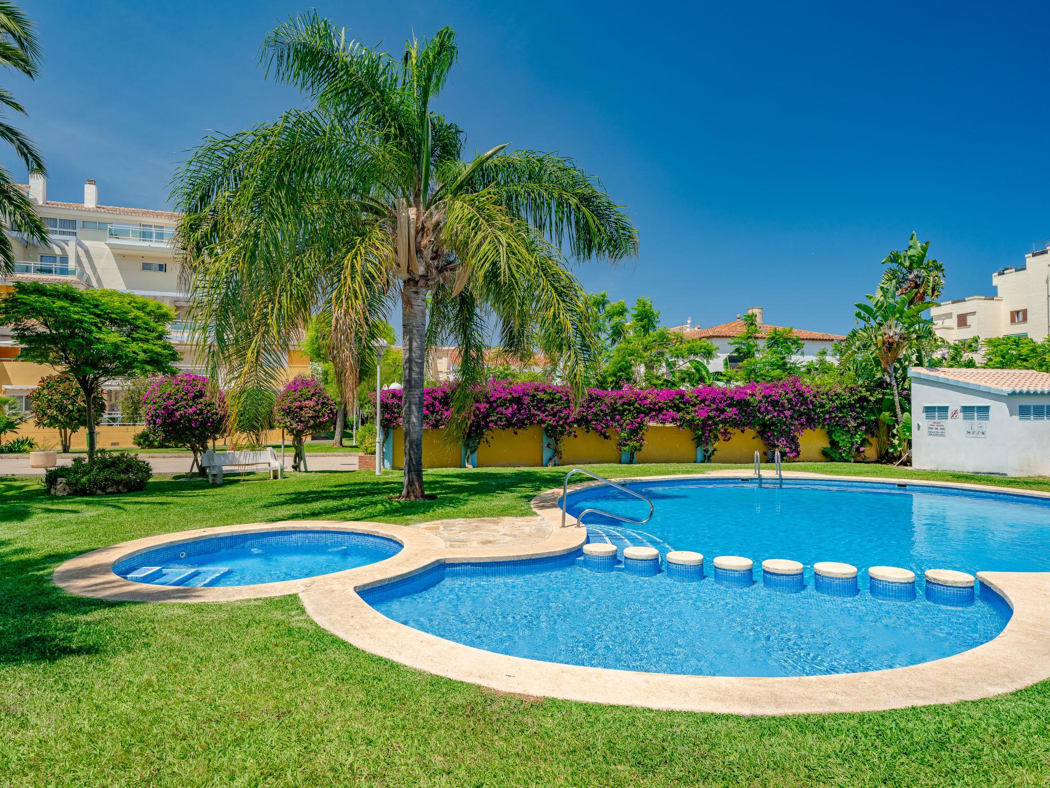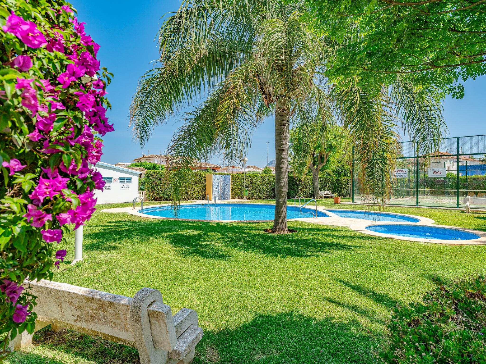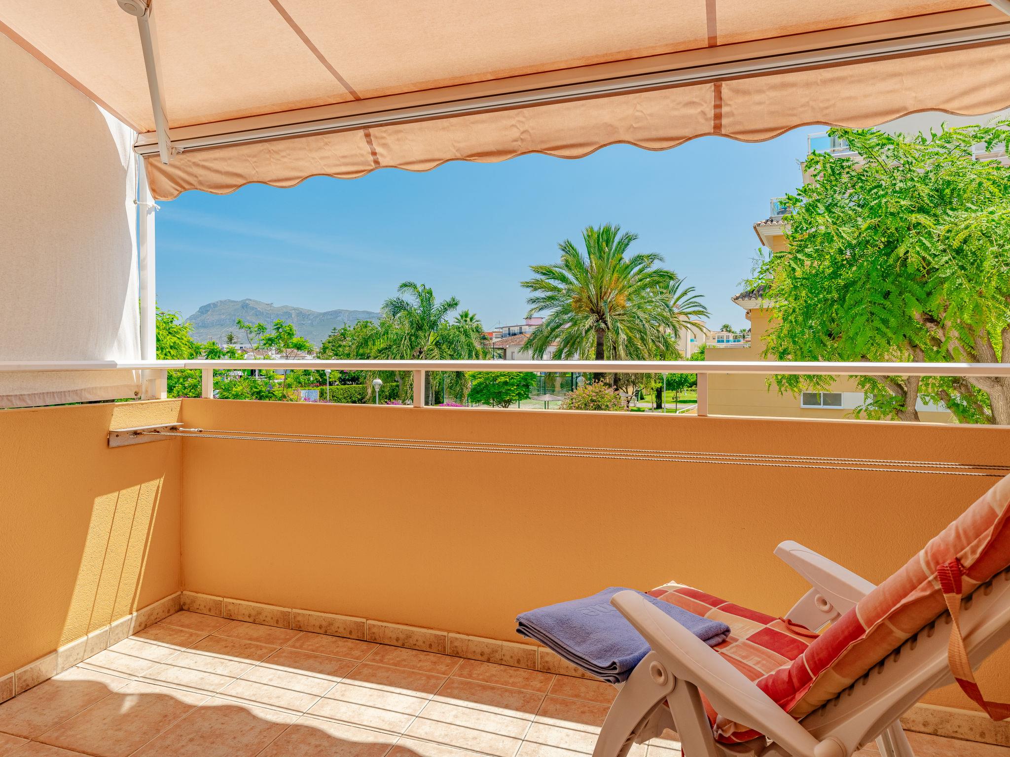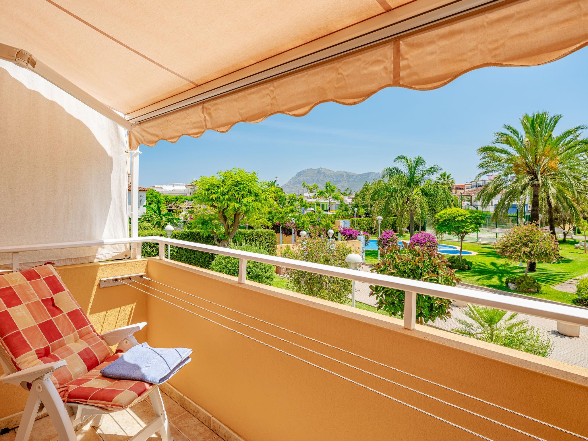 "Denia Dream II", 3-room apartment 80 m2. Spacious, simple and beautiful furnishings: living/dining room with digital TV. Exit to the terrace. 1 room with 1 french bed (135 cm, length 190 cm), bath/WC. Exit to the terrace. 1 room with 2 beds (90 cm, length 190 cm). Kitchen (oven, 4 ceramic glass hob hotplates, toaster, kettle, microwave, freezer, electric coffee machine). Shower/WC. Large terrace. Terrace furniture. Beautiful view of the swimming pool and the garden. Facilities: washing machine, iron, hair dryer. Parking space n 29. Please note: TV only ES. R00000001