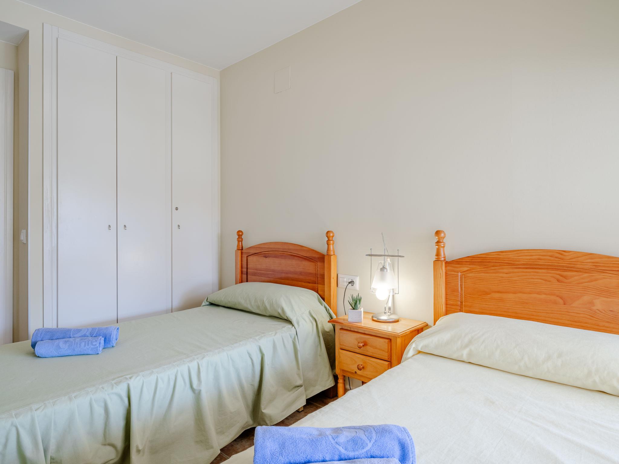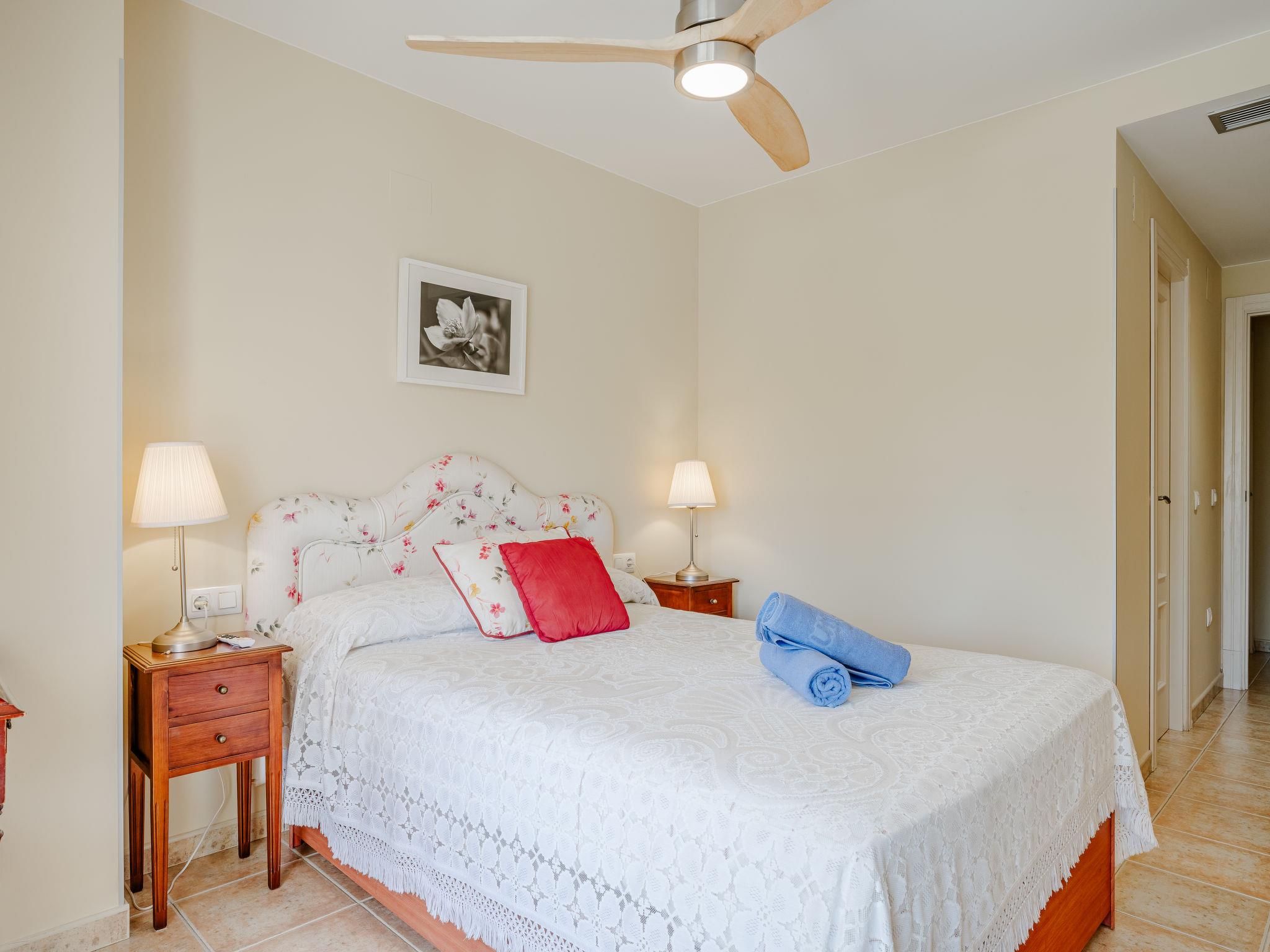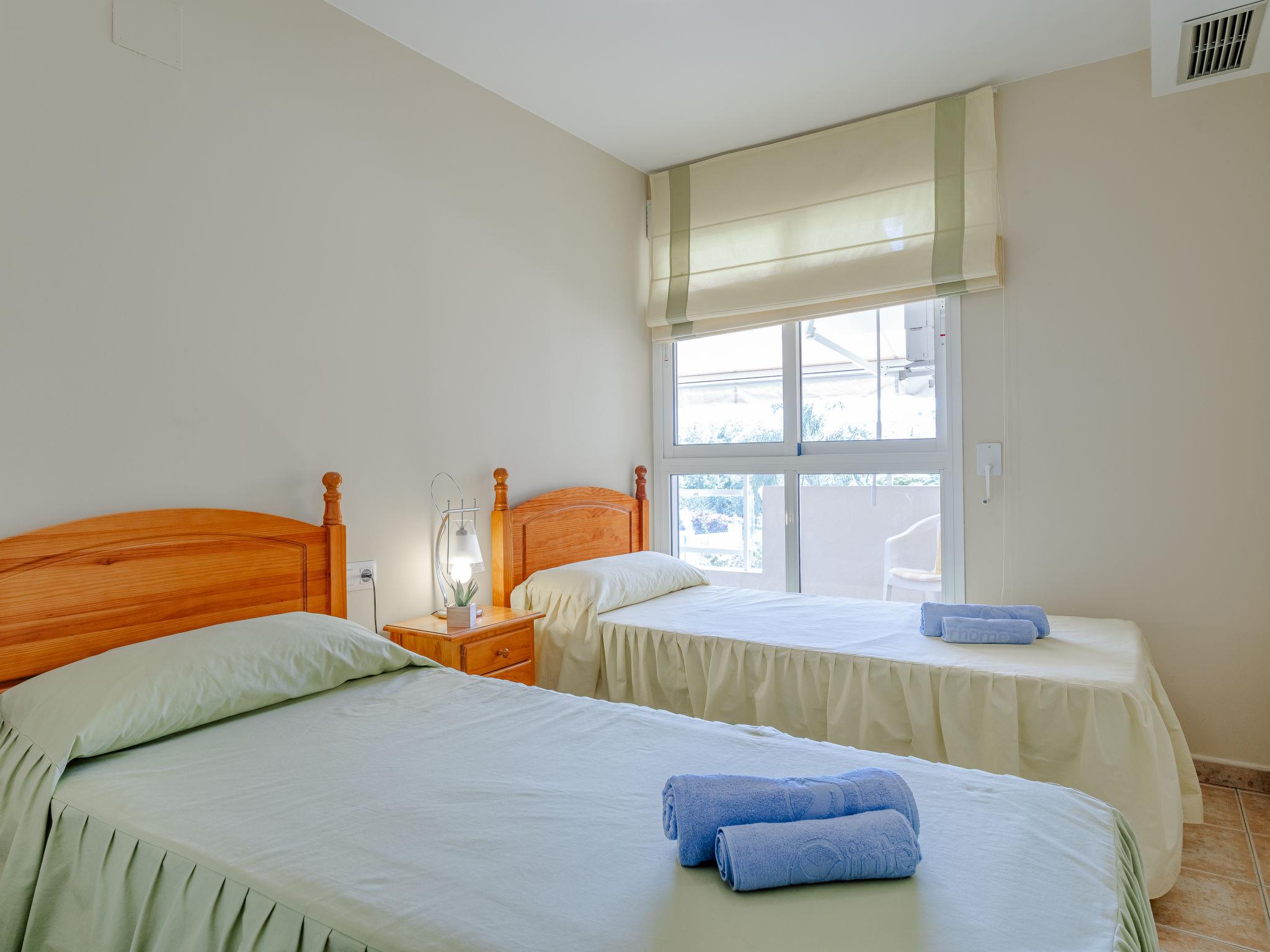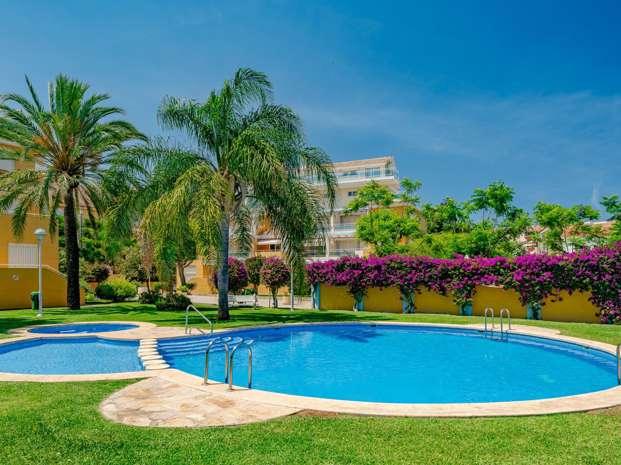 "Denia Dream II", 3-room apartment 80 m2. Spacious, simple and beautiful furnishings: living/dining room with digital TV. Exit to the terrace. 1 room with 1 french bed (135 cm, length 190 cm), bath/WC. Exit to the terrace. 1 room with 2 beds (90 cm, length 190 cm). Kitchen (oven, 4 ceramic glass hob hotplates, toaster, kettle, microwave, freezer, electric coffee machine). Shower/WC. Large terrace. Terrace furniture. Beautiful view of the swimming pool and the garden. Facilities: washing machine, iron, hair dryer. Parking space n 29. Please note: TV only ES. R00000001