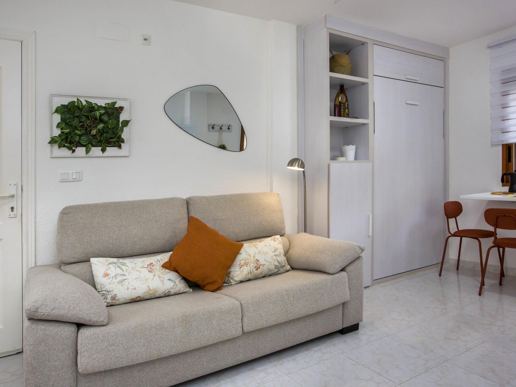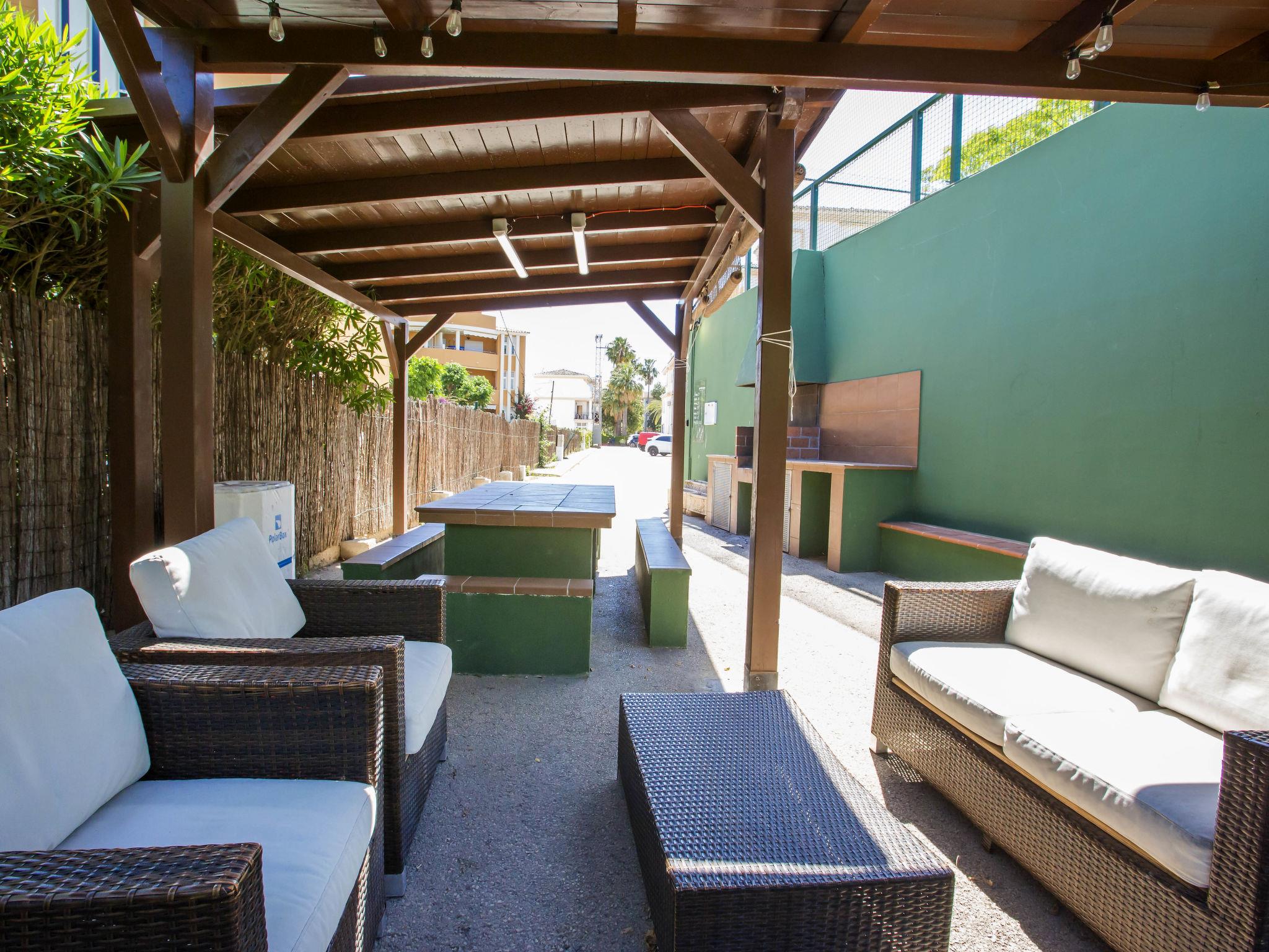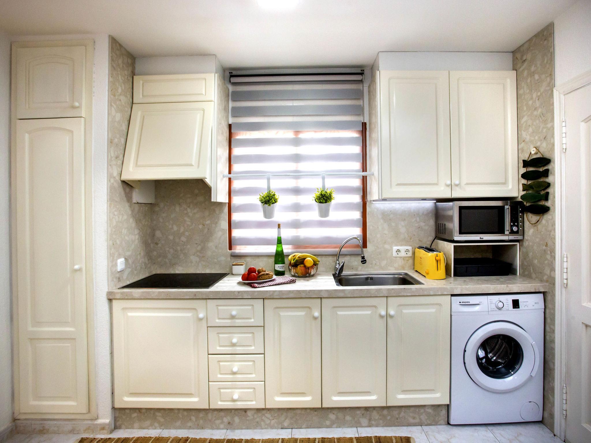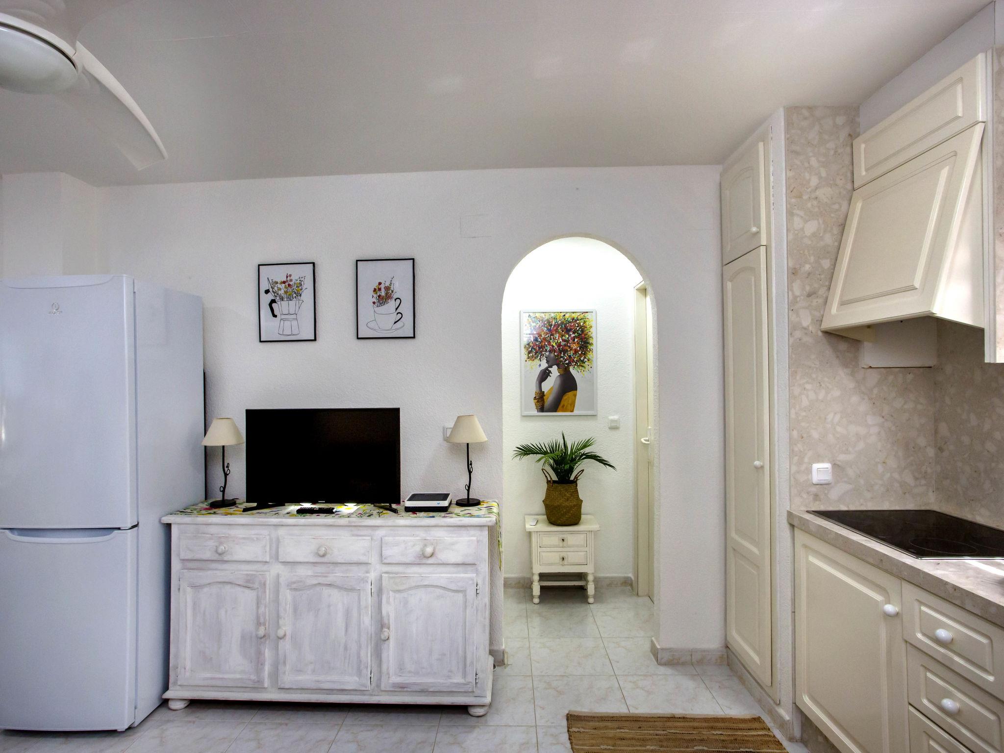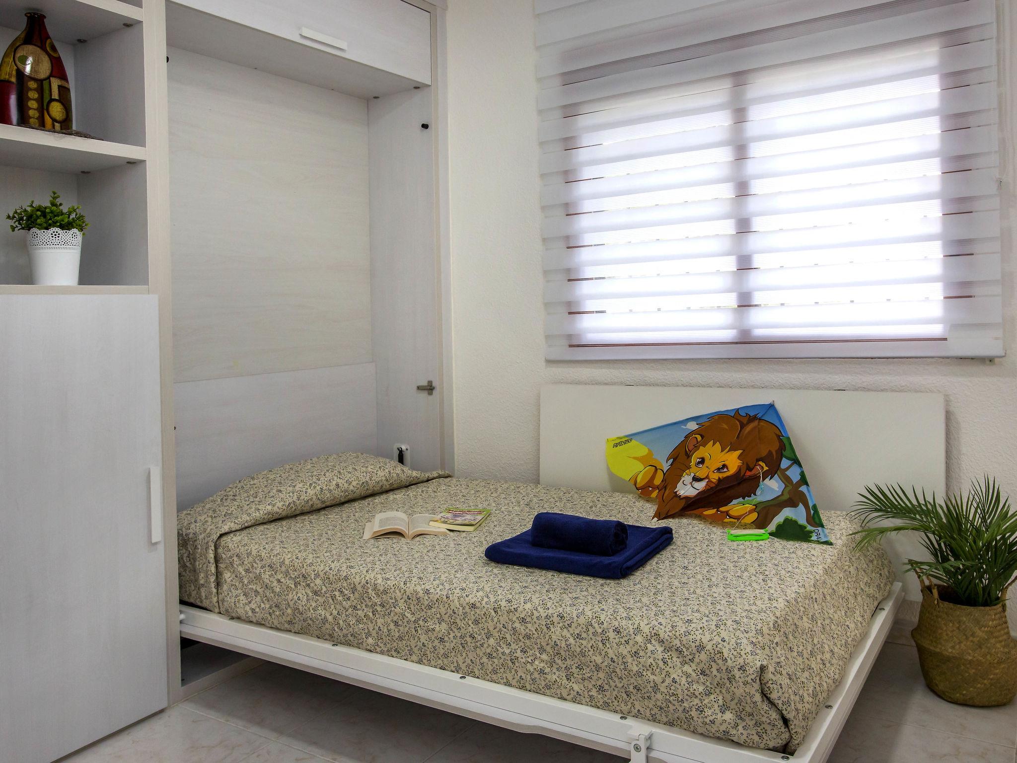 "El Patio", 2-room apartment 50 m2. Renovated in 2024, beautiful and cosy furnishings: living/dining room with 1 sofabed (135 cm, length 190 cm), digital TV, air conditioning, fan and forced-air heating. Exit to the patio, to the swimming pool. 1 room with 2 beds (105 cm, length 200 cm), fan. Open kitchen (3 ceramic glass hob hotplates, toaster, kettle, microwave, freezer, electric coffee machine). Shower/WC. No heating option. Terrace. Terrace furniture. Facilities: washing machine, iron, hair dryer. Internet (WiFi, free). Parking. Please note: TV only ES. CV-VUT0515177-A