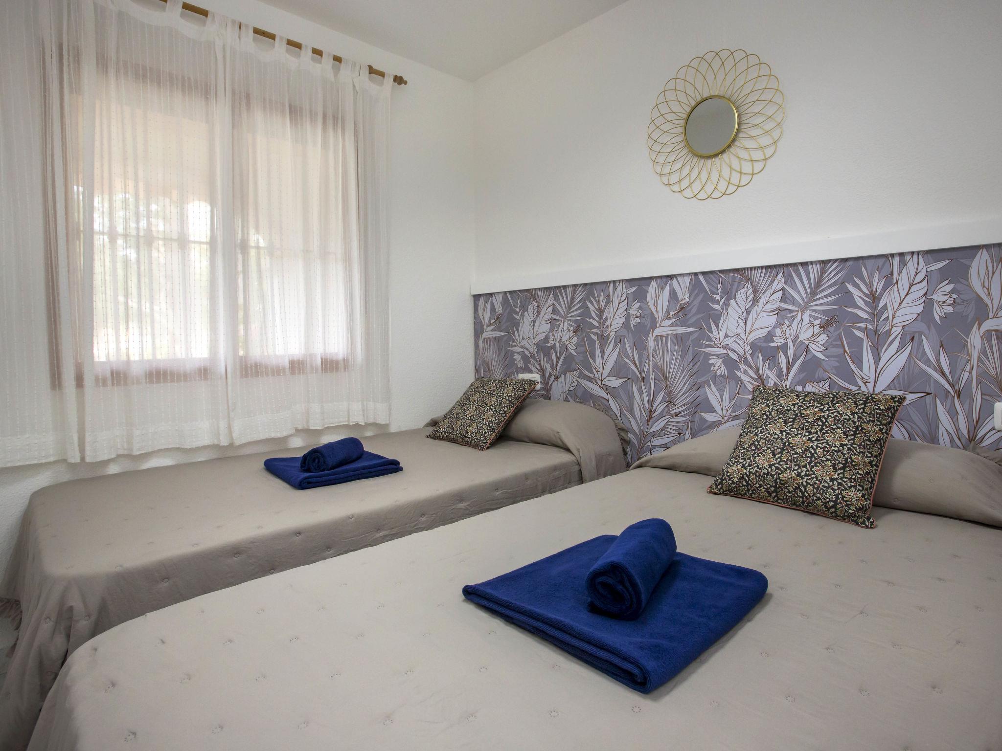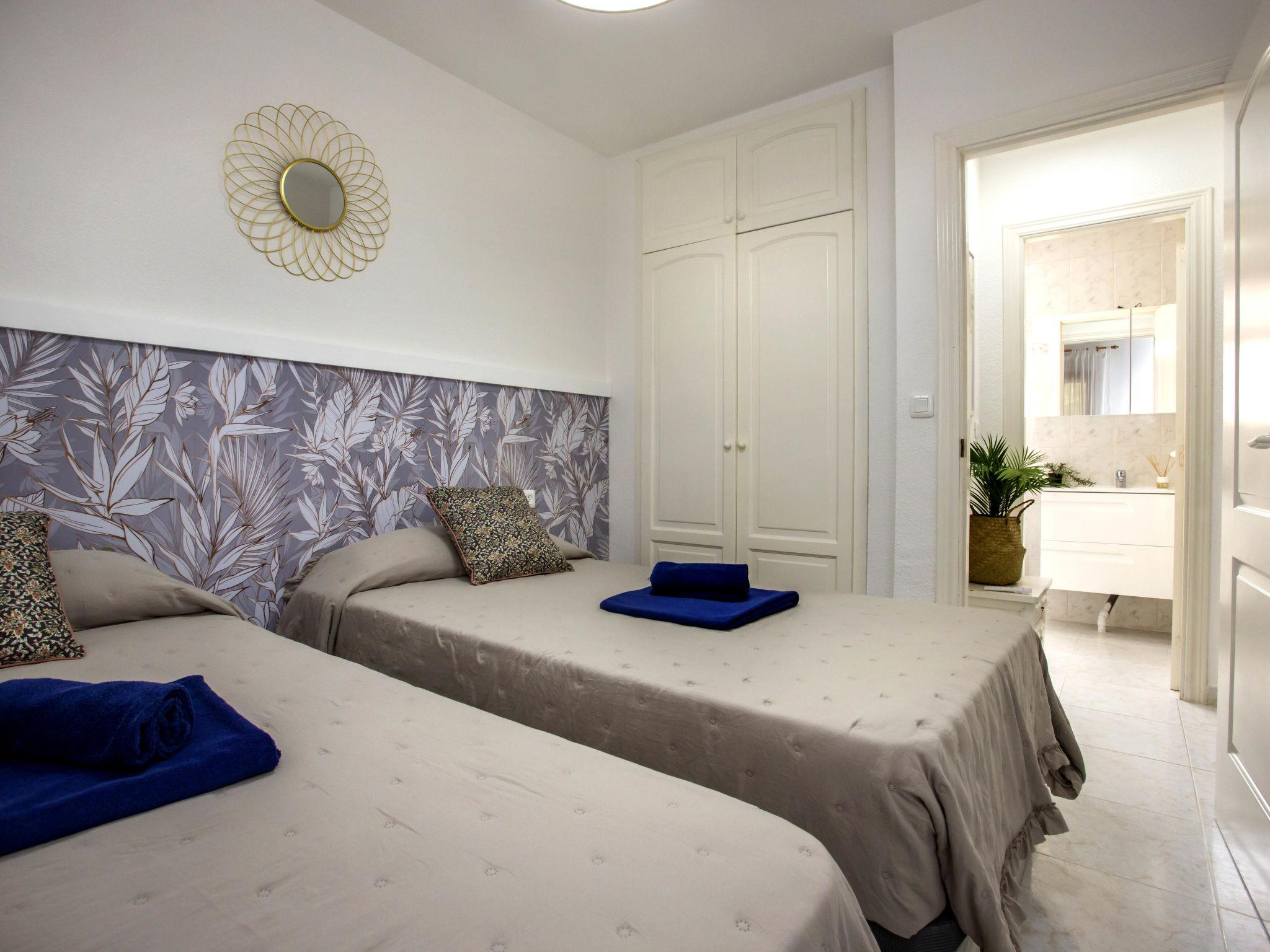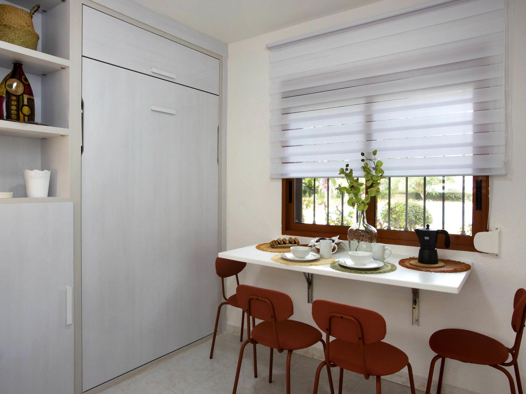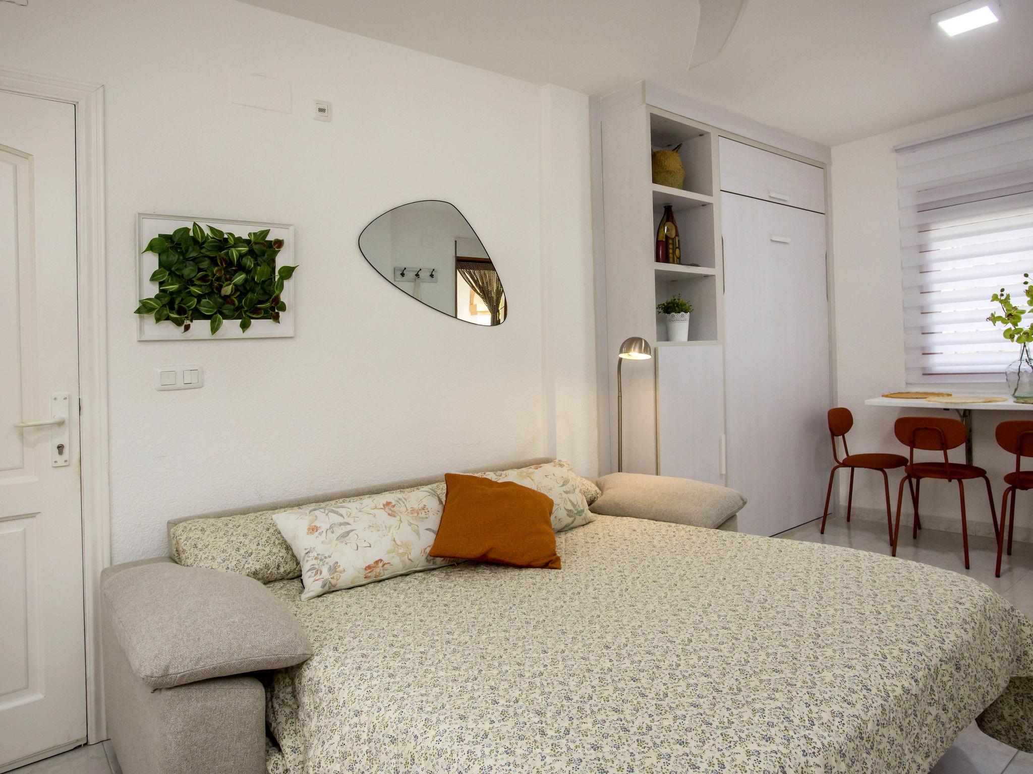 "El Patio", 2-room apartment 50 m2. Renovated in 2024, beautiful and cosy furnishings: living/dining room with 1 sofabed (135 cm, length 190 cm), digital TV, air conditioning, fan and forced-air heating. Exit to the patio, to the swimming pool. 1 room with 2 beds (105 cm, length 200 cm), fan. Open kitchen (3 ceramic glass hob hotplates, toaster, kettle, microwave, freezer, electric coffee machine). Shower/WC. No heating option. Terrace. Terrace furniture. Facilities: washing machine, iron, hair dryer. Internet (WiFi, free). Parking. Please note: TV only ES. CV-VUT0515177-A