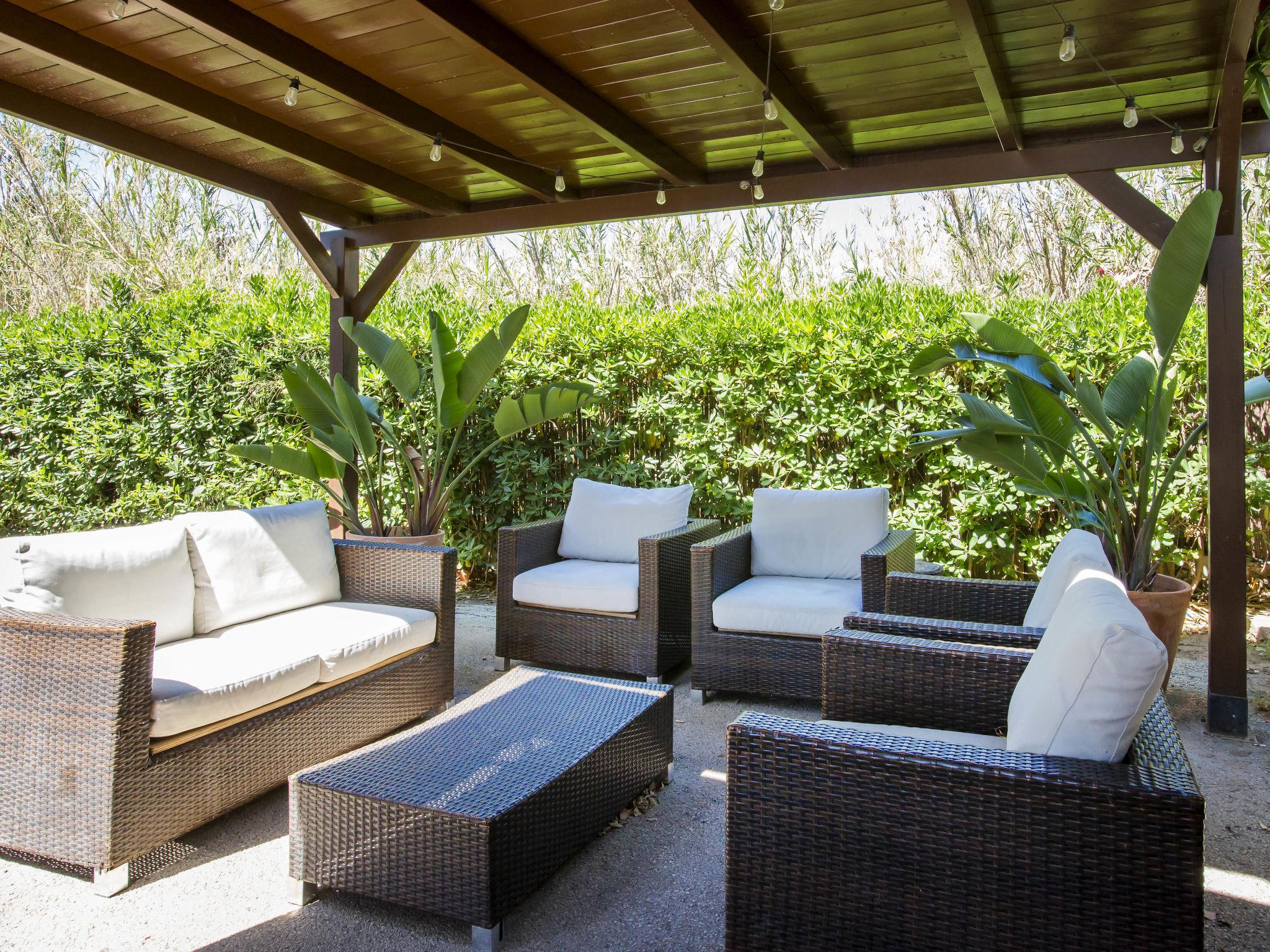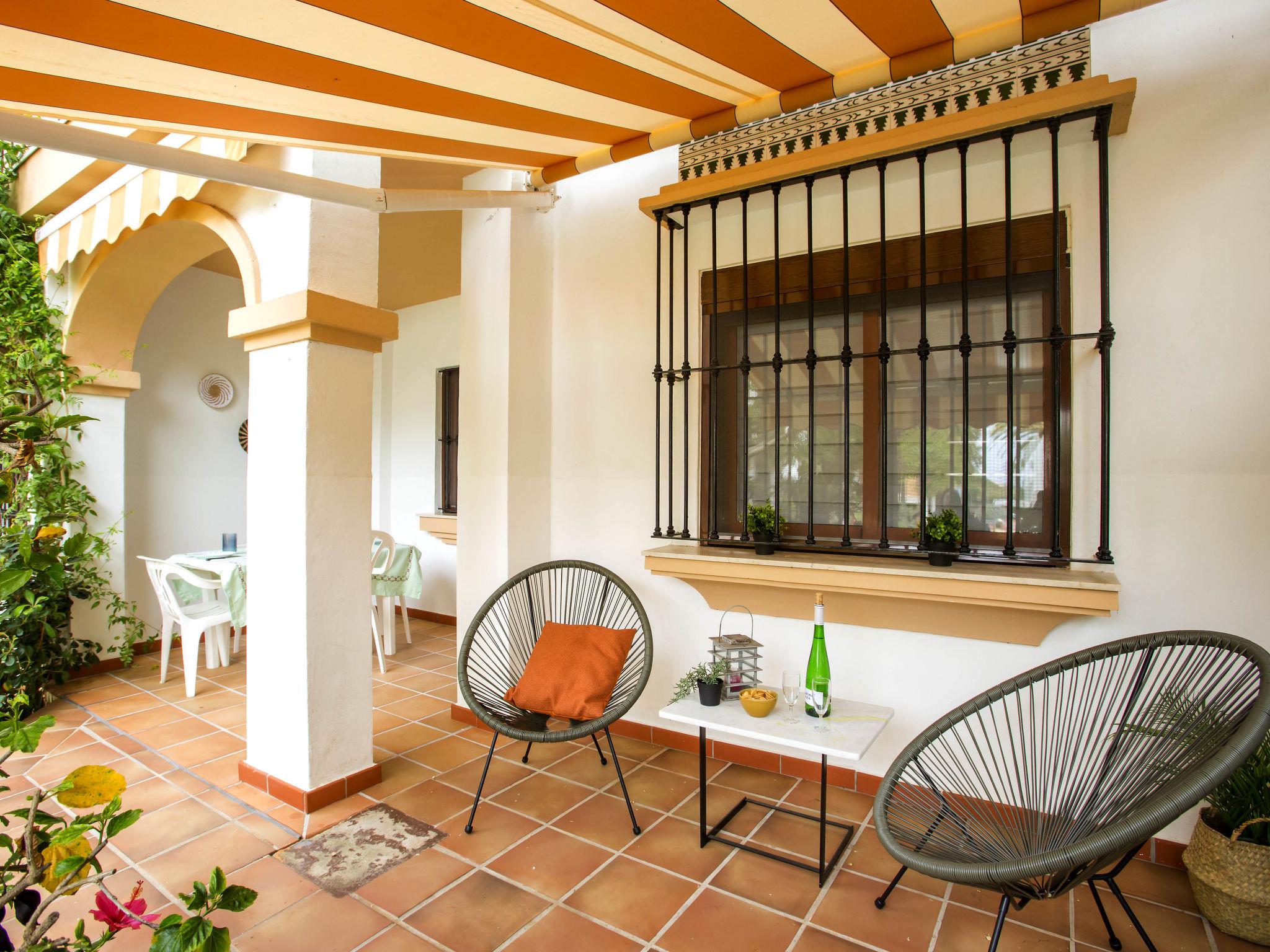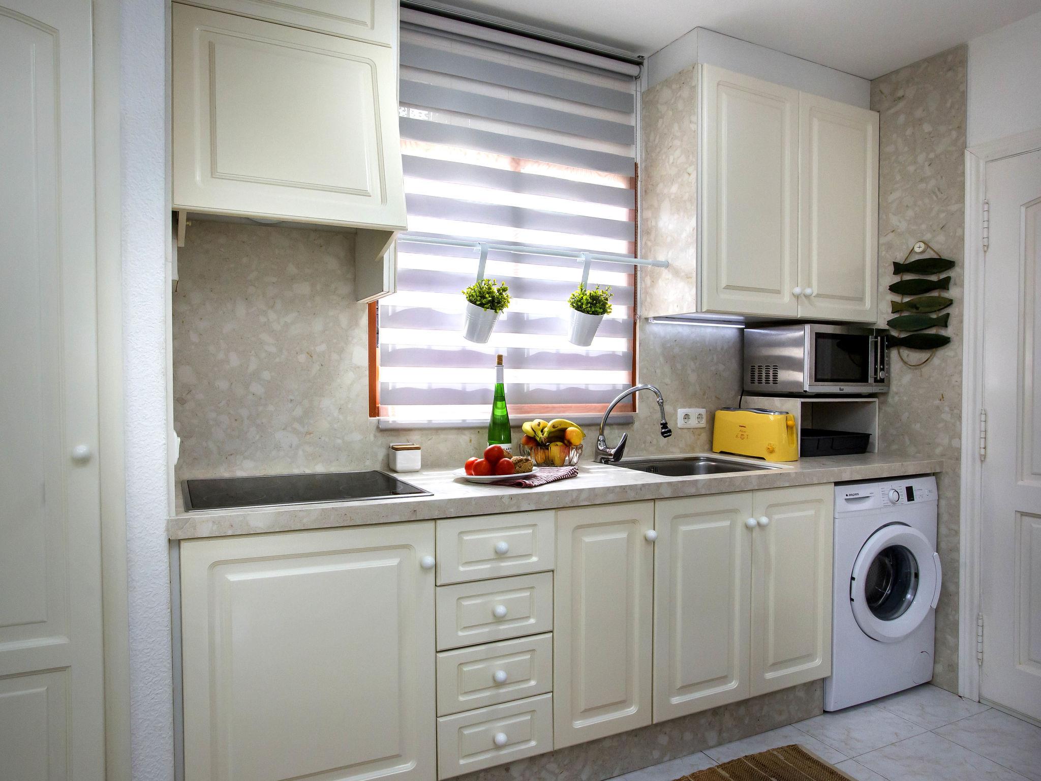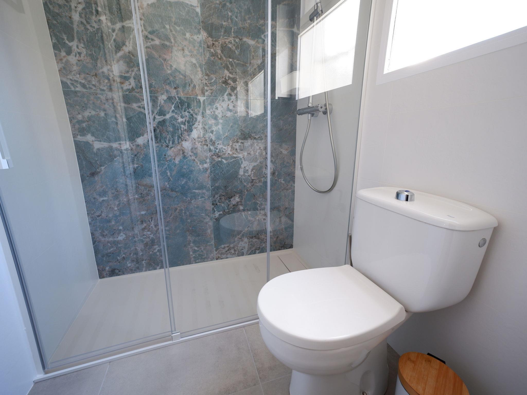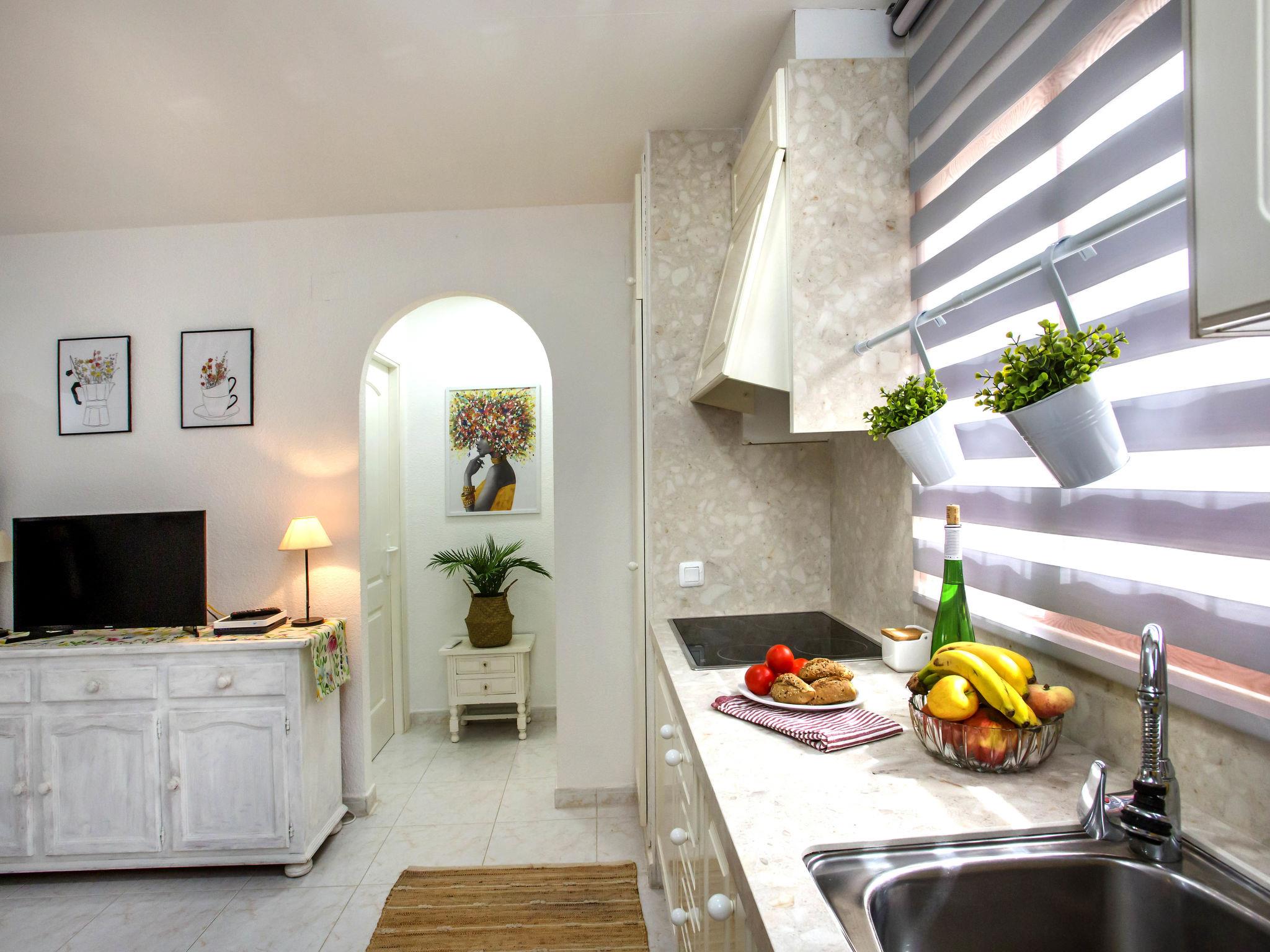 "El Patio", 2-room apartment 50 m2. Renovated in 2024, beautiful and cosy furnishings: living/dining room with 1 sofabed (135 cm, length 190 cm), digital TV, air conditioning, fan and forced-air heating. Exit to the patio, to the swimming pool. 1 room with 2 beds (105 cm, length 200 cm), fan. Open kitchen (3 ceramic glass hob hotplates, toaster, kettle, microwave, freezer, electric coffee machine). Shower/WC. No heating option. Terrace. Terrace furniture. Facilities: washing machine, iron, hair dryer. Internet (WiFi, free). Parking. Please note: TV only ES. CV-VUT0515177-A