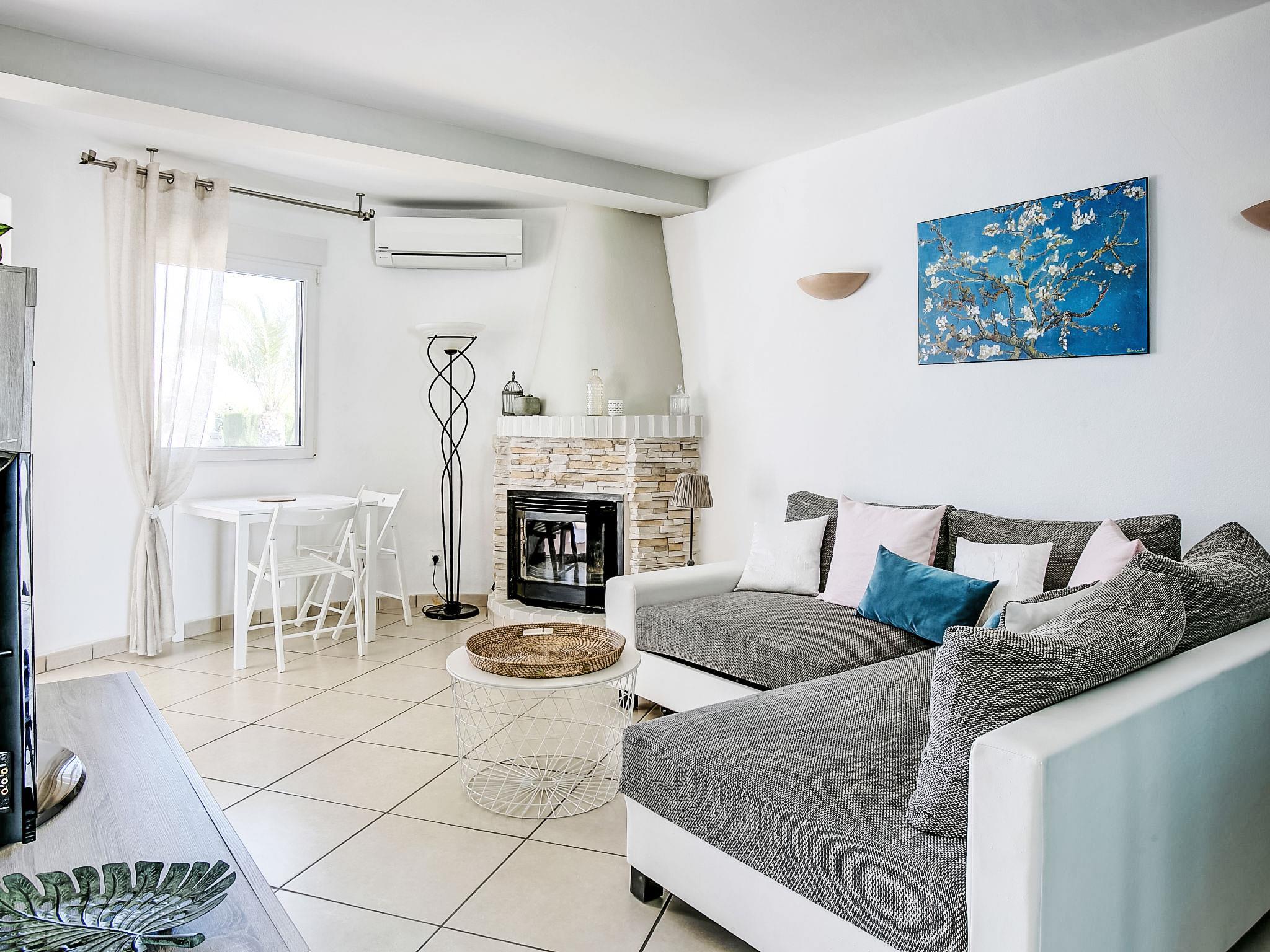 "Las Estancias", 3-room bungalow 63 m2. Spacious and bright, very comfortable and cosy furnishings: living/dining room with satellite TV, digital TV, air conditioning and forced-air heating. 1 room with 1 french bed (150 cm, length 190 cm), electric heater. Exit to the terrace. 1 room with 2 beds (90 cm, length 190 cm), electric heater. Exit to the patio, to the swimming pool. Open kitchen (oven, dishwasher, 4 ceramic glass hob hotplates, toaster, kettle, microwave, freezer, electric coffee machine). Bath/WC. Terrace, south facing position, patio, north-east facing position. Terrace furniture. Facilities: washing machine, iron, hair dryer. Internet (WiFi, free). Please note: non-smoking house. AT-469279-A // Reg. Nr.: ESFCTU00000304500026878100000000000000000AT-469279-A9