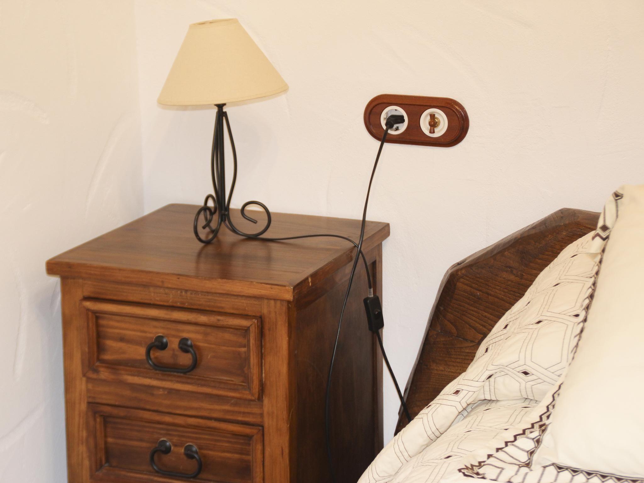 There are a total of three bedrooms at your disposal, one of which is equipped with a double bed (1.50 m x 2.00 m) and air conditioning. The second bedroom has two single beds (0.90m x 2.00m each) and the third has a 1.35m x 1.90m bed. There are also two bathrooms, each with a shower, washbasin and toilet. The thick walls of the house guarantee a pleasant climate all year round. In summer it is pleasantly cool and in winter the heat is stored. In the living room there is a heater and a fireplace for warmth in winter. The spacious living room has sofas, a fireplace, a flat screen TV with satellite channels, a DVD player and a stereo. Next to it is the fully equipped kitchen, which in addition to a dining table for shared meals, is also equipped with a gas cooker, oven, fridge, microwave and coffee machine. A separate laundry room with washing machine, tumble dryer and drying rack is also available. Free Wi-Fi, as well as bed linen, towels and firewood in winter (for a fee) complete the offer.