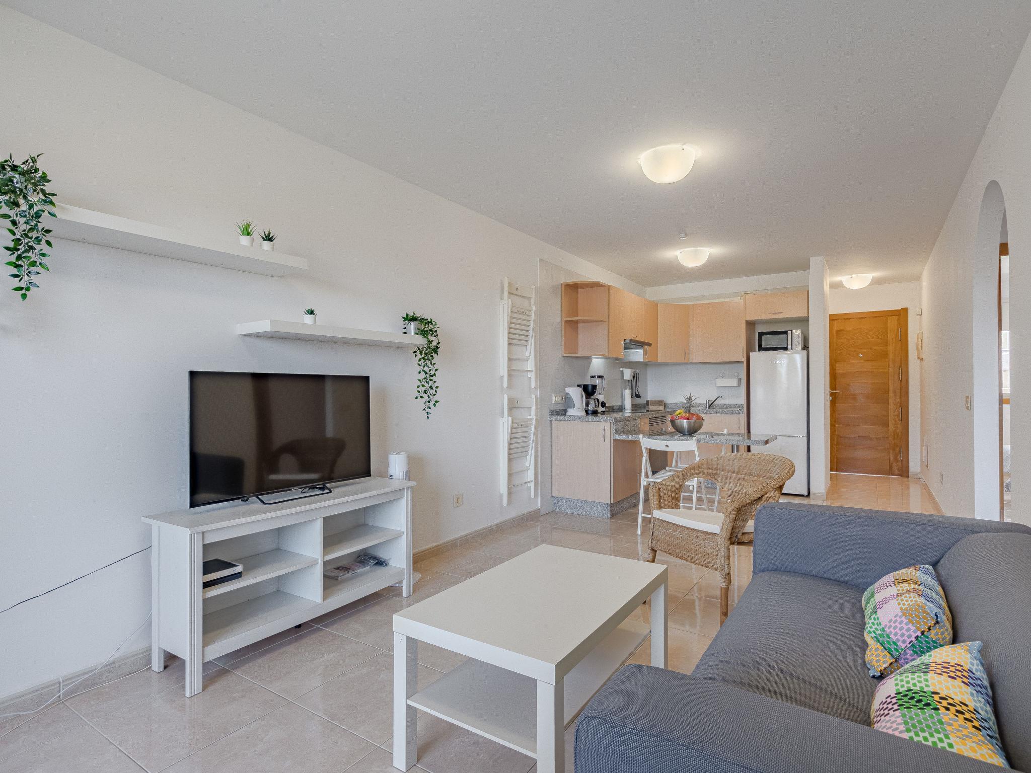"La Perla", 4-room apartment 66 m2 on 1st floor. Object suitable for 4 adults. Spacious, practical furnishings: living/dining room with digital TV, flat screen and fan. Exit to the terrace. 1 room with 1 french bed (140 cm, length 200 cm). 1 double bedroom with 2 beds (90 cm, length 200 cm). Open kitchen (oven, 4 ceramic glass hob hotplates, toaster, kettle, microwave, freezer, electric coffee machine) with bar, boiler (50 litres). Bath/bidet/WC. No heating option. Terrace 11 m2. Terrace furniture, box-room. Partial view of the sea. Facilities: washing machine, iron, children's high chair, baby cot for up to 2 year olds, hair dryer. Internet (WiFi, free). Parking space n 94 (roofed, 1 car). Please note: suitable for families. Non-smokers only. TV only ES. Smoke alarm. VV-38-4-0107918 // Reg. Nr.: ESFCTU0000380170007890810000000000000VV-38-4-01079180