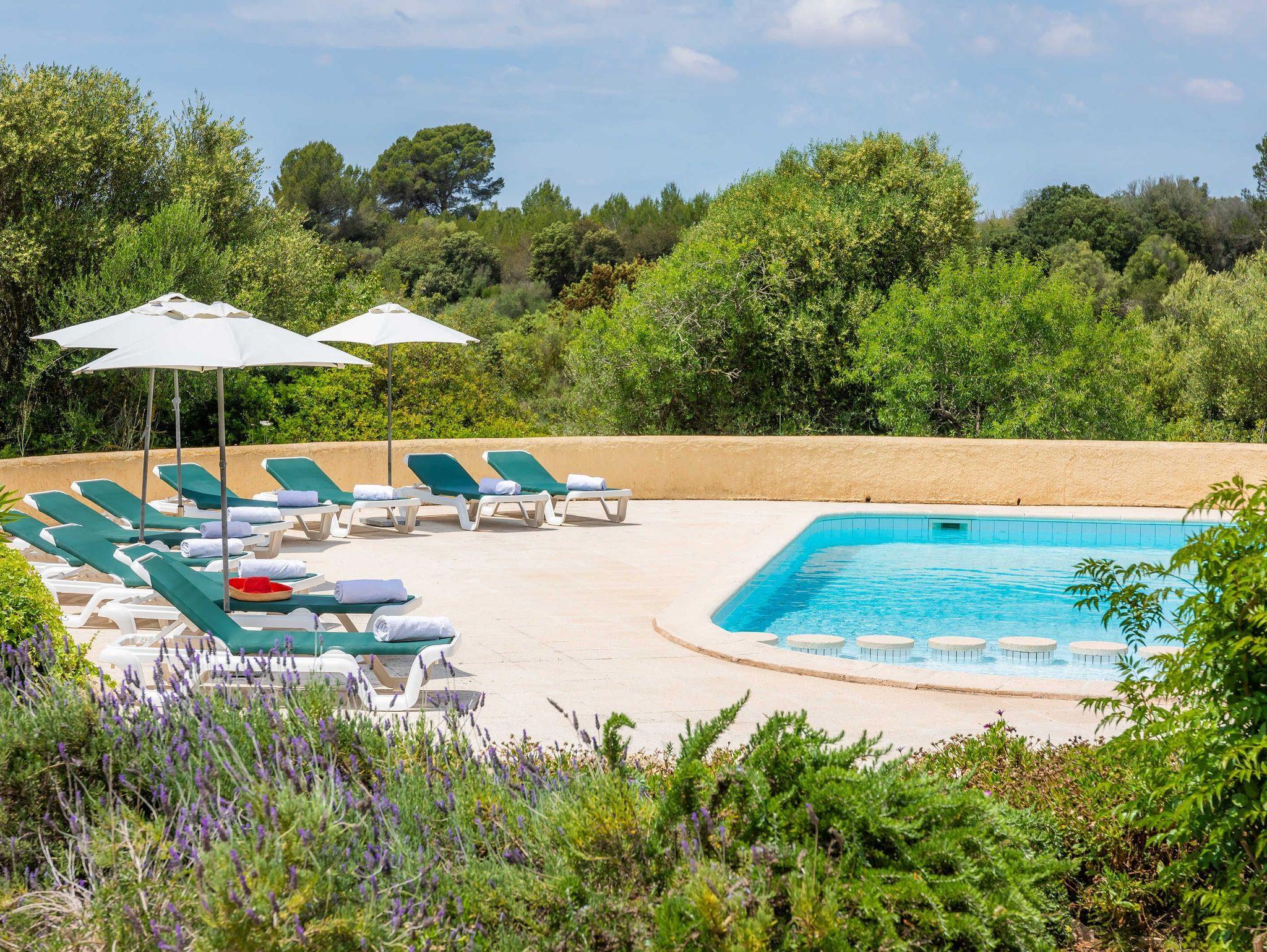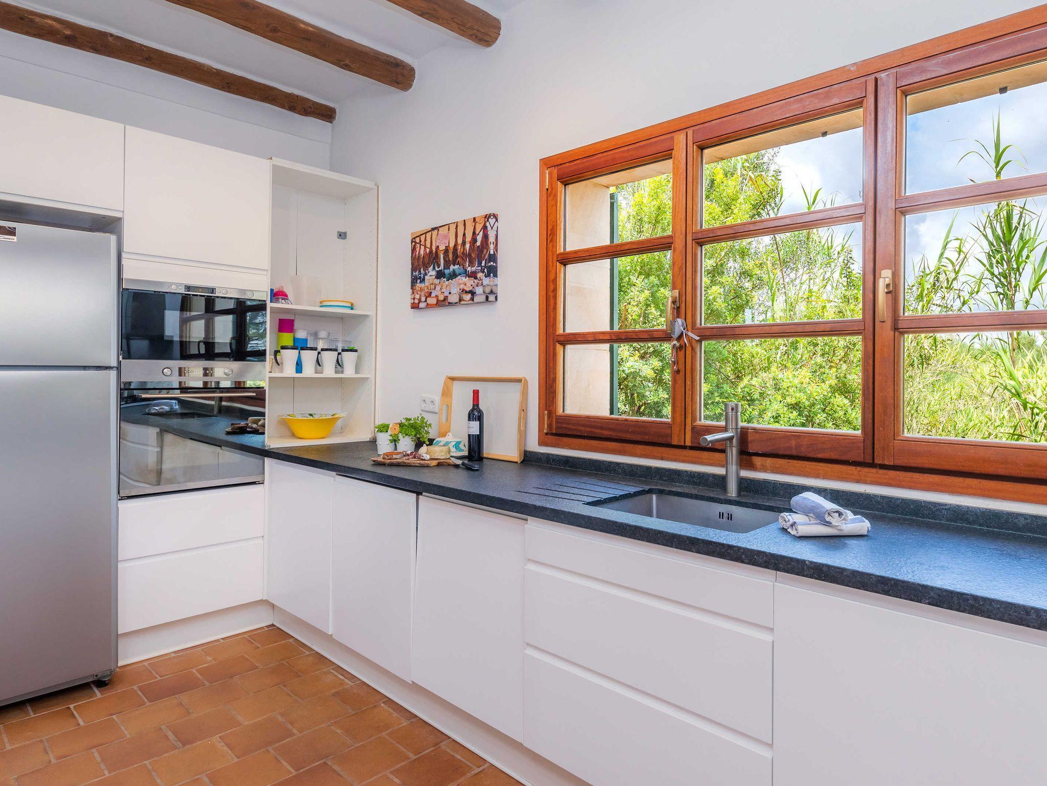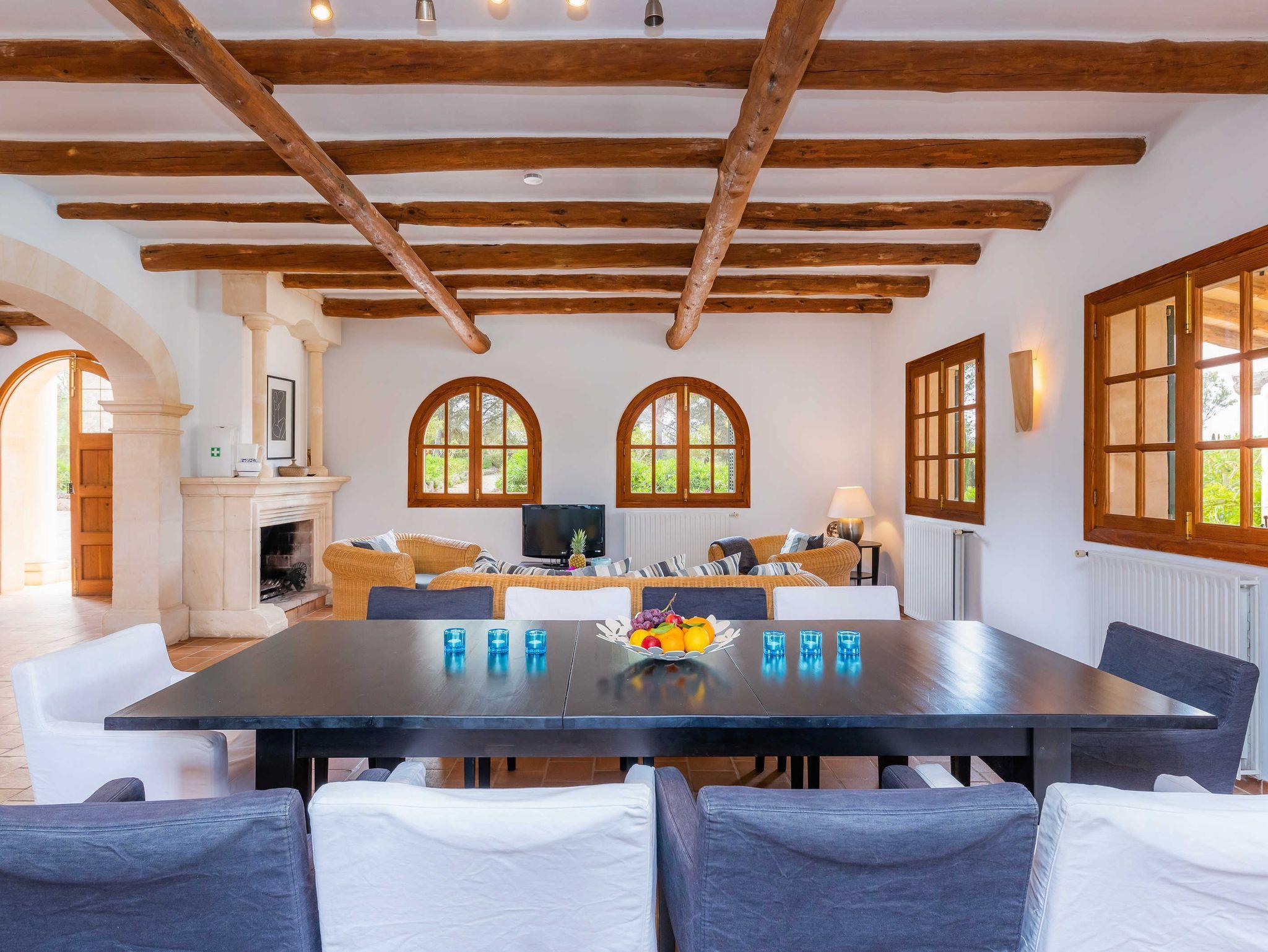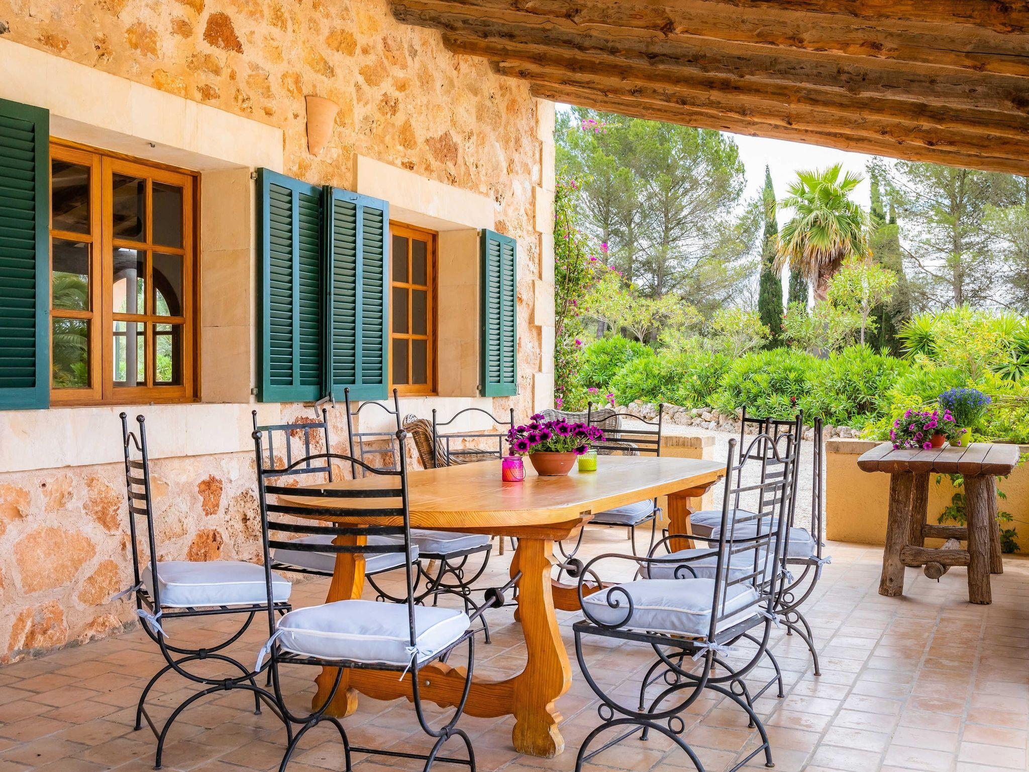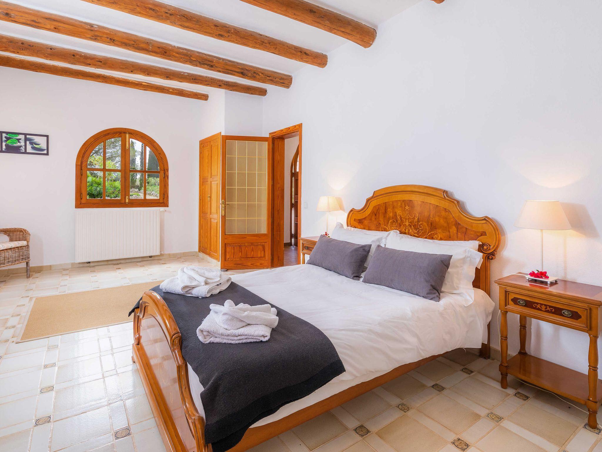 Großzügige Finca mit Pool und kostenloser Klimaanlage in schöner Alleinlage und gepflegtem Garten für 10 Personen + 2 Kinder. Neben dem gemütlichen Wohnzimmer mit Kamin, einem großen Essbereich und moderner Küche mit Zugang zur Terrasse mit Grillbereich befinden sich im Erdgeschoss zwei große Schlafzimmer und ein geräumiges Badezimmer. Hier gibt es auch Zugang zu einer weiteren Terrasse mit Tischtennisplatte. Im ersten Stock befinden sich zwei weitere Schlafzimmer mit Zugang zur Terrasse und zwei Badezimmer mit Dusche. Auf der gleichen Ebene ist die Mastersuite mit wunderbarem Ausblick, ausgestattet mit einem grossen Doppelbett, einem geräumigen Badezimmer mit Dusche und Badewanne und einem Salon mit Schlafcouch für zwei Personen. Mit mehreren Außenterrassen auf verschiedenen Ebenen sowie einem großen Pool - und Barbecue-Bereich bieten sich viele Gelegenheiten für entspannte Zusammentreffen als Familie, mit Freunden oder Gästen. Der Pool ist durch seinen Nichtschwimmerbereich besonders gut für Kleinkinder geeignet.