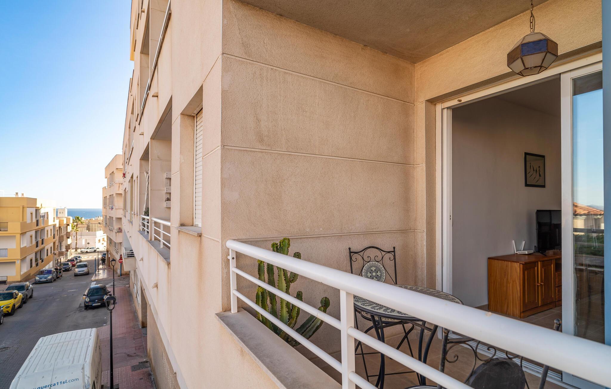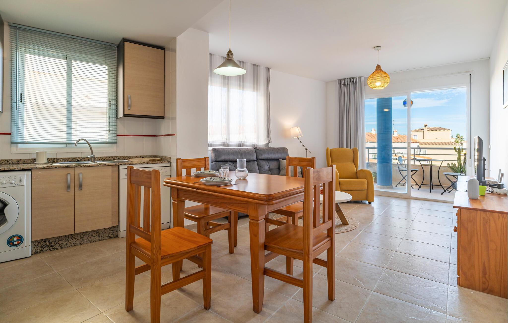 Din stilfullt inredda semesterlägenhet i Garrucha erbjuder dig allt du behöver för en avkopplande semester på Costa de Almeria. Börja morgonen på balkongen, där du kan njuta av din frukost med en underbar utsikt över det omgivande området. Havet glittrar i bakgrunden och inbjuder dig att njuta av en varm dag på stranden. Det ljusa vardagsrummet lovar ren avkoppling tack vare de mysiga sittmöblerna, medan det välutrustade köket ger dig möjlighet att förbereda läckra måltider. Använd den eleganta matplatsen för mysiga kvällar eller koppla av med en bok i den bekväma soffan.