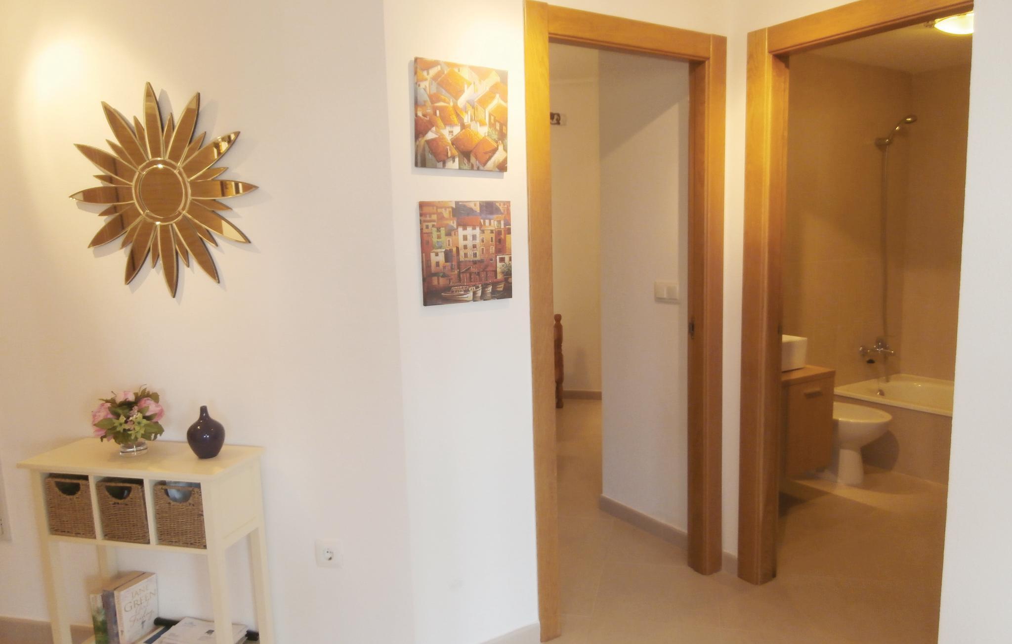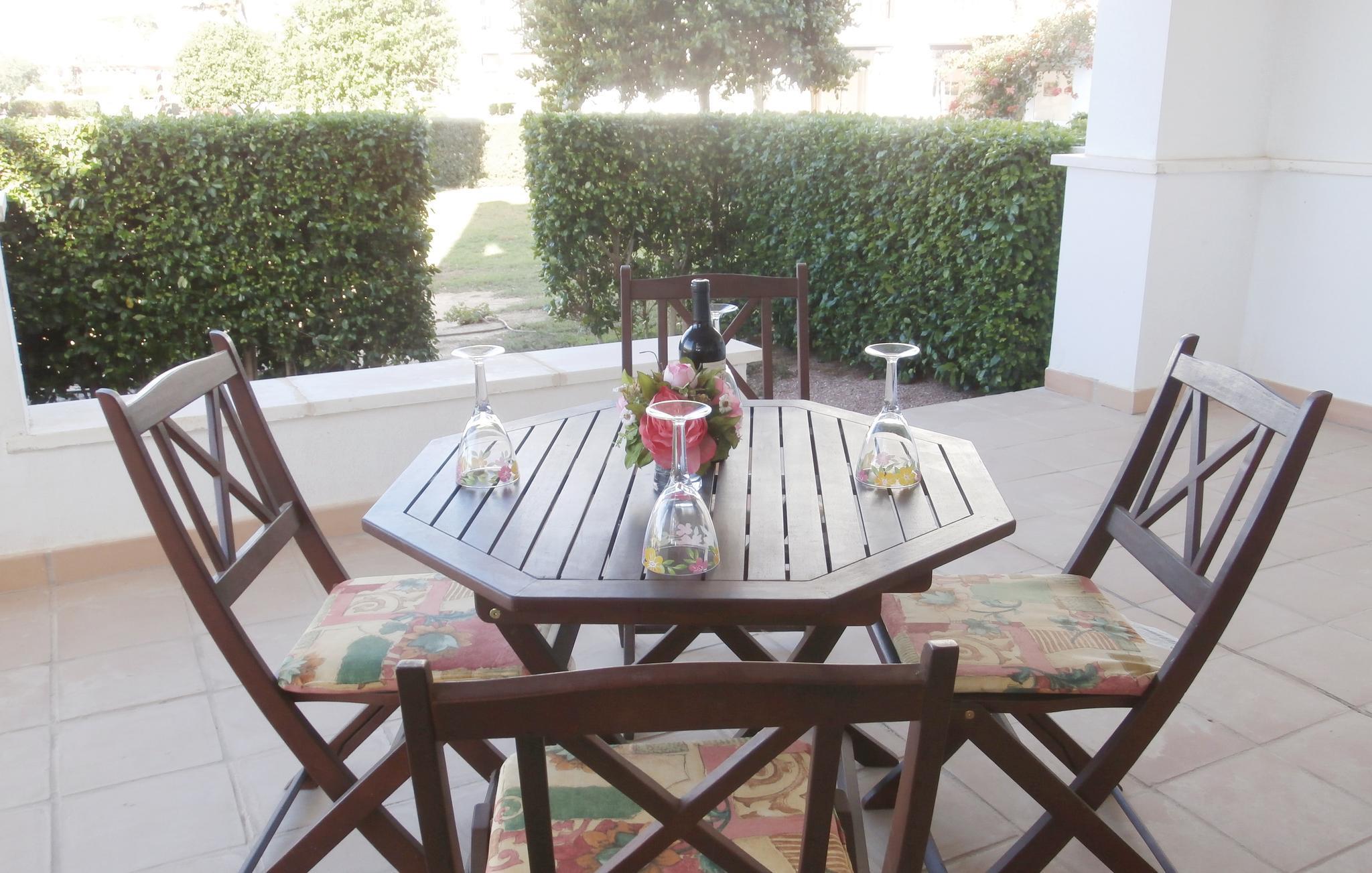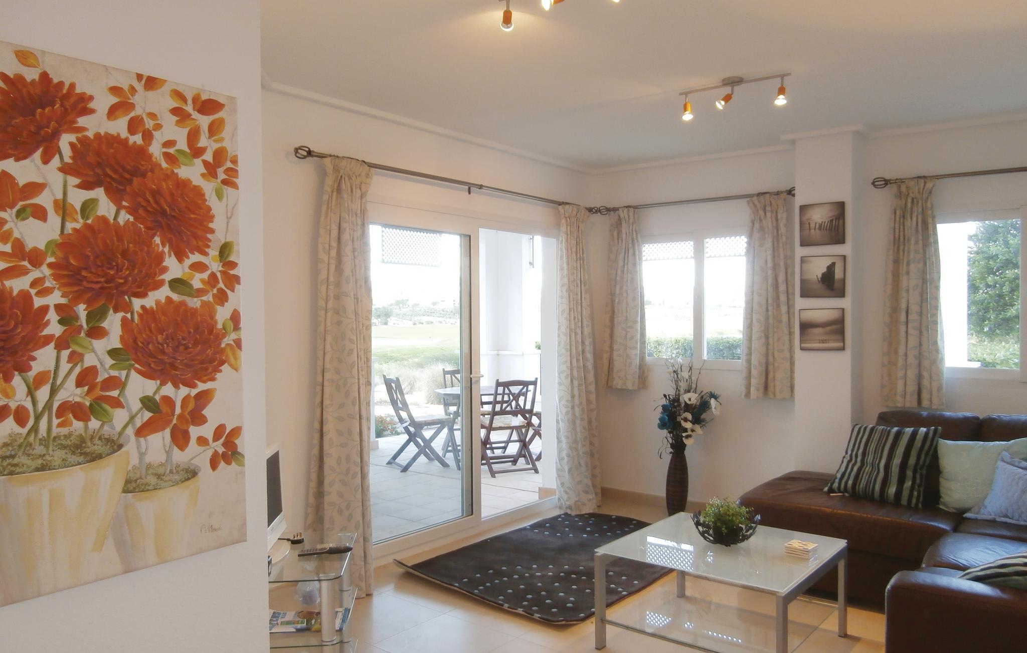 Semesterlägenhet på bottenvåningen med stor terrass och utsikt över golfbanan och sjön. Perfekt för gemensamma middagar utomhus. Med mycket välskött inredning och luftkonditionering i vardagsrummet.