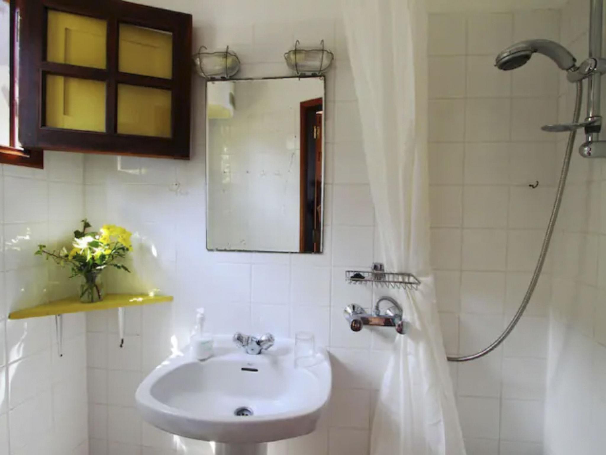 The large panoramic windows let in plenty of light. The unobstructed view from the entrance across the kitchen and living room, over the terrace and down to the sea is inspiring and makes the small house appear quite spacious. The beautiful old wooden doors, the wooden furniture and the small library create a warm and cosy atmosphere.