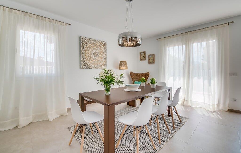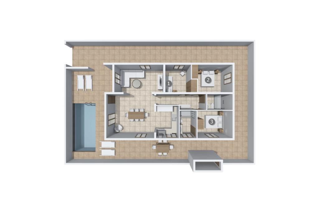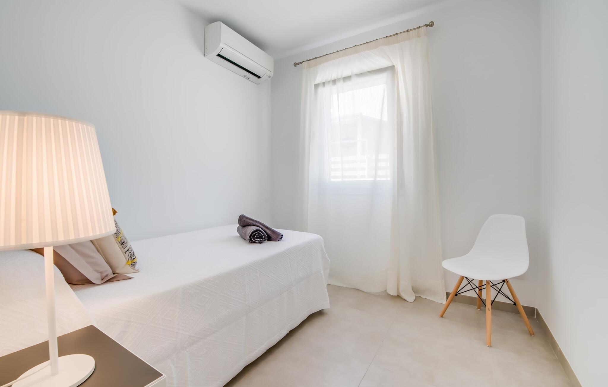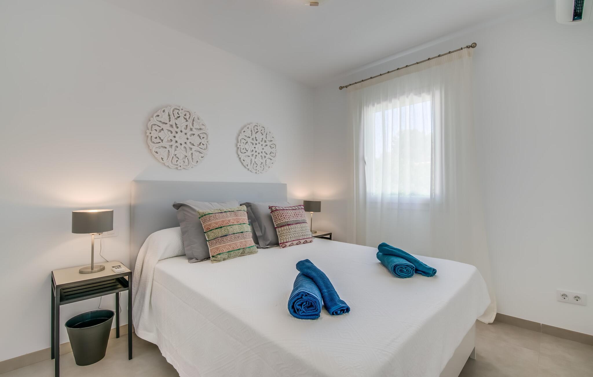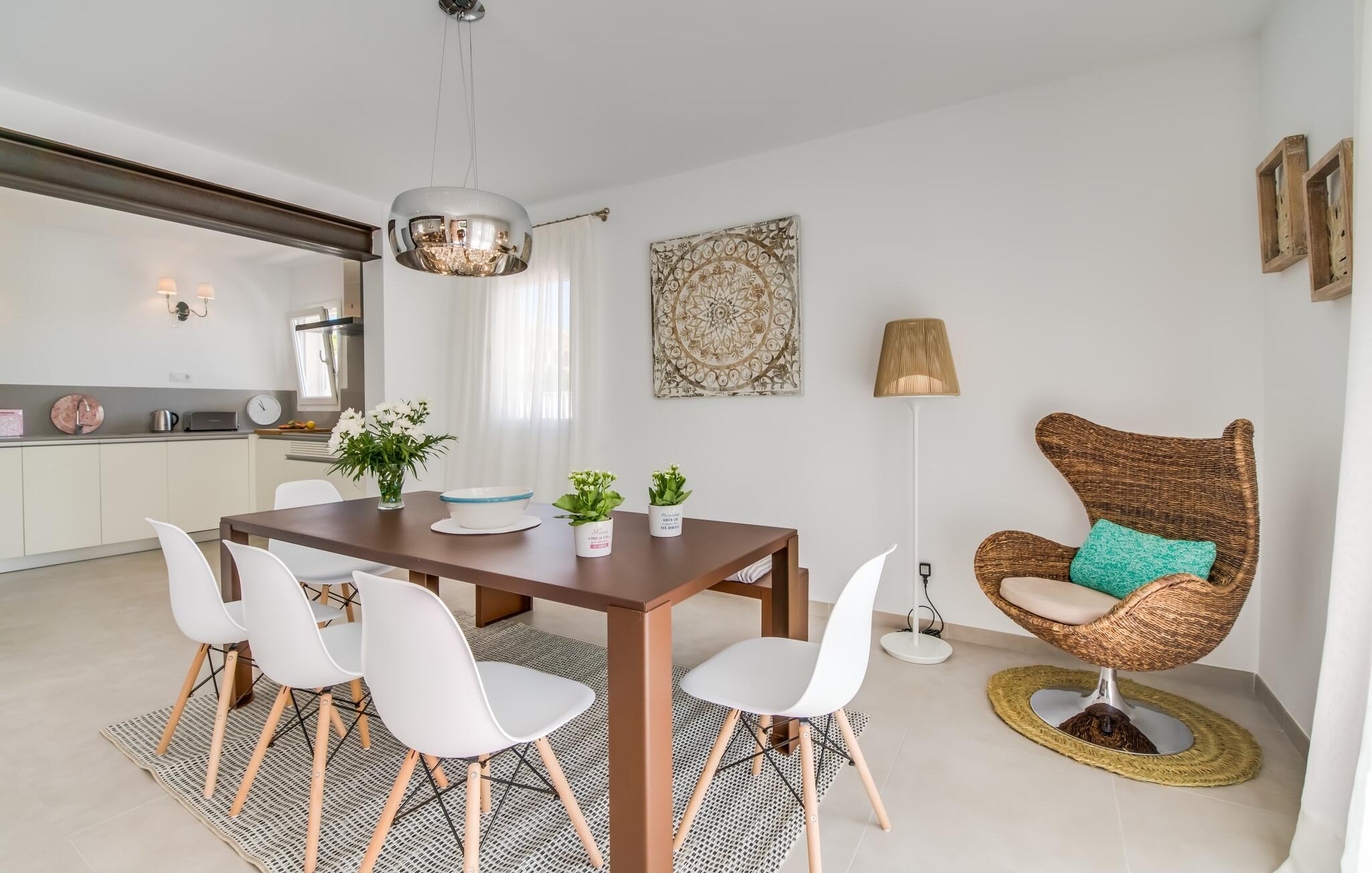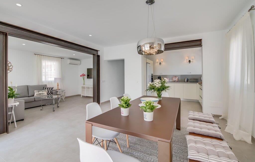 Rummen i det 120 m² stora huset är fördelade på bottenvåningen. Det moderna, ljusa vardagsrummet med separat matplats och vardagsrumsdel leder in till ett kök med öppen planlösning. Vita gardiner framför fönster från golv till tak ger gott om ljus och skapar en mysig atmosfär. Du kan titta på dina favoritprogram på den stora platt-TV:n från den bekväma soffan. Har du full tillgång till internet på semestern? Inga bekymmer! Surfa helt enkelt via WLAN. Det öppna köket i din villa är utrustat med toppmoderna apparater; ett rymligt kylskåp erbjuder gott om plats för längre shoppingturer. De tre sovrummen, som också ligger på bottenvåningen, är funktionella och inredda i ljusa färger. Blandningen av vita möbler och utvalda färgaccenter skapar ett mysigt intryck. Två dubbelrum har dubbelsängar på 1,60 x 2 m, det tredje rummet har en enkelsäng för ytterligare en resenär. Alla sovrum och vardagsrummet är fullt luftkonditionerade. Två moderna dagsljusduschar med duschkabin, varav en är en-suite, gör din morgonrutin till ett sant nöje.