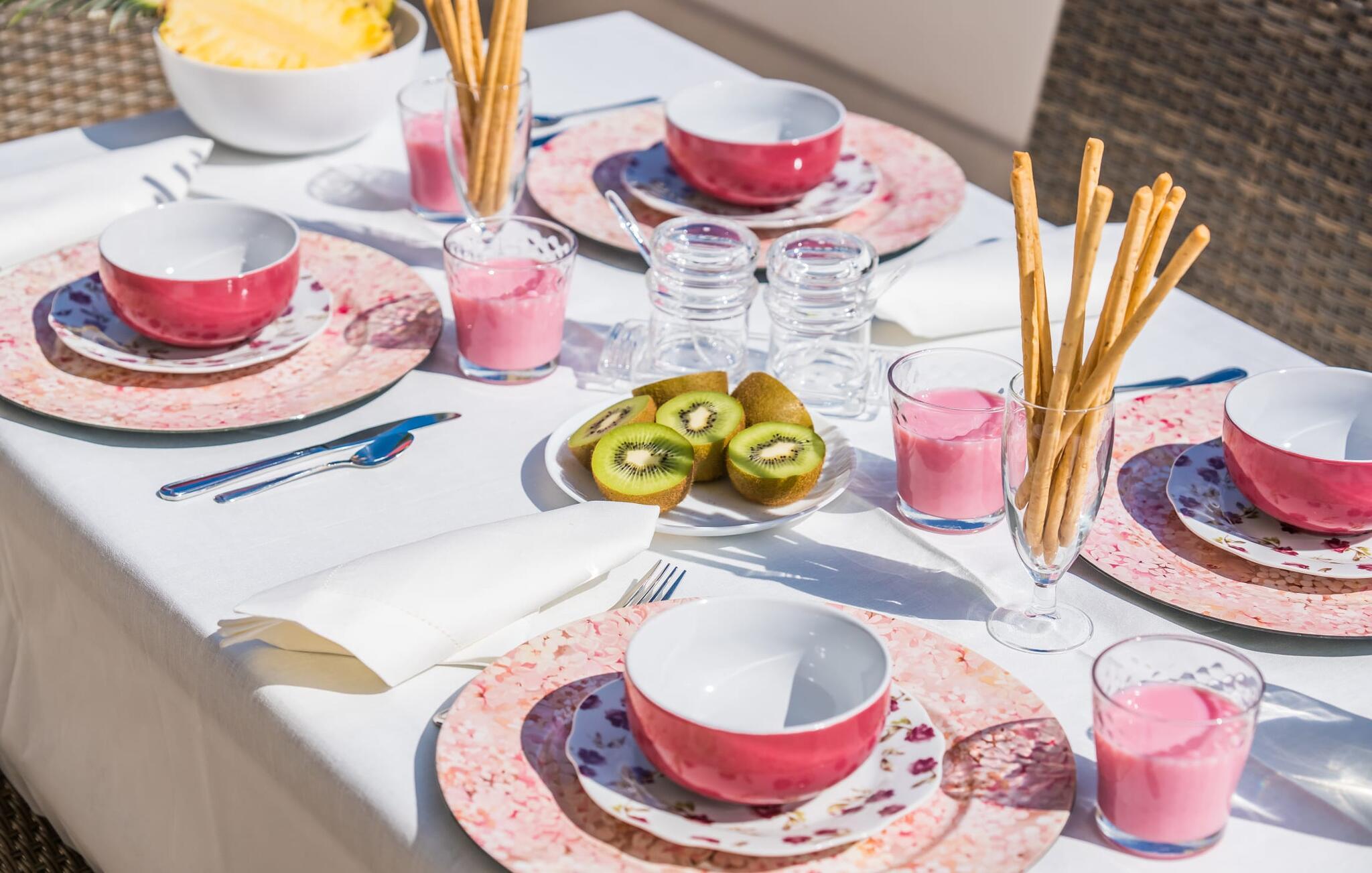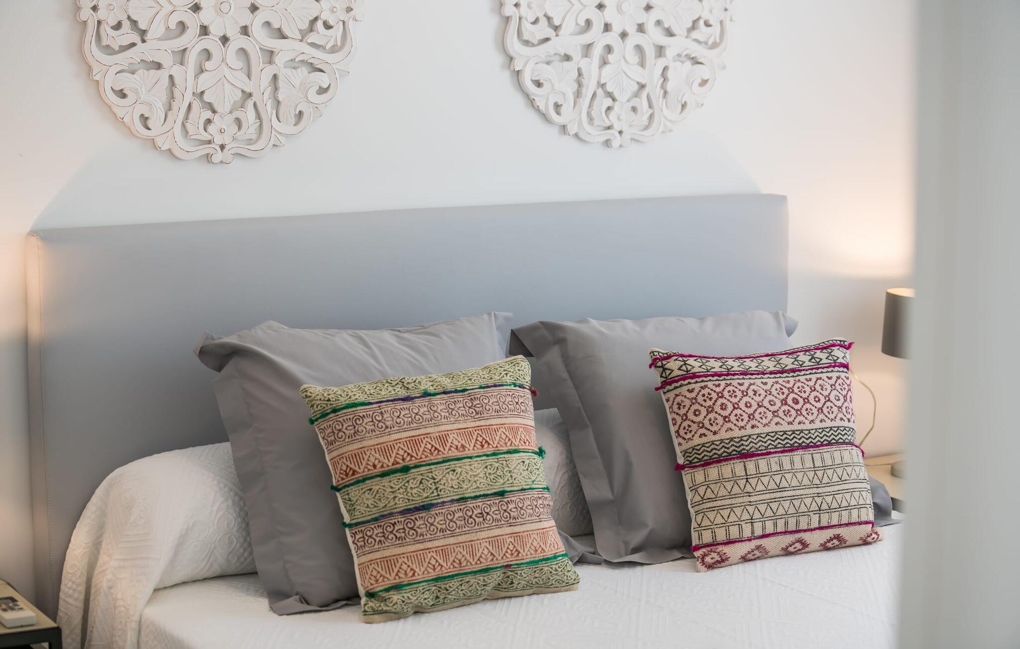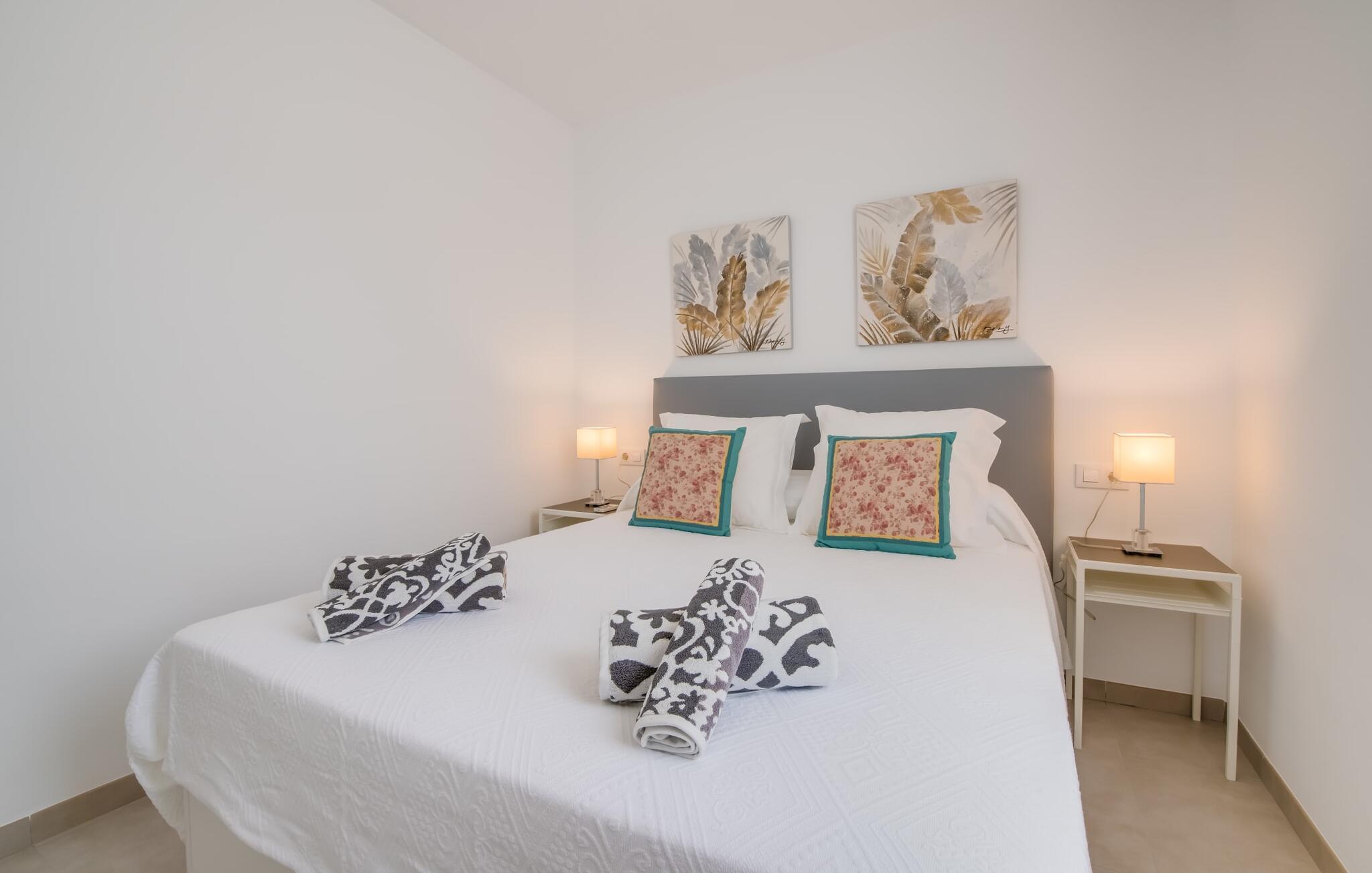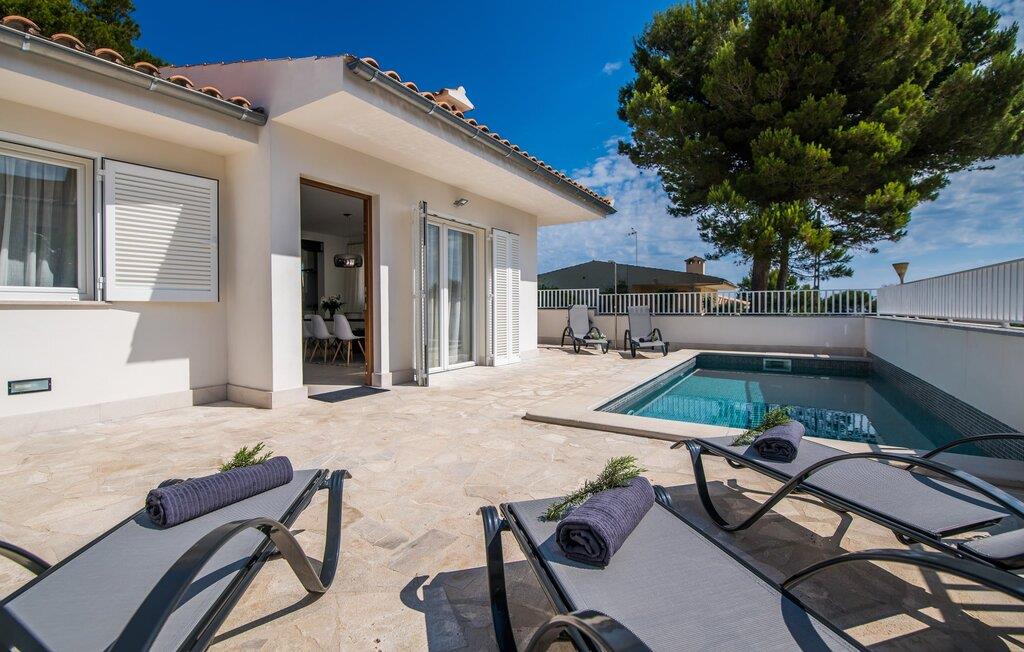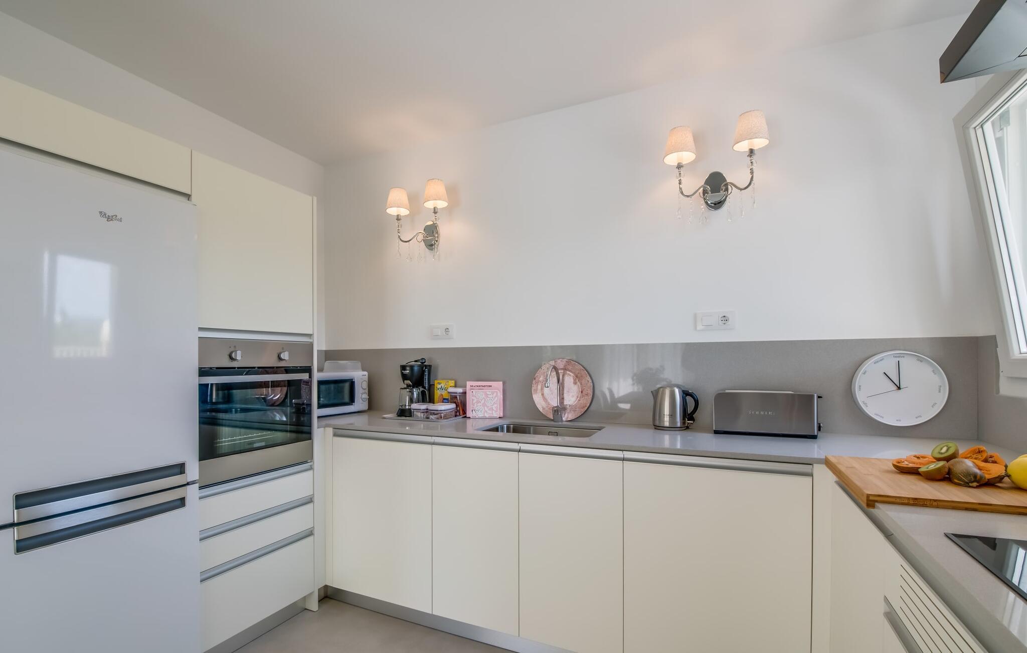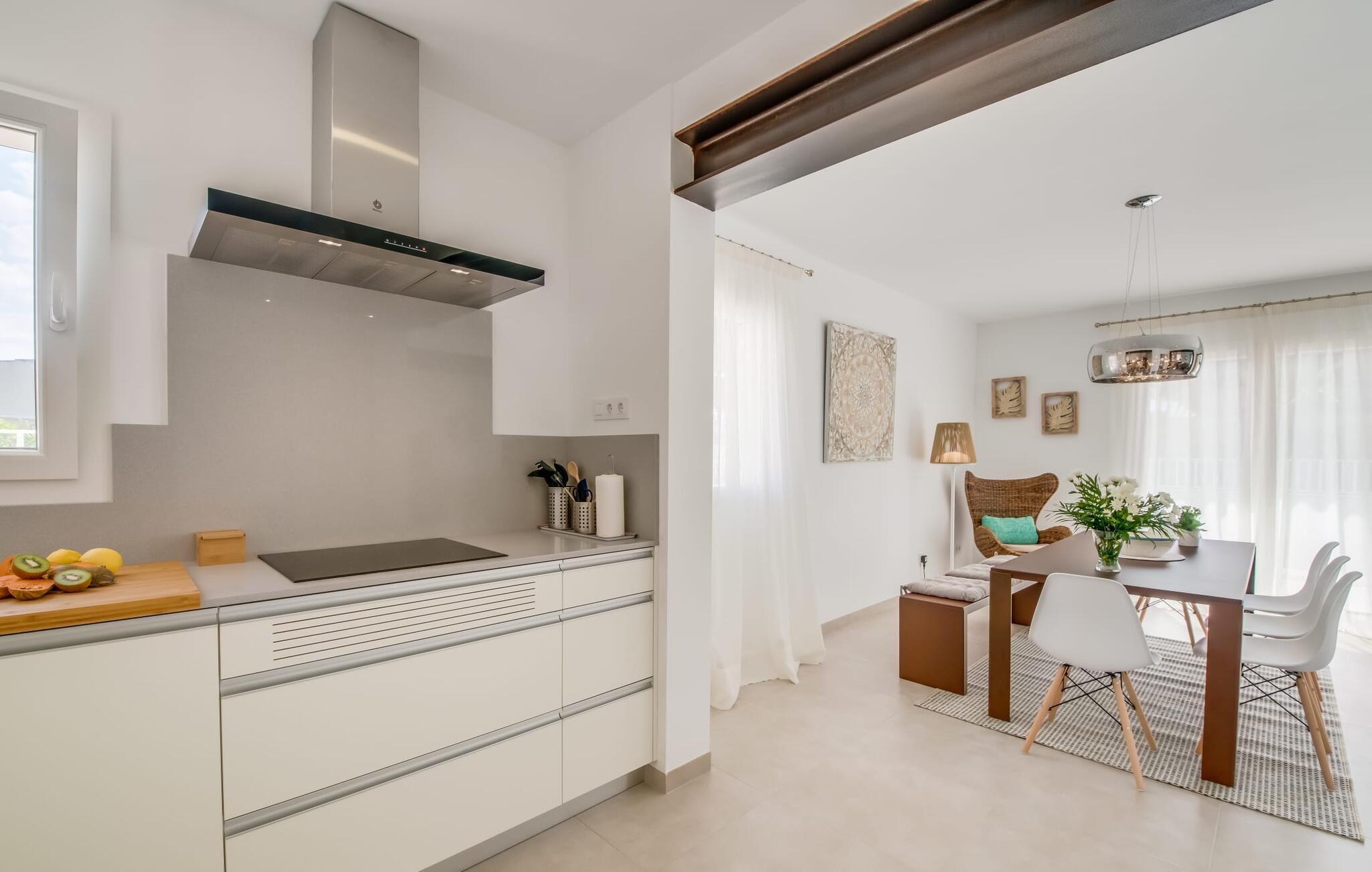 Rummen i det 120 m² stora huset är fördelade på bottenvåningen. Det moderna, ljusa vardagsrummet med separat matplats och vardagsrumsdel leder in till ett kök med öppen planlösning. Vita gardiner framför fönster från golv till tak ger gott om ljus och skapar en mysig atmosfär. Du kan titta på dina favoritprogram på den stora platt-TV:n från den bekväma soffan. Har du full tillgång till internet på semestern? Inga bekymmer! Surfa helt enkelt via WLAN. Det öppna köket i din villa är utrustat med toppmoderna apparater; ett rymligt kylskåp erbjuder gott om plats för längre shoppingturer. De tre sovrummen, som också ligger på bottenvåningen, är funktionella och inredda i ljusa färger. Blandningen av vita möbler och utvalda färgaccenter skapar ett mysigt intryck. Två dubbelrum har dubbelsängar på 1,60 x 2 m, det tredje rummet har en enkelsäng för ytterligare en resenär. Alla sovrum och vardagsrummet är fullt luftkonditionerade. Två moderna dagsljusduschar med duschkabin, varav en är en-suite, gör din morgonrutin till ett sant nöje.
