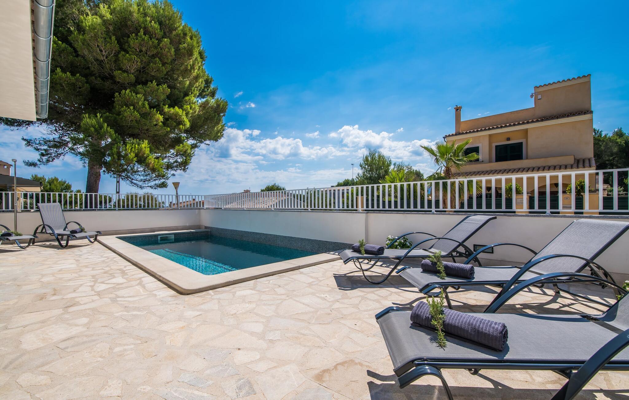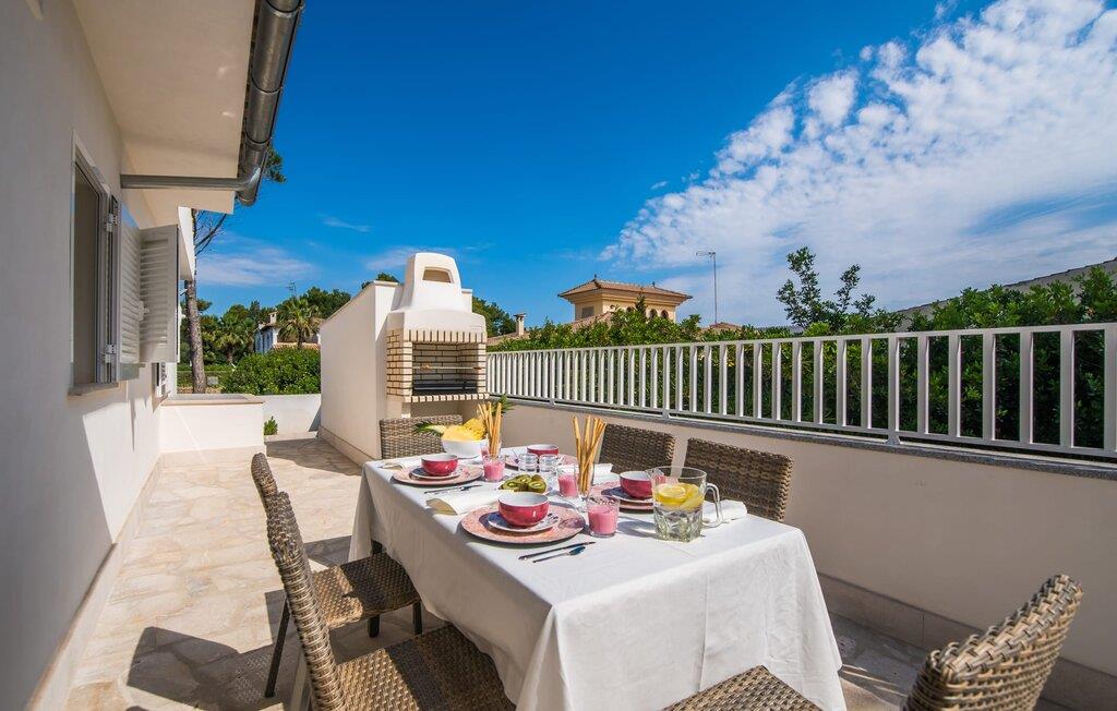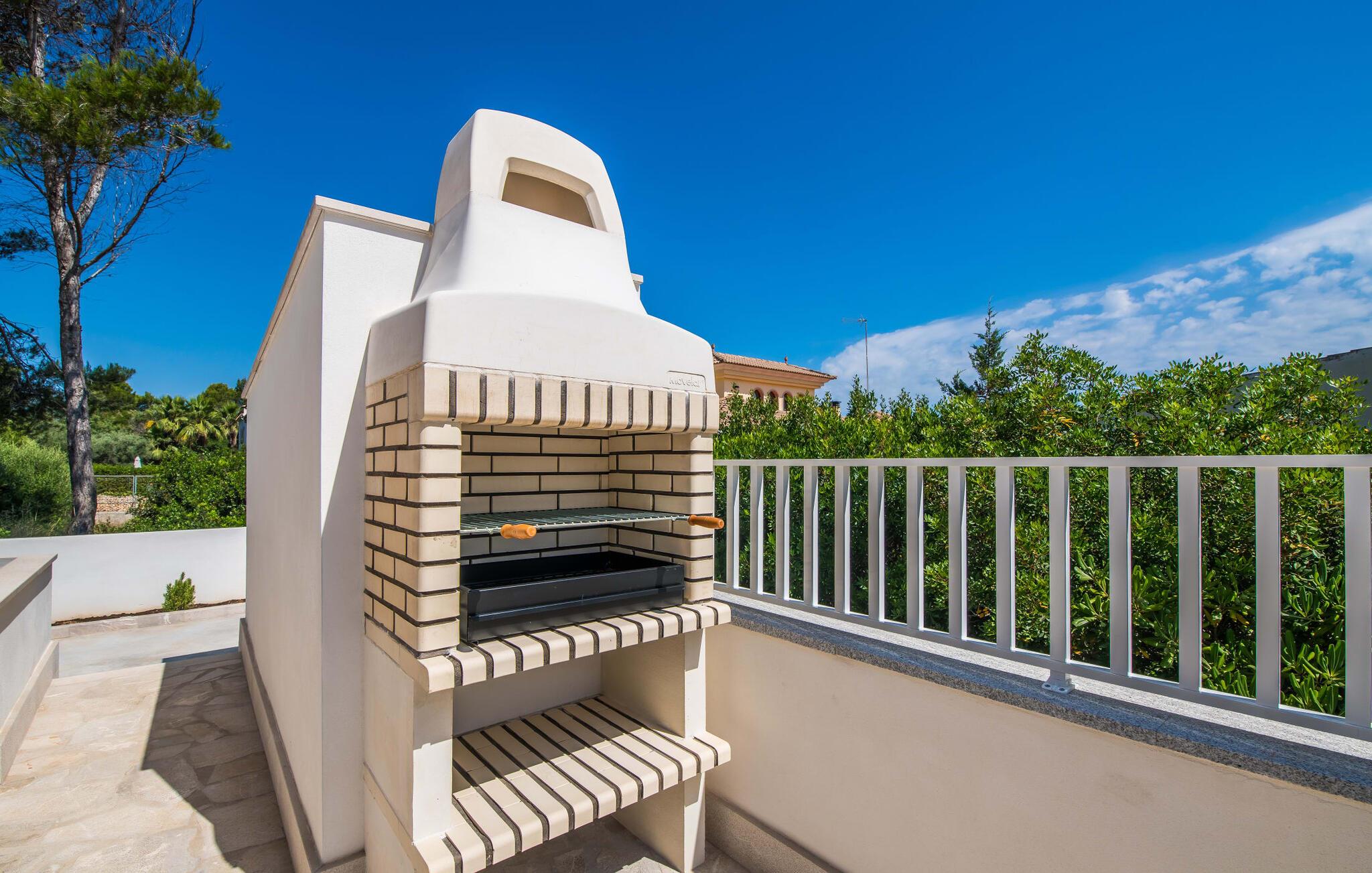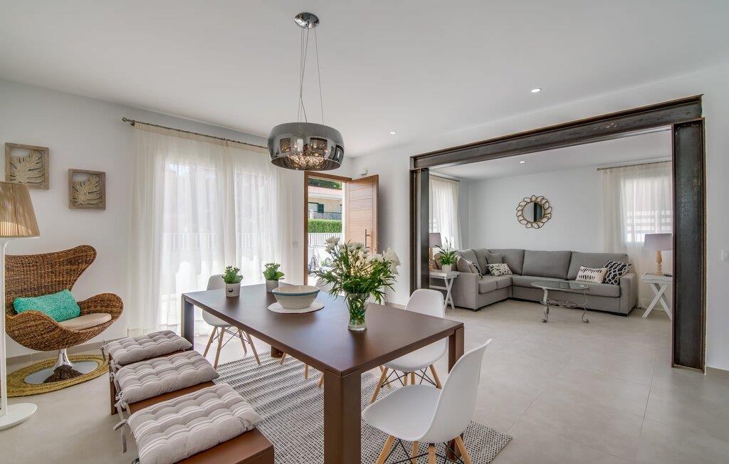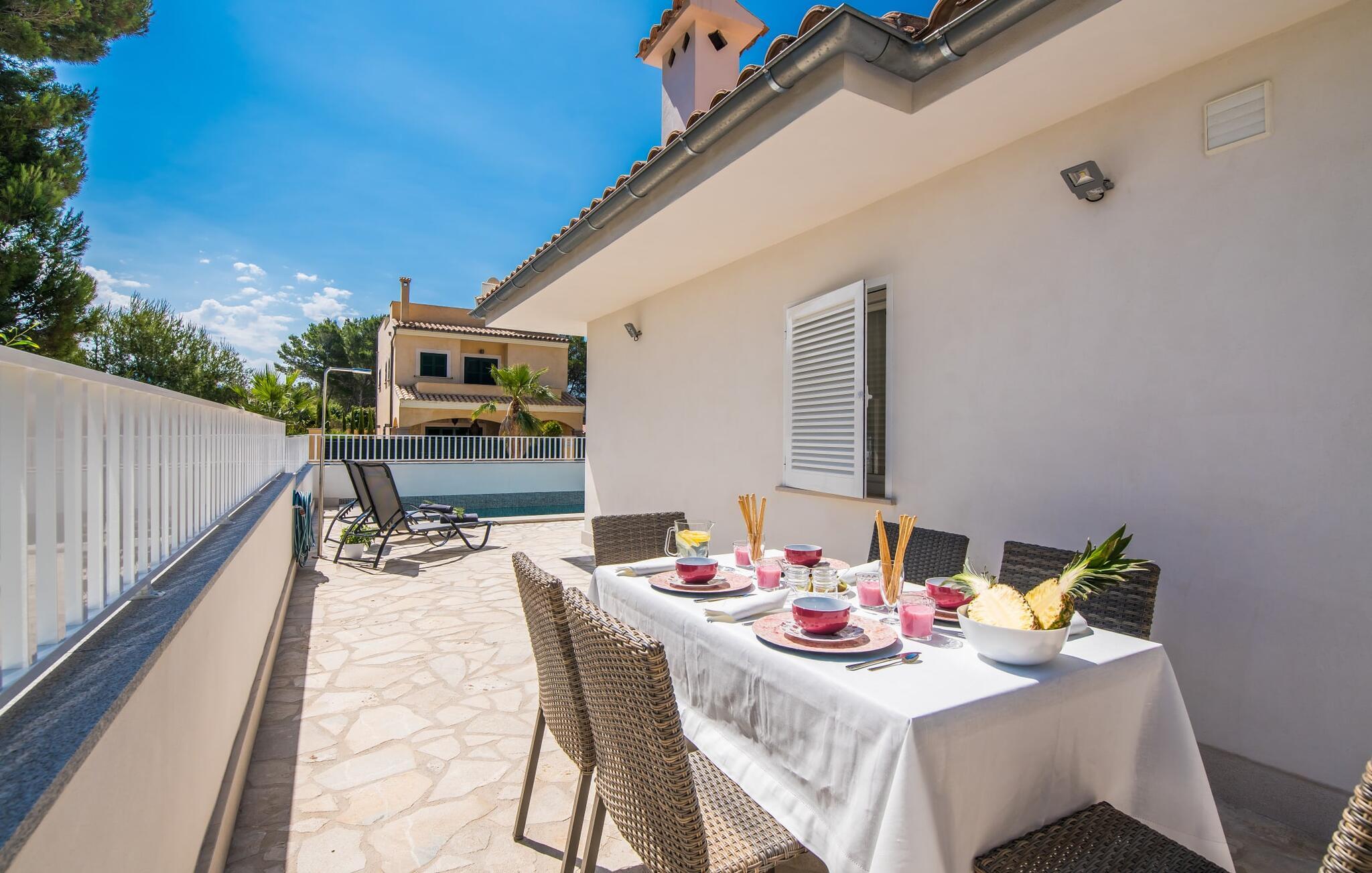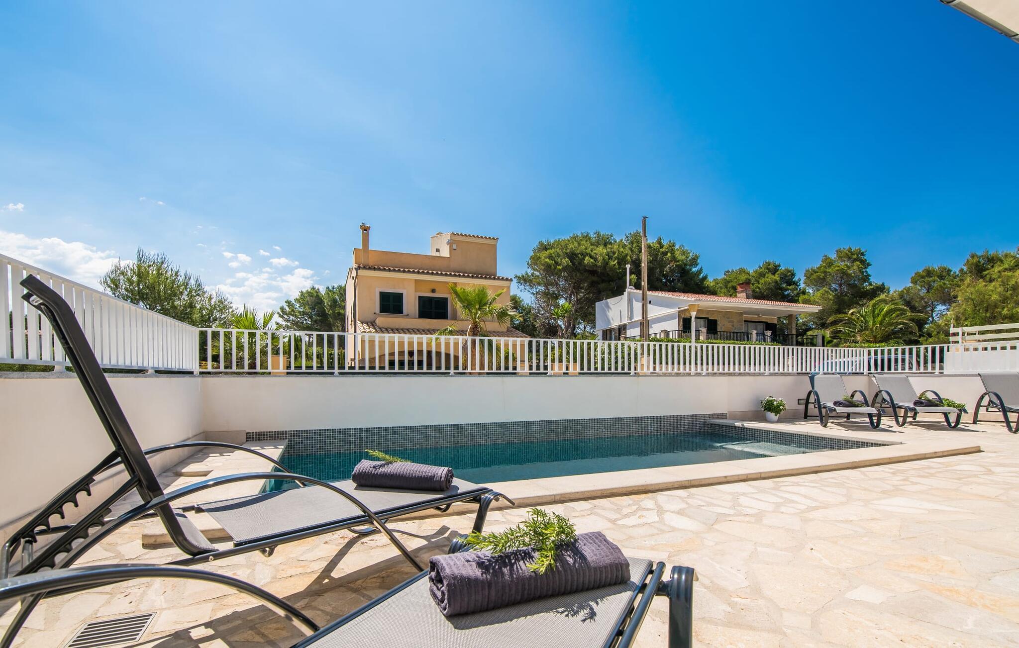 Villa Isabel Son Serra de Marina ligger på en helt inhägnad tomt på 315 m². Två stora solterrasser framför och bakom huset är utrustade med moderna utemöbler av hög kvalitet. Tydliga geometriska former och ett minimalistiskt uterum är en modern tolkning av 80-talets elementära och puristiska tendenser, ett medvetet brott med trenden med vågor av färger och former - denna designstil anses än idag vara banbrytande för att den är både funktionell och cool. En stor pool med varierande djup och en utomhusdusch precis intill huset ger den nödvändiga förfriskningen under varma dagar; bekväma solstolar finns tillgängliga för avkoppling. På andra sidan huset finns en terrass med en inbyggd kolgrill, ett stort matbord och sittplatser för upp till sex personer. Njut av en rejäl frukost utomhus eller tillbringa mysiga timmar med levande ljus medan du lyssnar på det mjuka ljudet av vågorna i havet.