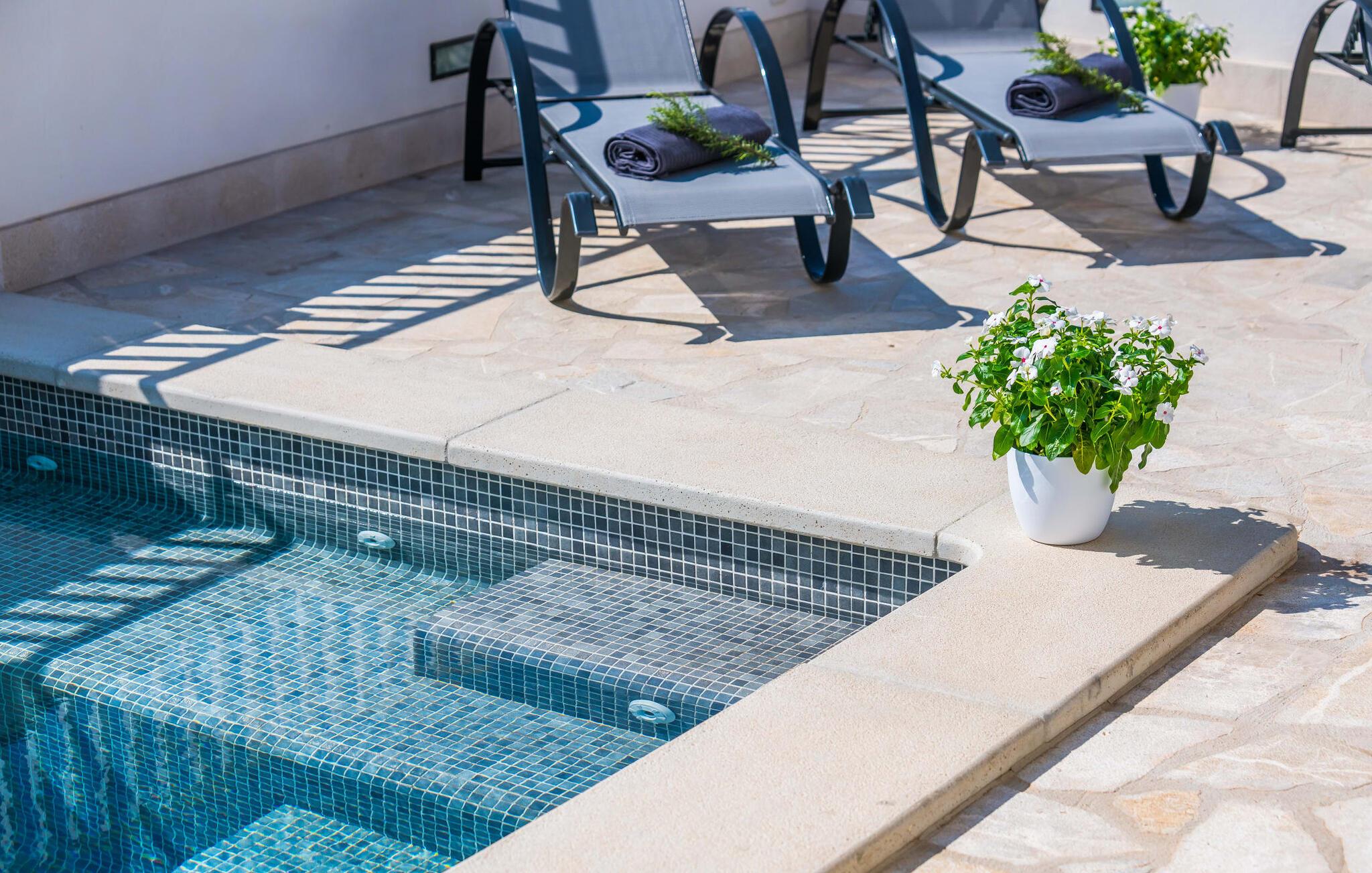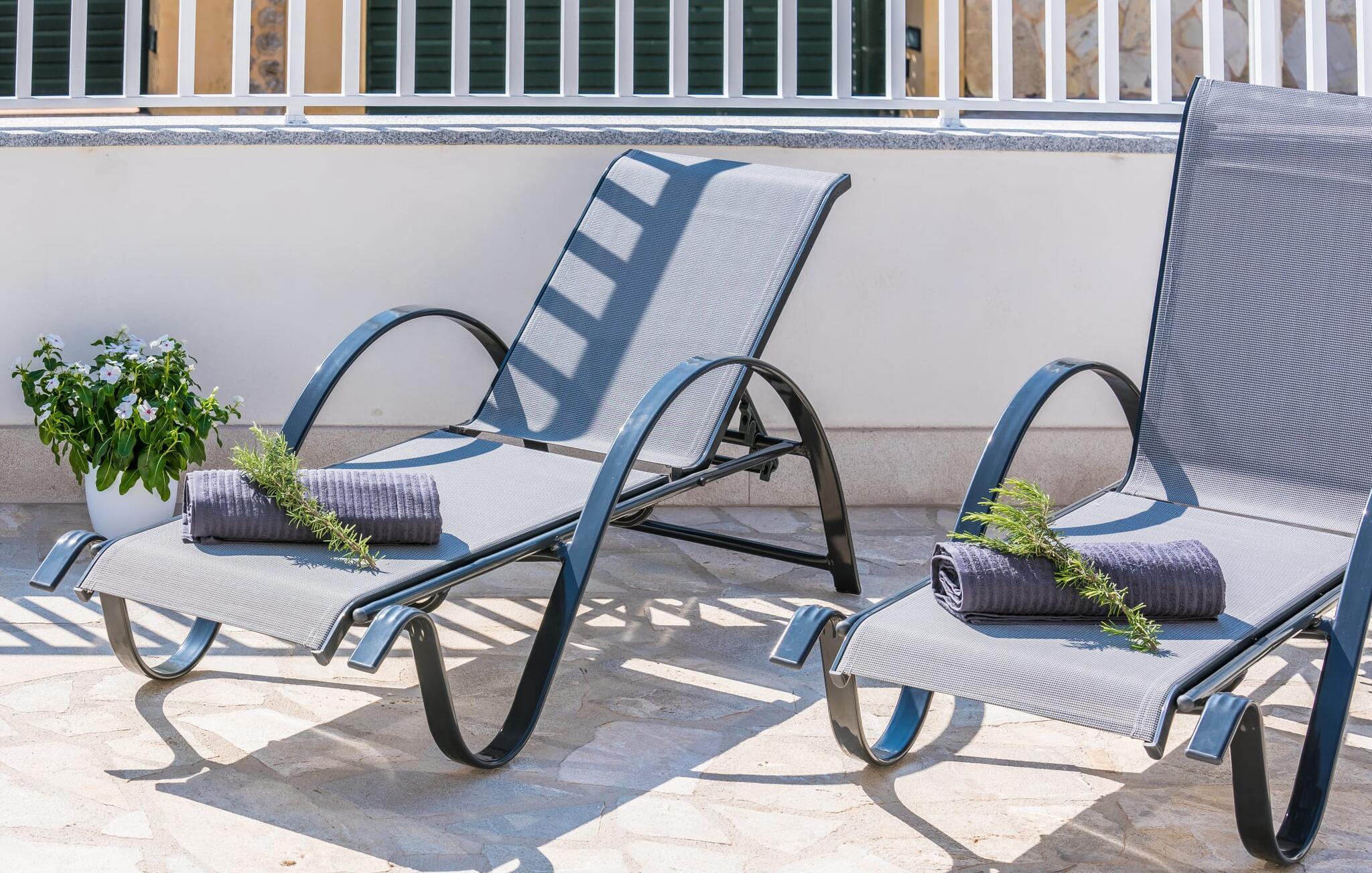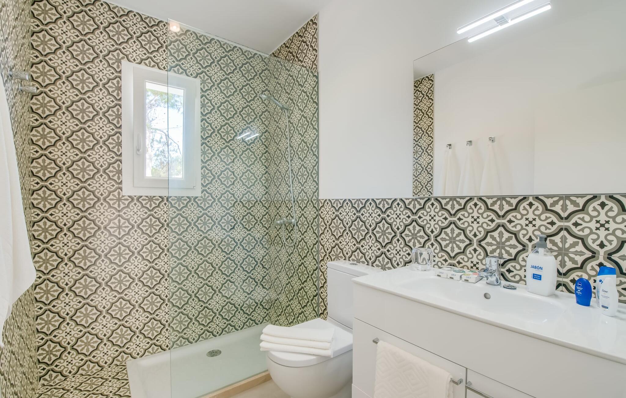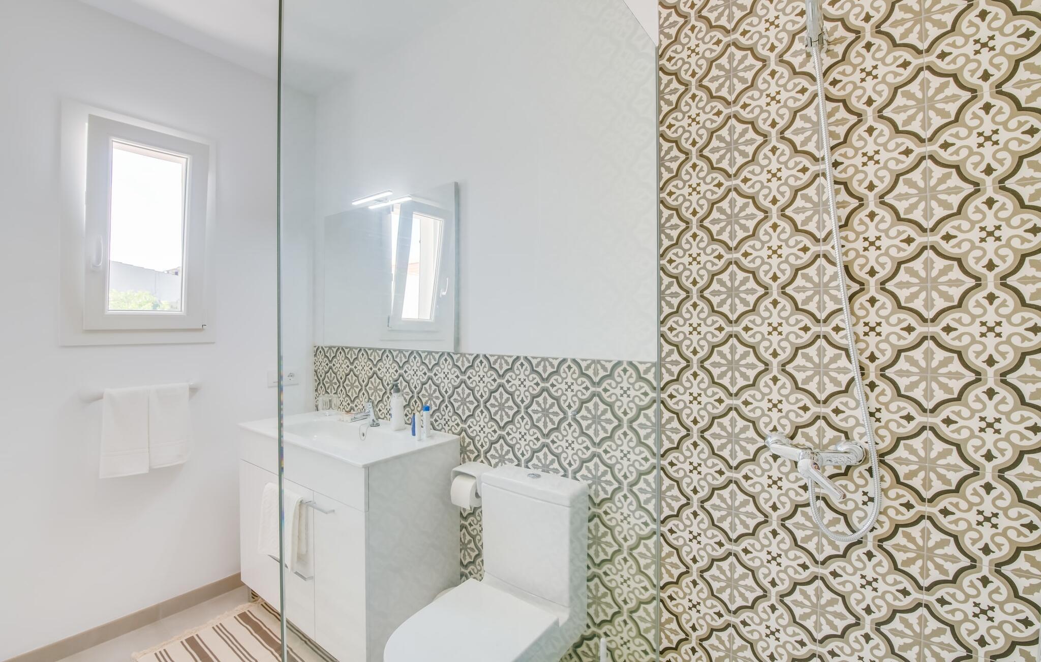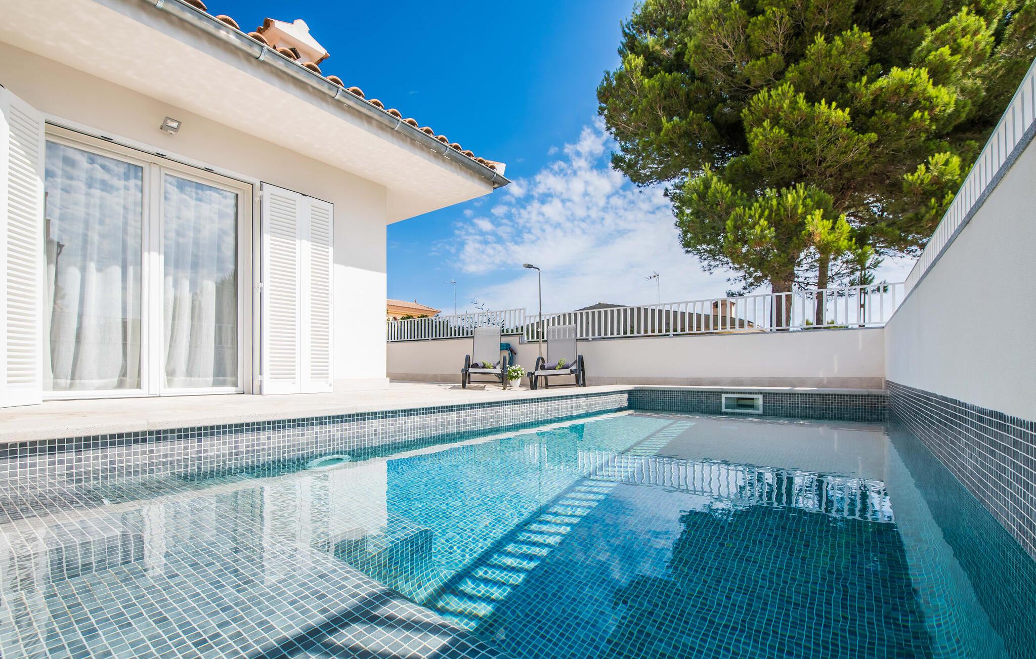 Villa Isabel Son Serra de Marina ligger på en helt inhägnad tomt på 315 m². Två stora solterrasser framför och bakom huset är utrustade med moderna utemöbler av hög kvalitet. Tydliga geometriska former och ett minimalistiskt uterum är en modern tolkning av 80-talets elementära och puristiska tendenser, ett medvetet brott med trenden med vågor av färger och former - denna designstil anses än idag vara banbrytande för att den är både funktionell och cool. En stor pool med varierande djup och en utomhusdusch precis intill huset ger den nödvändiga förfriskningen under varma dagar; bekväma solstolar finns tillgängliga för avkoppling. På andra sidan huset finns en terrass med en inbyggd kolgrill, ett stort matbord och sittplatser för upp till sex personer. Njut av en rejäl frukost utomhus eller tillbringa mysiga timmar med levande ljus medan du lyssnar på det mjuka ljudet av vågorna i havet.
