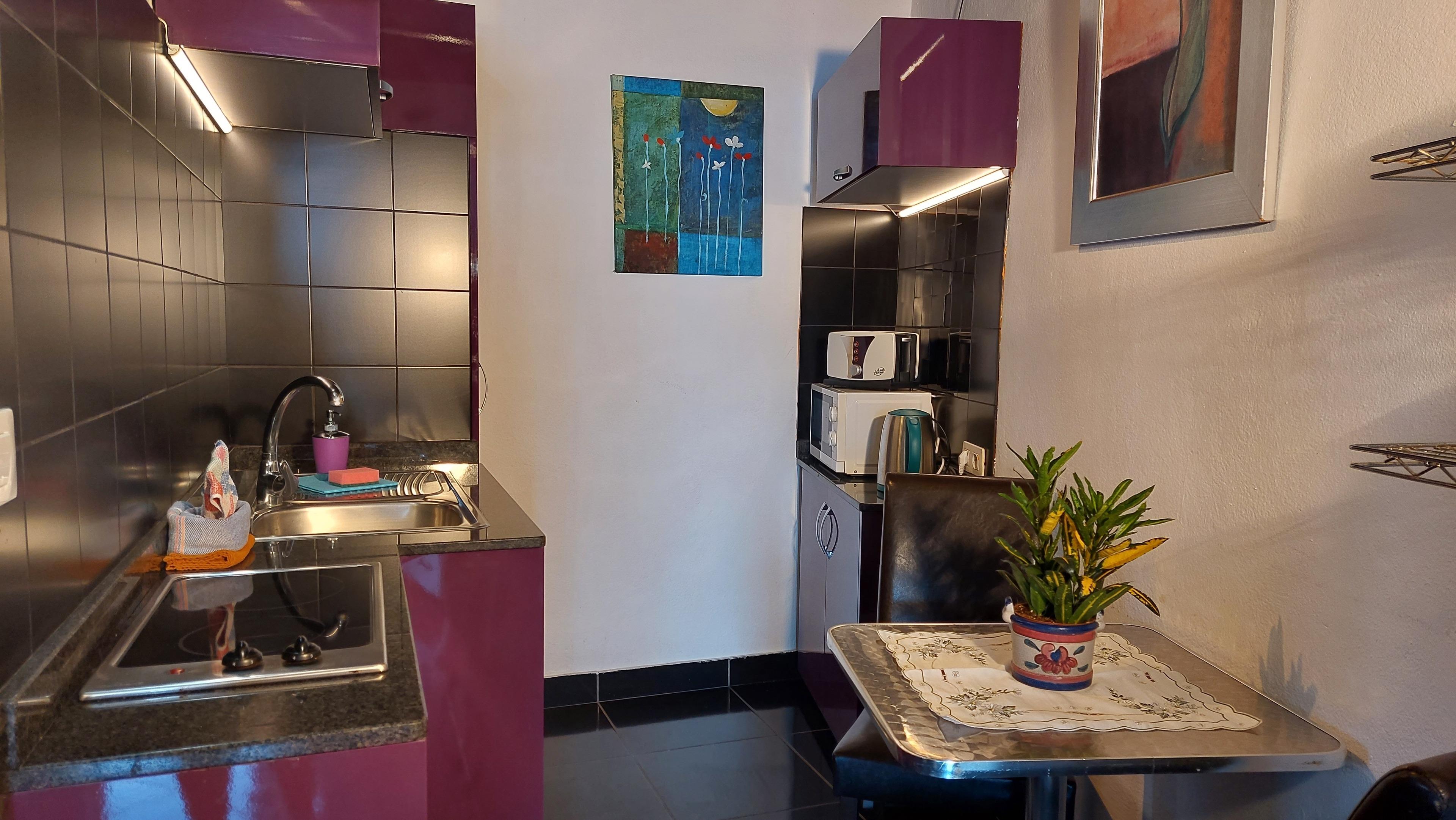 Modernes Wohnen im rustikalen Ambiente. Unsere Ferienwohnung im obersten Stockwerk bietet einen herrlichen Blick auf den Atlantik. Die im modernen Stil eingerichtete Ferienwohnung hat ein großzügig gestaltetes Wohnzimmer, eine gut ausgestattete direkt ans Wohnzimmer anschließende Küche, ein Schlafzimmer mit französichem Bett (150 cm) sowie ein Bad mit Toilette, Waschbecken, Bidet und Zwei-Personen-Sitzdusche. Vom privaten Balkon bietet sich ein freier Blick auf das Meer und das nahe gelegene Gebirge (kein Teide-Blick). Natürlich kann auch die große Gemeinschafts-Dachterrasse genutzt werden. Der Flachbildfernseher verfügt über Satellitenempfang mit ca. 450 internationalen Sendern- darunter alle frei empfangbaren deutschen Kanäle - sowie durch Umschalten auf der Fernbedienung über DVB-T-Empfang mit den gängigen spanischen Fernsehsendern. Zudem kann auf Anfrage kostenlos Netflix bereitgestellt werden. Unser Haus verfügt über Internetanschluss per Glasfaser und in allen Unterkünften sowie auf der Dachterrasse steht sehr gut funktionierendes W-LAN zur kostenlosen Verfügung.