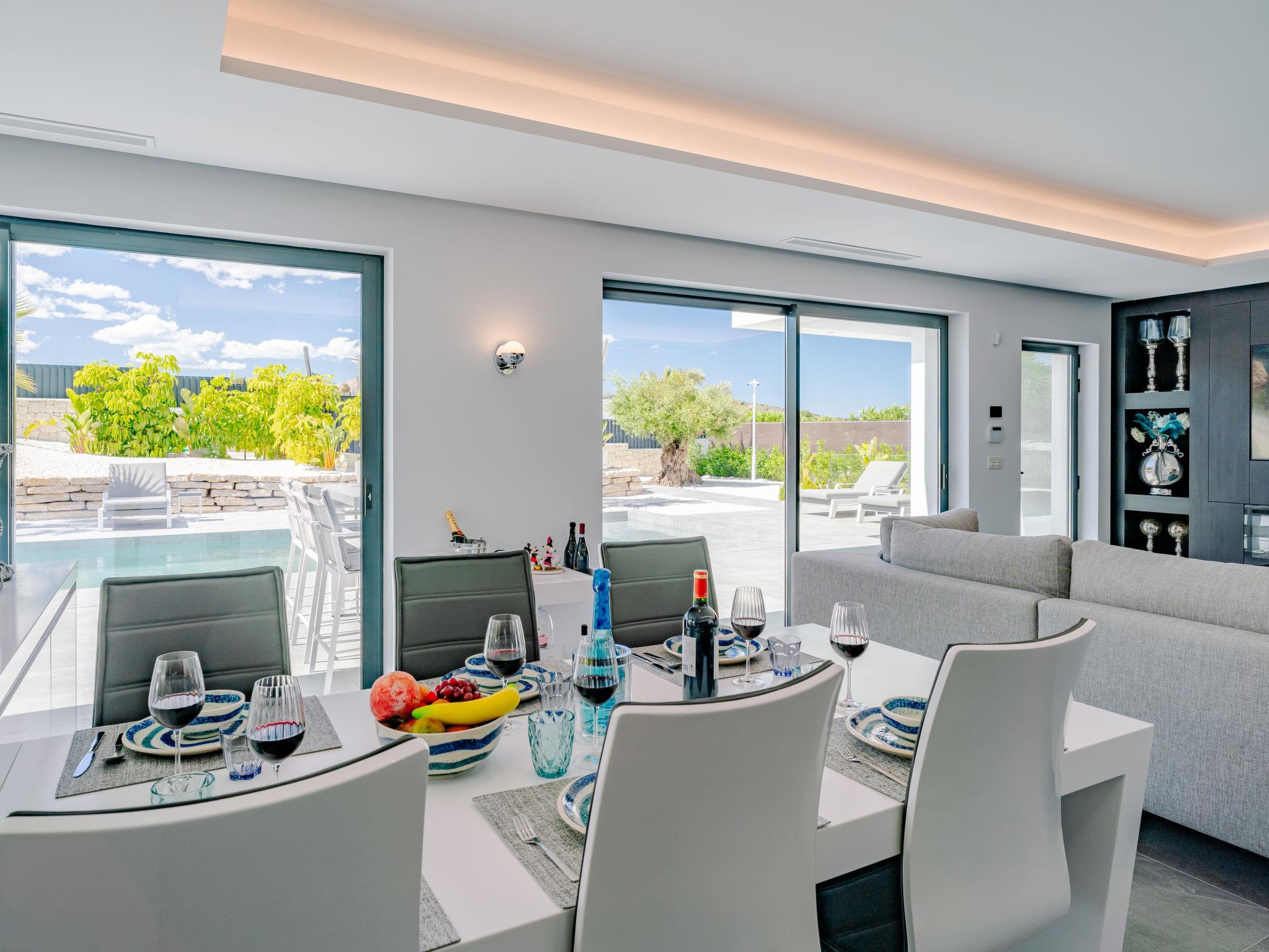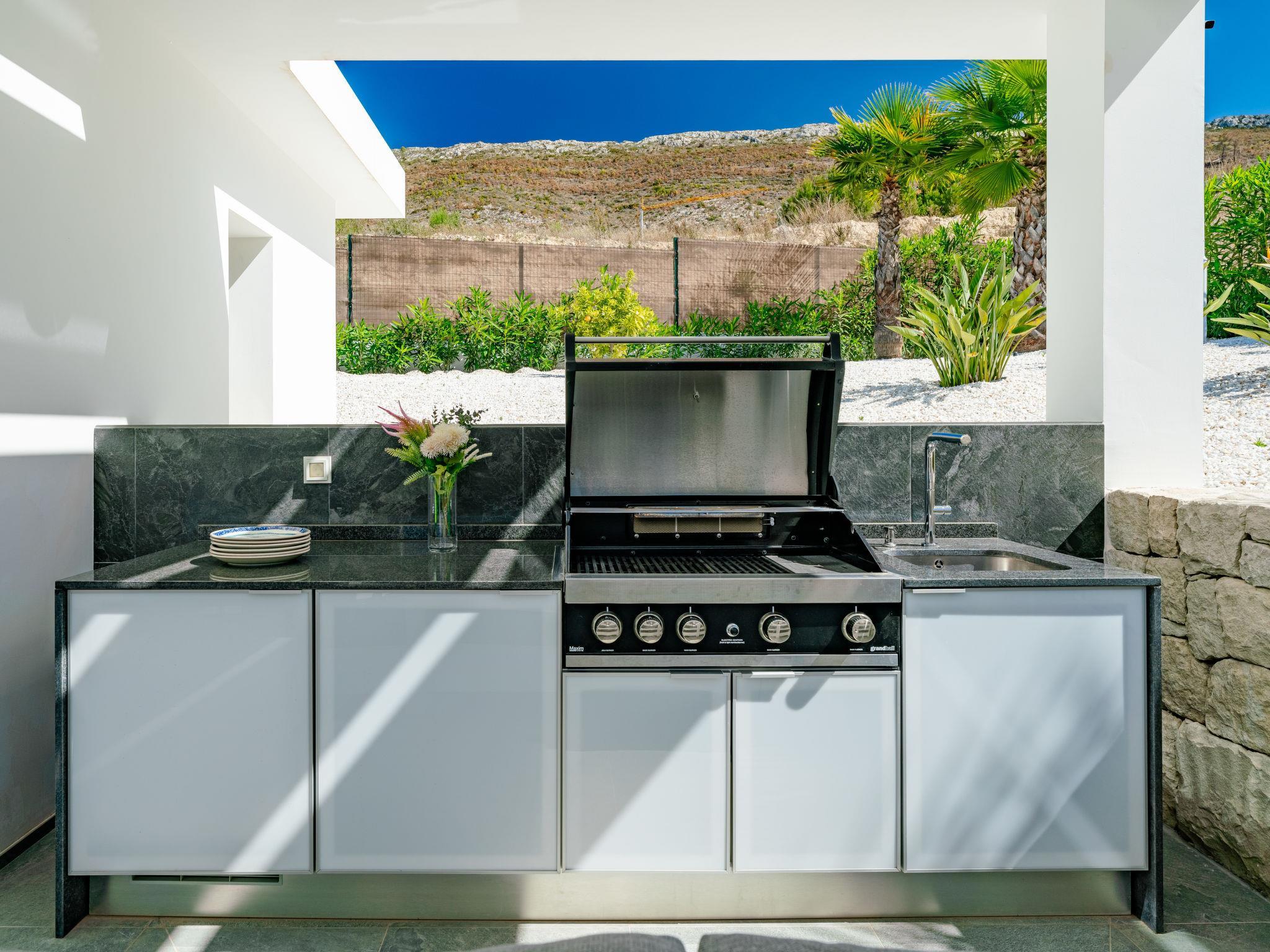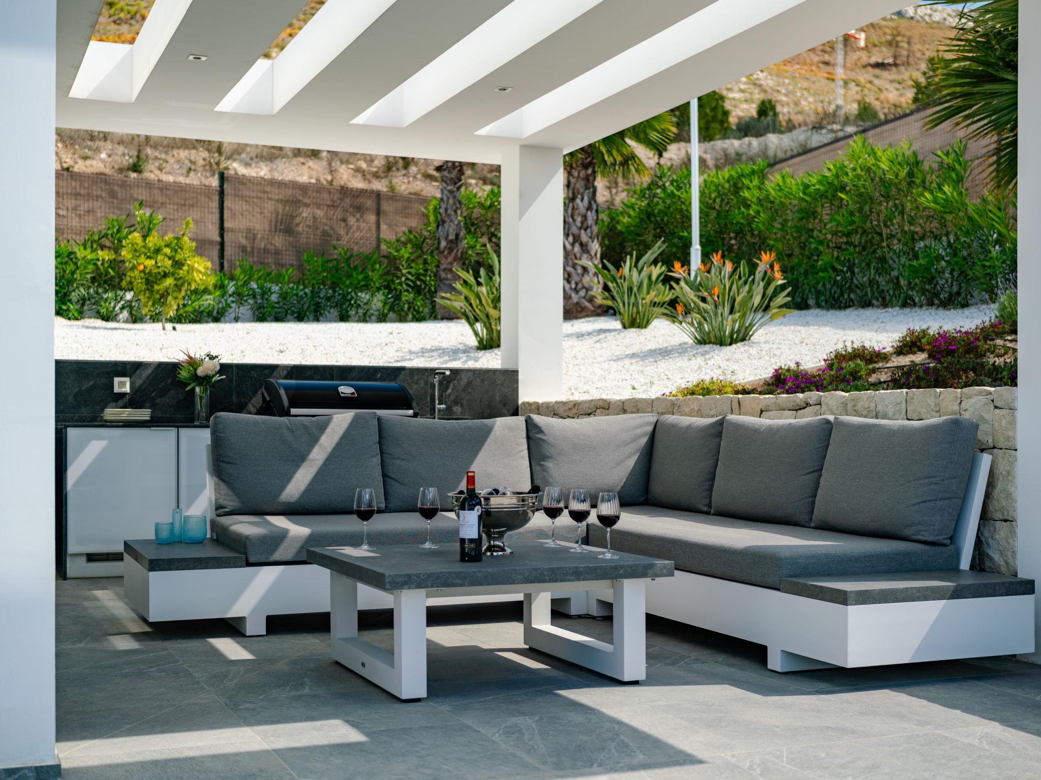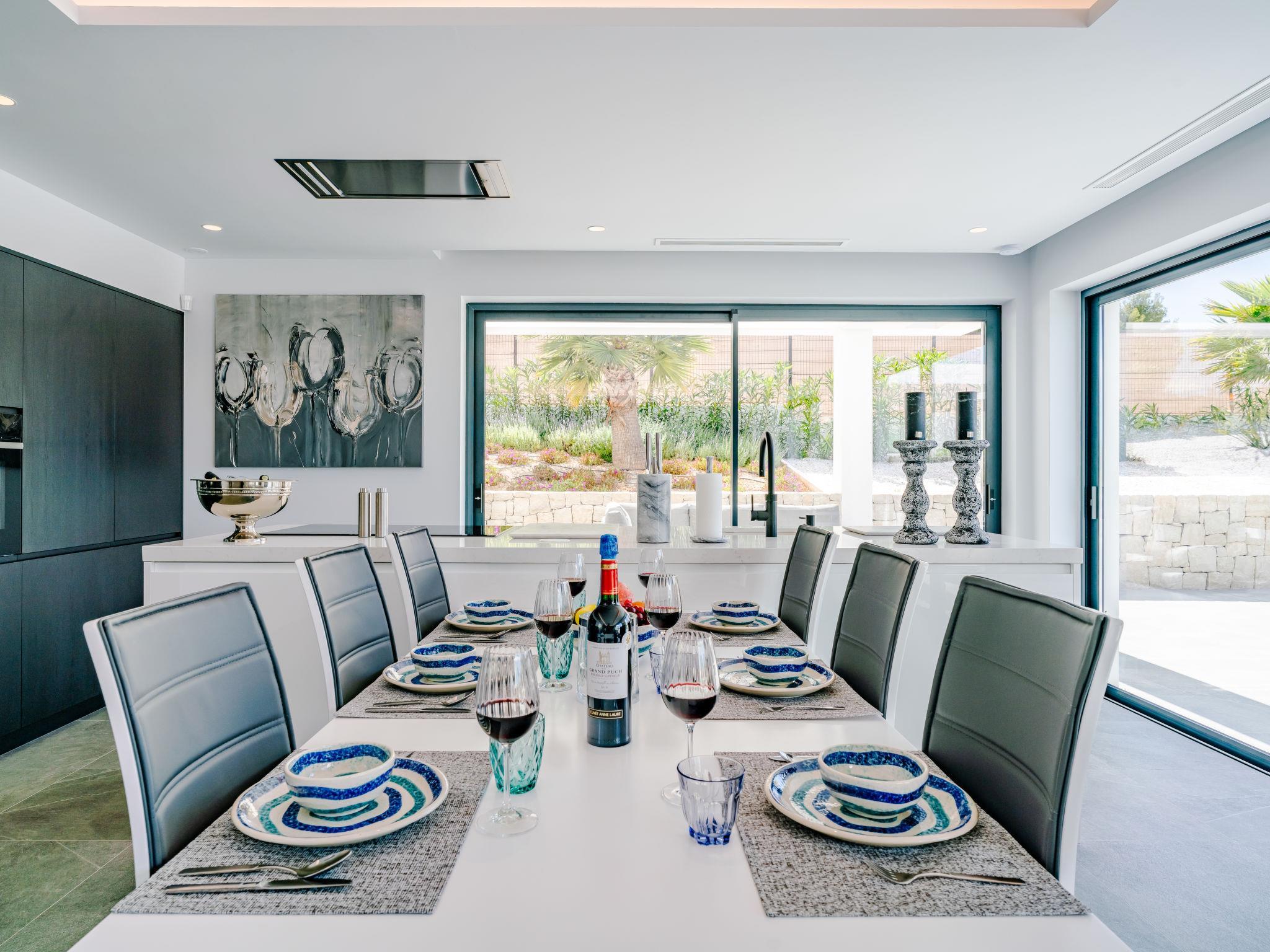 Very large, modern, luxurious villa "Palma", 2 storeys. In the district of Villes del Vent - Monte Olimpo 5 km from the centre of Jávea - El Arenal, 8 km from the centre of Moraira, in a quiet, sunny position, 5 km from the sea, 5 km from the beach. Private: large, beautiful, well-kept garden wildlife garden and trees, swimming pool angular, heated (12 x 4 m, depth 30 - 165 cm, seasonal availability: 01.Jan. - 31.Dec.) with internal staircase. Outdoor shower, pool house with fridge, pergola, terrace, garden furniture, barbecue. In the house: central heating system, air conditioning, laundry, washing machine, tumble dryer. Parking (for 2 cars) on the premises. Supermarket 2.5 km, restaurant 1 km, bar 2.5 km, bakery 2.5 km, café 2.5 km, bus stop "Parada antiguo Mas y Mas" 4.2 km, sandy beach "El Arenal" 5 km, shingle beach "La Granadella" 10 km. Sports harbour 6 km, marina 6 km, golf course (9 hole) 3 km, surf school 5 km, sailing school 5 km. Please note: car recommended. The owner does not accept any youth groups. ,Workation: There are two work areas available.