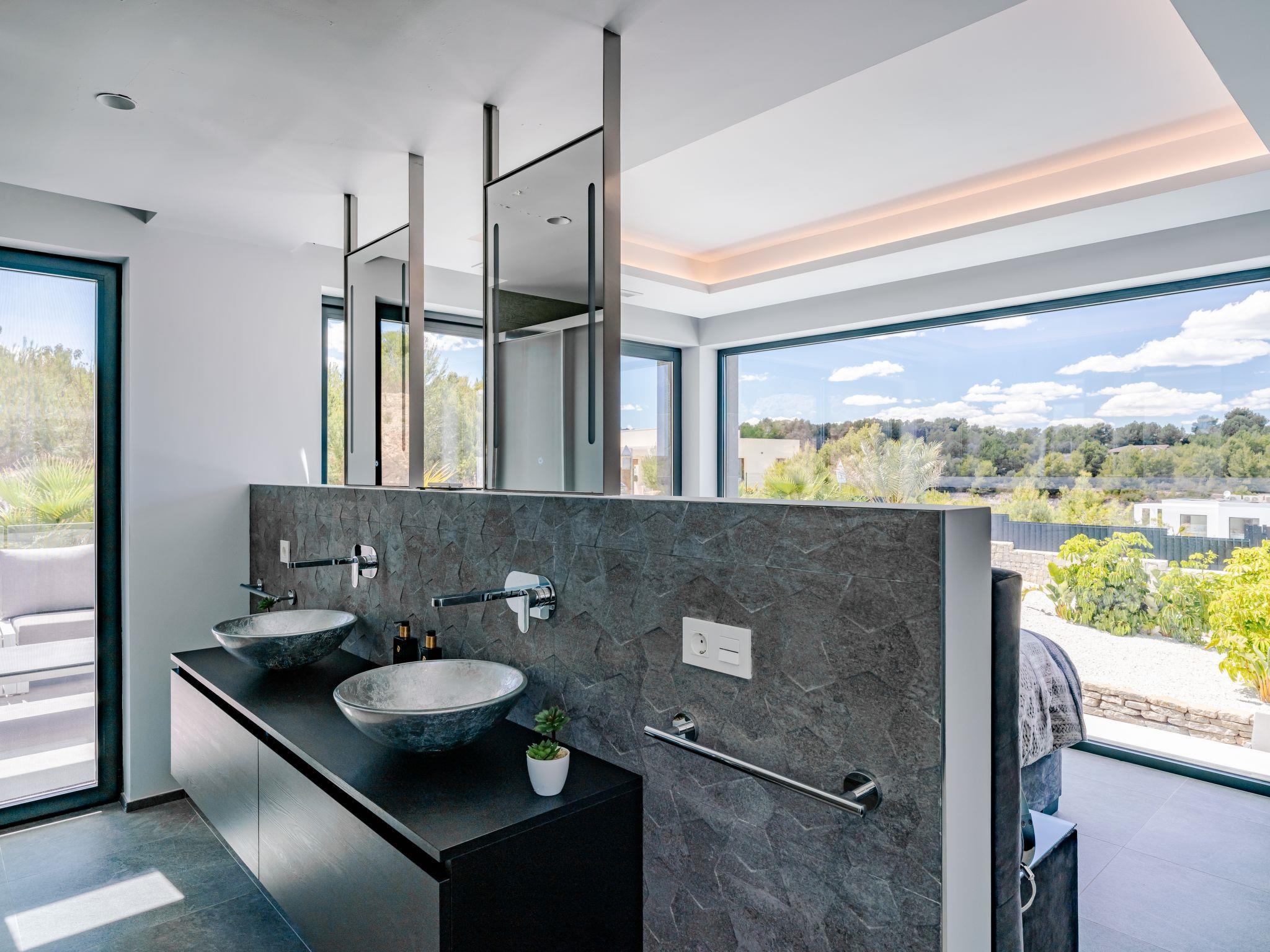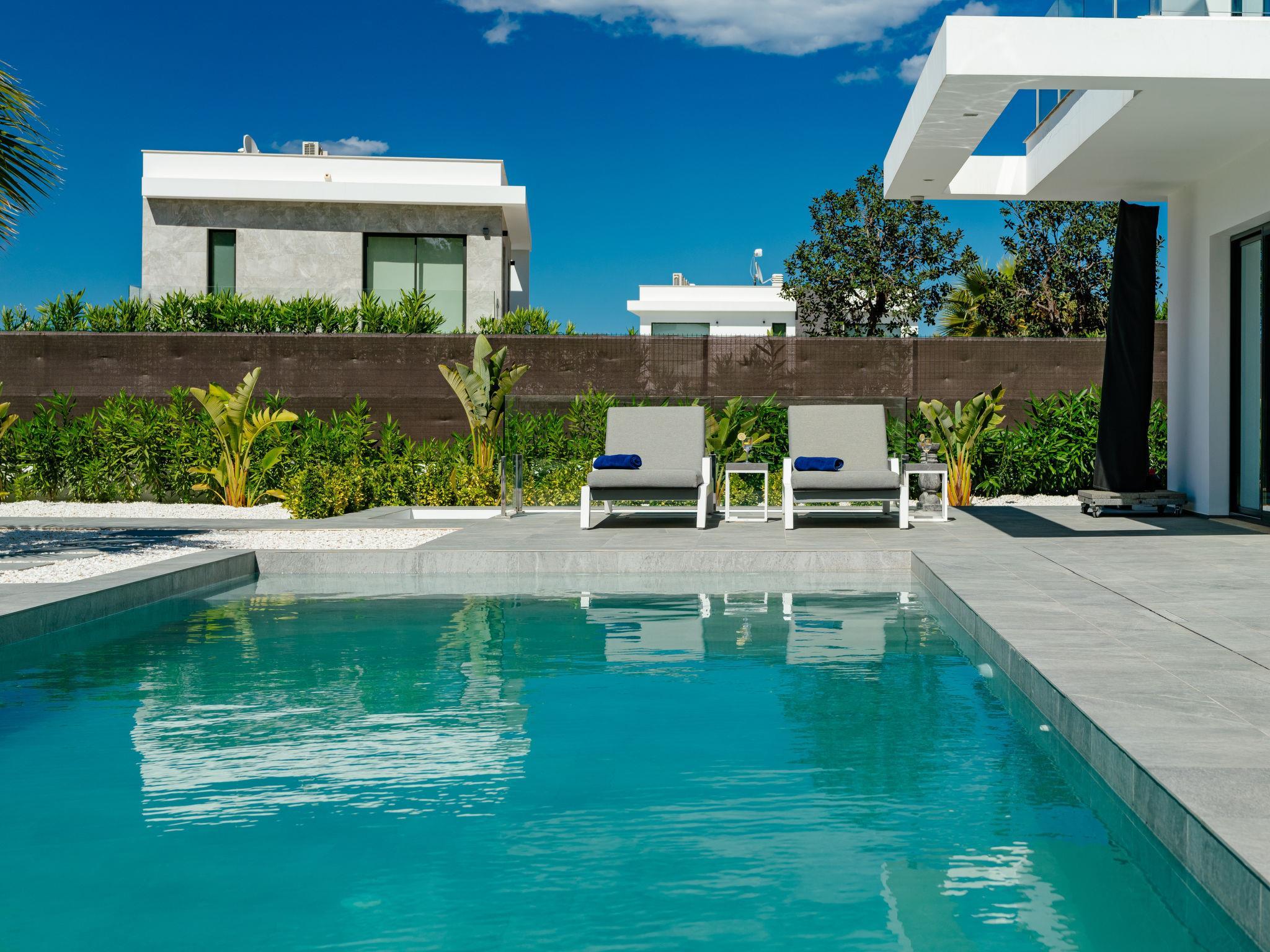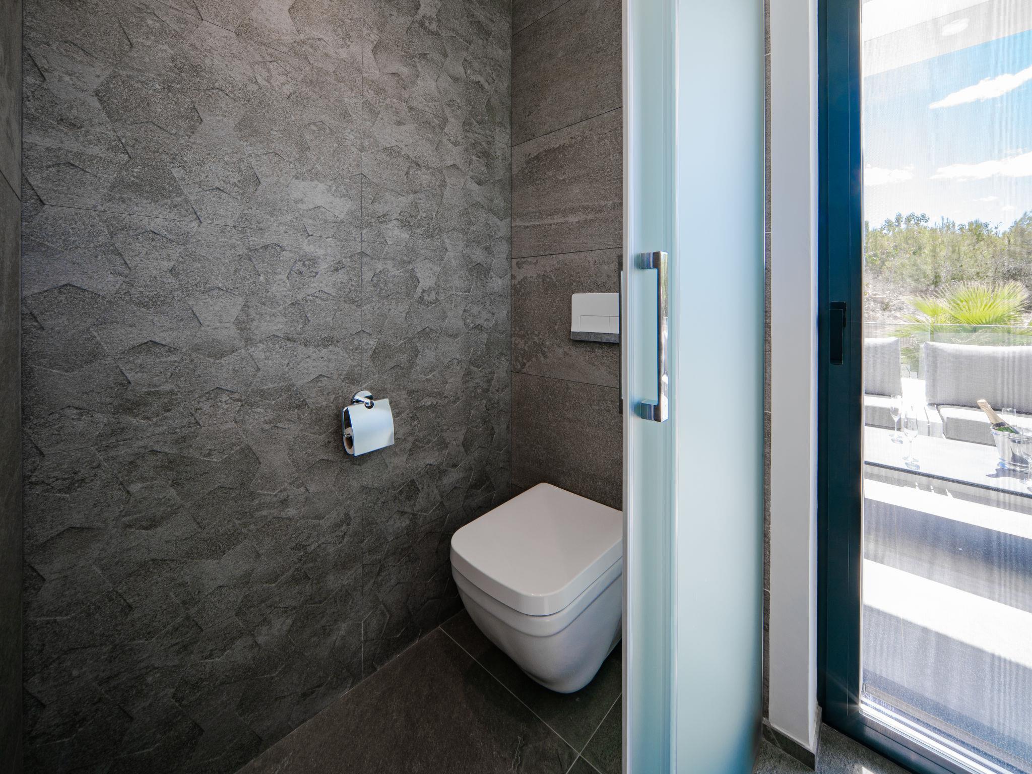 "Villa Palma", 4-room villa 200 m2 on 2 levels. Spacious and bright, very modern and stylish furnishings: living/dining room with satellite TV, air conditioning and forced-air heating. Exit to the patio, to the swimming pool. 1 room with 1 french bed (180 cm, length 200 cm), shower/WC, air conditioning and forced-air heating. Exit to the patio, to the swimming pool. Large, open kitchen (oven, dishwasher, 5 induction hot plates, toaster, microwave, freezer, electric coffee machine, Capsules for coffee machine (Dolce Gusto)) with bar, dining table, air conditioning and forced-air heating. Exit to the patio, to the swimming pool. Sep. WC. Upper floor: 1 room with Dressing room with 1 french bed (180 cm, length 200 cm), shower, shower/WC and double hand-basin. Exit to the terrace. 1 room with 1 french bed (160 cm, length 200 cm), shower/WC, air conditioning and forced-air heating. Exit to the terrace. Large terrace, large patio. Terrace furniture, barbecue, deck chairs (4), covered balcony, sitting area. Facilities: washing machine, dryer, iron, children's high chair, baby cot, hair dryer. Internet (WiFi, free). Parking (2 cars). Please note: non-smoking house. Please note: Kitchen with two ovens, Quooker System for hot, cold and boiling water, wine cellar available to guests. VT-502065-A // Reg. Nr.: ESFCTU00000307100060457100000000000000000VT-502065-A9