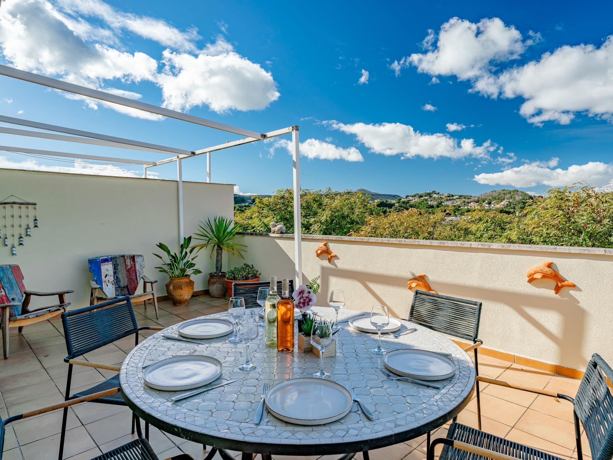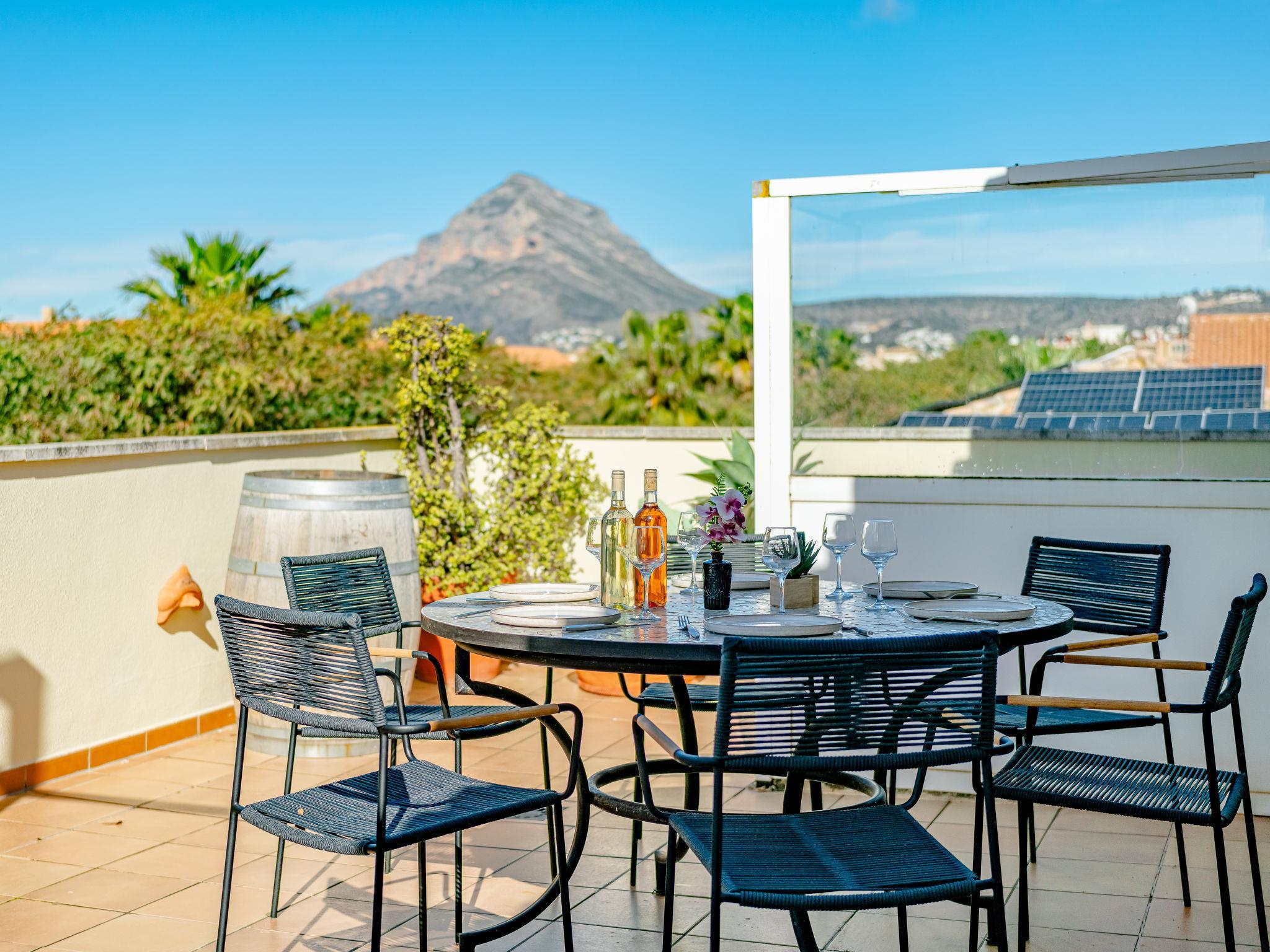 "Jardines del Pla", 4-room maisonette 180 m2 on 2 levels. Spacious and bright, very beautiful and stylish furnishings: living/dining room with digital TV, air conditioning and forced-air heating. Exit to the terrace. 1 room 12 m2 with 1 french bed (180 cm, length 200 cm), shower/bidet/WC, air conditioning and forced-air heating. 1 room with 2 beds (80 cm, length 200 cm), air conditioning and forced-air heating. Large kitchen (oven, dishwasher, 4 ceramic glass hob hotplates, toaster, microwave, freezer, electric coffee machine, Capsules for coffee machine (Nespresso Not.Incl.)). Shower/WC. Floor heating. Upper floor: 1 room with 1 french bed (2 x 90 cm, length 200 cm), air conditioning and forced-air heating. Exit to the terrace. Bath/bidet/WC. Floor heating. Large terrace 45 m2, roofed, east facing position, large terrace 60 m2, south facing position. Terrace furniture, deck chairs, covered balcony. Very beautiful view of the mountains, the valley, the swimming pool and the garden. Facilities: washing machine, iron, hair dryer. Internet (WiFi, free). Garage. Please note: non-smoking house. TV only ES. AT-502454-A // Reg. Nr.: ESFCTU00000307100061367200000000000000000AT-502454-A6