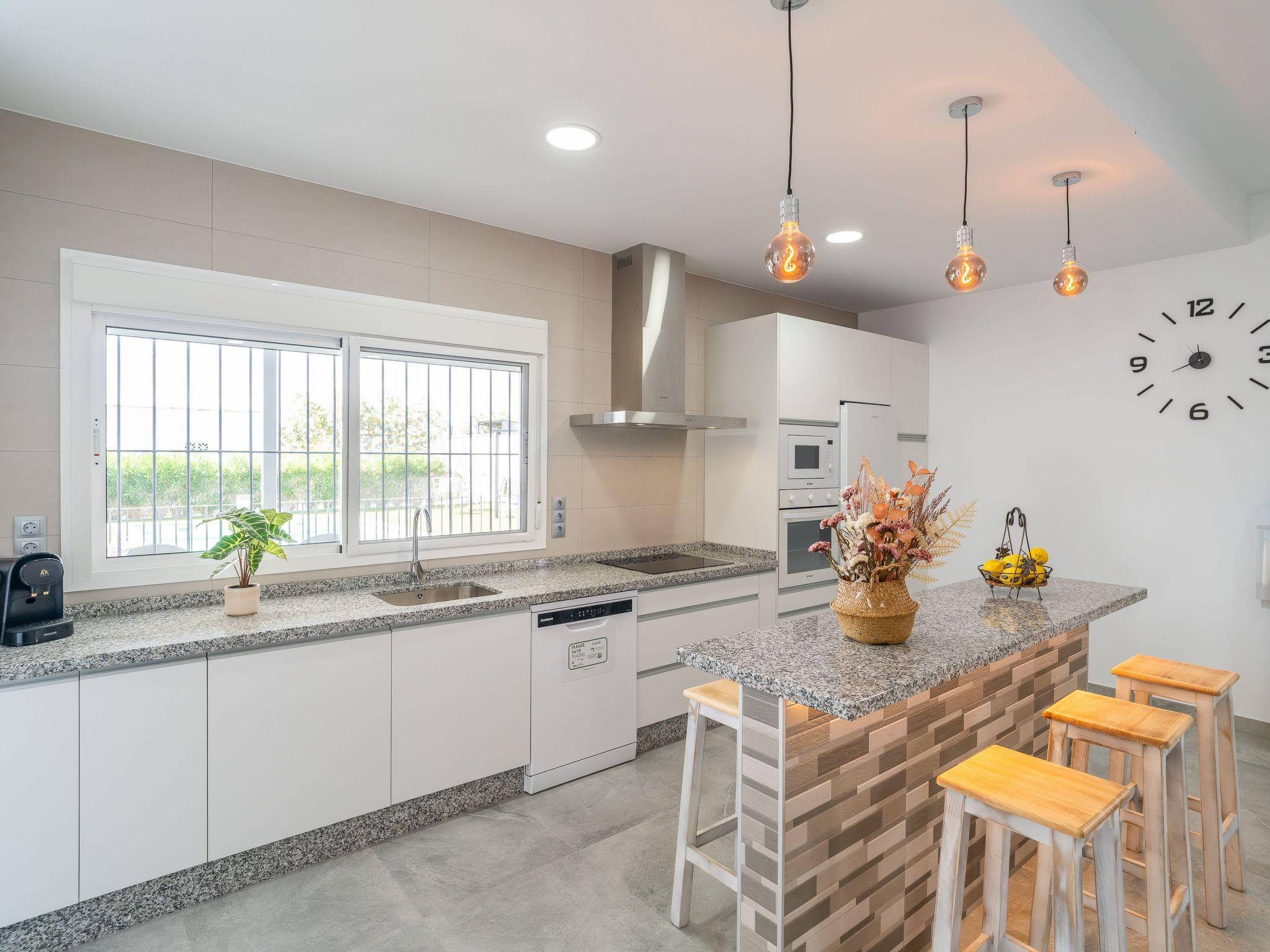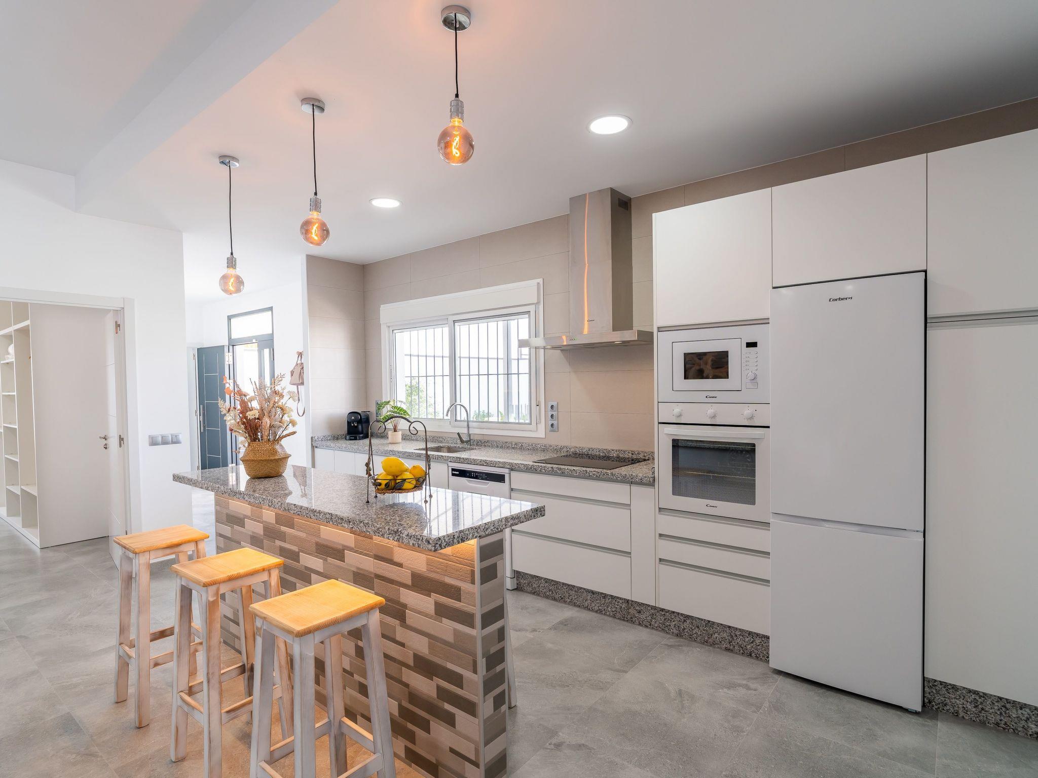 Kitchen open to the living room with ceramic hob, microwave, fridge, oven, dishwasher, hot/cold water dispenser,...