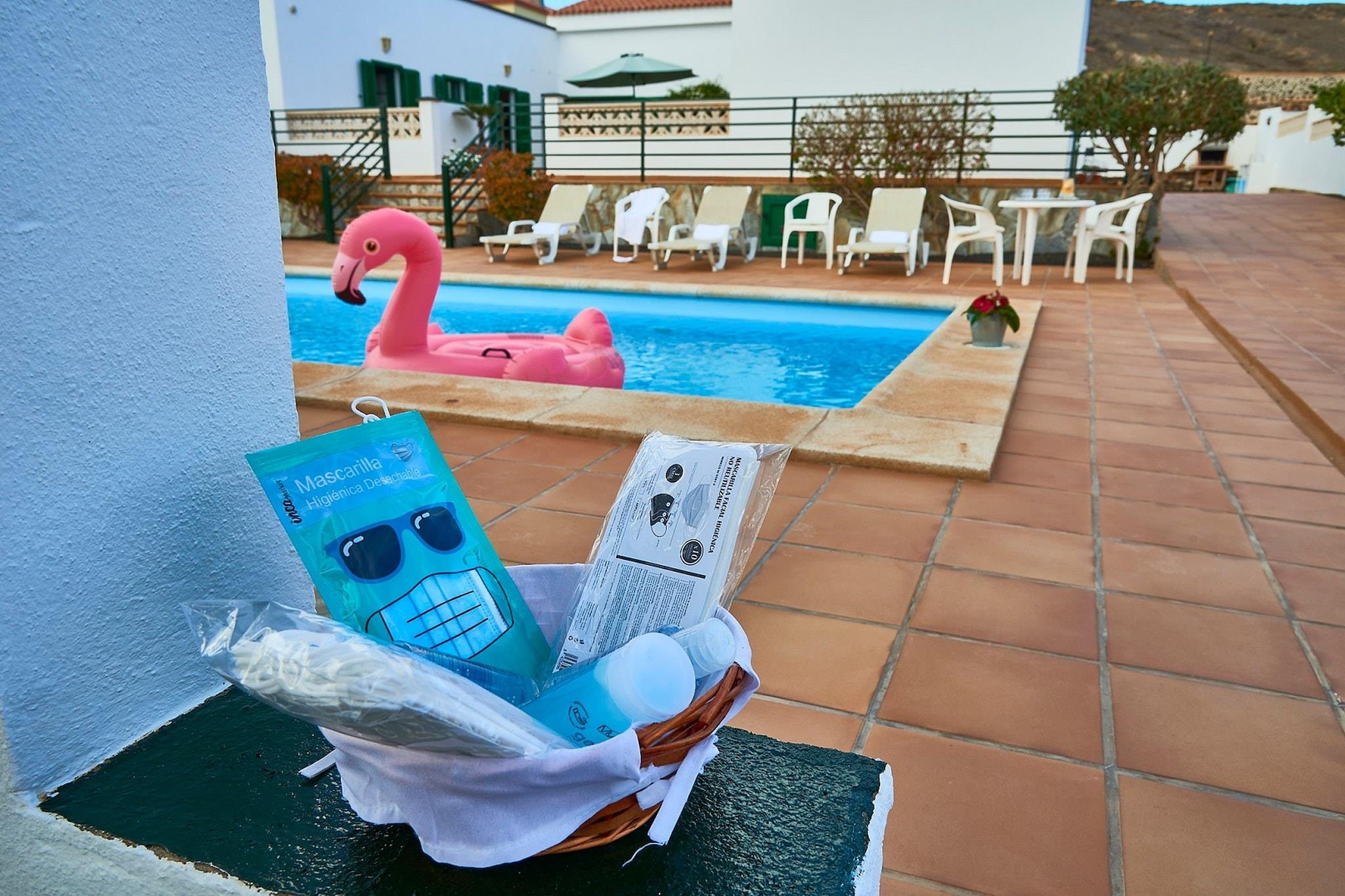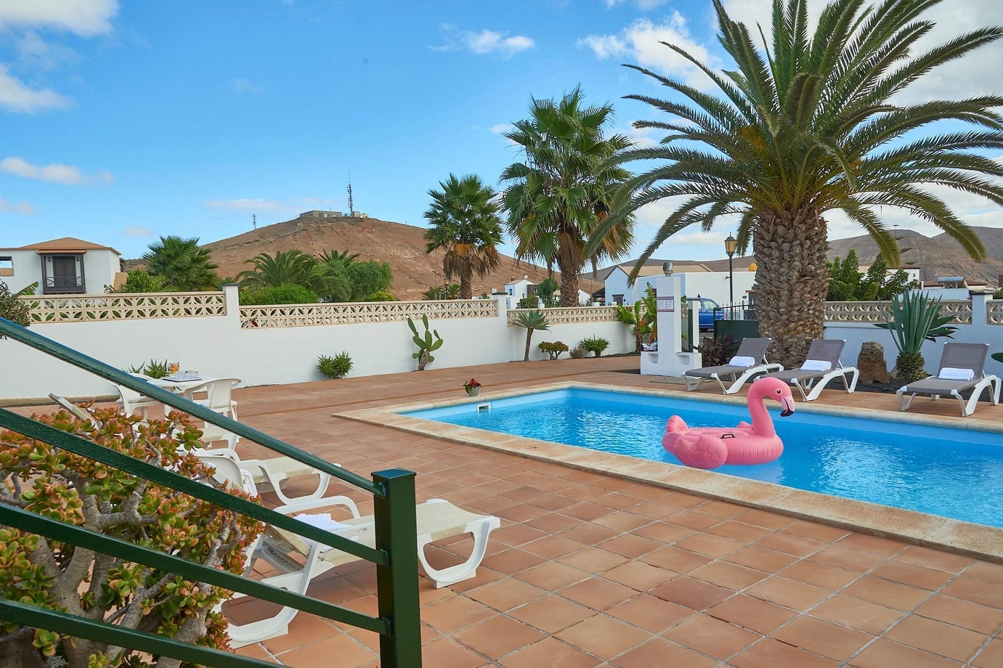 Detta rymliga hus inbjuder dig att njuta av en underbar semester i Fuerteventura. Det goda vädret under hela året och det lugna läget, borta från liv och rörelse i turistattraktioner, är bara några av fördelarna med denna underbara plats. Huset är byggt i en U-form, med två terrasser i mitten; perfekt för frukost eller middag med utsikt över vulkanen. Den magnifika saltvattenpoolen har ett termiskt system som gör den halvuppvärmd så att du kan njuta av den året runt. La Oliva ligger 1 km bort, det är en liten stad norr om Fuerteventura. När du reser runt i området kan du njuta av vacker utsikt över det extraordinära vulkanlandskapet. Den närmaste stranden ligger i öster, i Barranco de Tinojay (13,5 km). För en vacker solnedgång måste du utan tvekan gå västerut; rekommenderas El Cotillo (16 km) med en vacker robust kust med dolda stränder där du kan se solen gömma sig i havet. I staden finns det flera restauranger som avslutar dagen med en utsökt tallrik med färsk fisk. För mer underhållning, besök den berömda kuststaden Corralejo, 15 km bort. Turistiskt, ja, men öns paradis för surfare. För mer erfarna surfare finns i norr många andra platser att erövra vågorna.