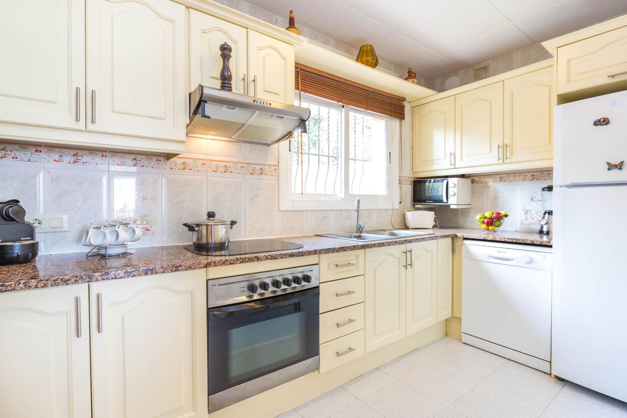Vardagsrum(TV(satellit), matbord, öppen spis, sitthörna), Kök(brödrost, kaffebryggare, ugn, mikrovågsugn, diskmaskin, kylskåp, frys, ), sovrum(dubbelsäng), sovrum(dubbelsäng), sovrum(enkelsäng, enkelsäng), badrum(dusch), badrum(dusch), Tillgång till Internet, tvättmaskin, värme, terrass, trädgård, grill, parkering, swimmingpool(privat), strykjärn