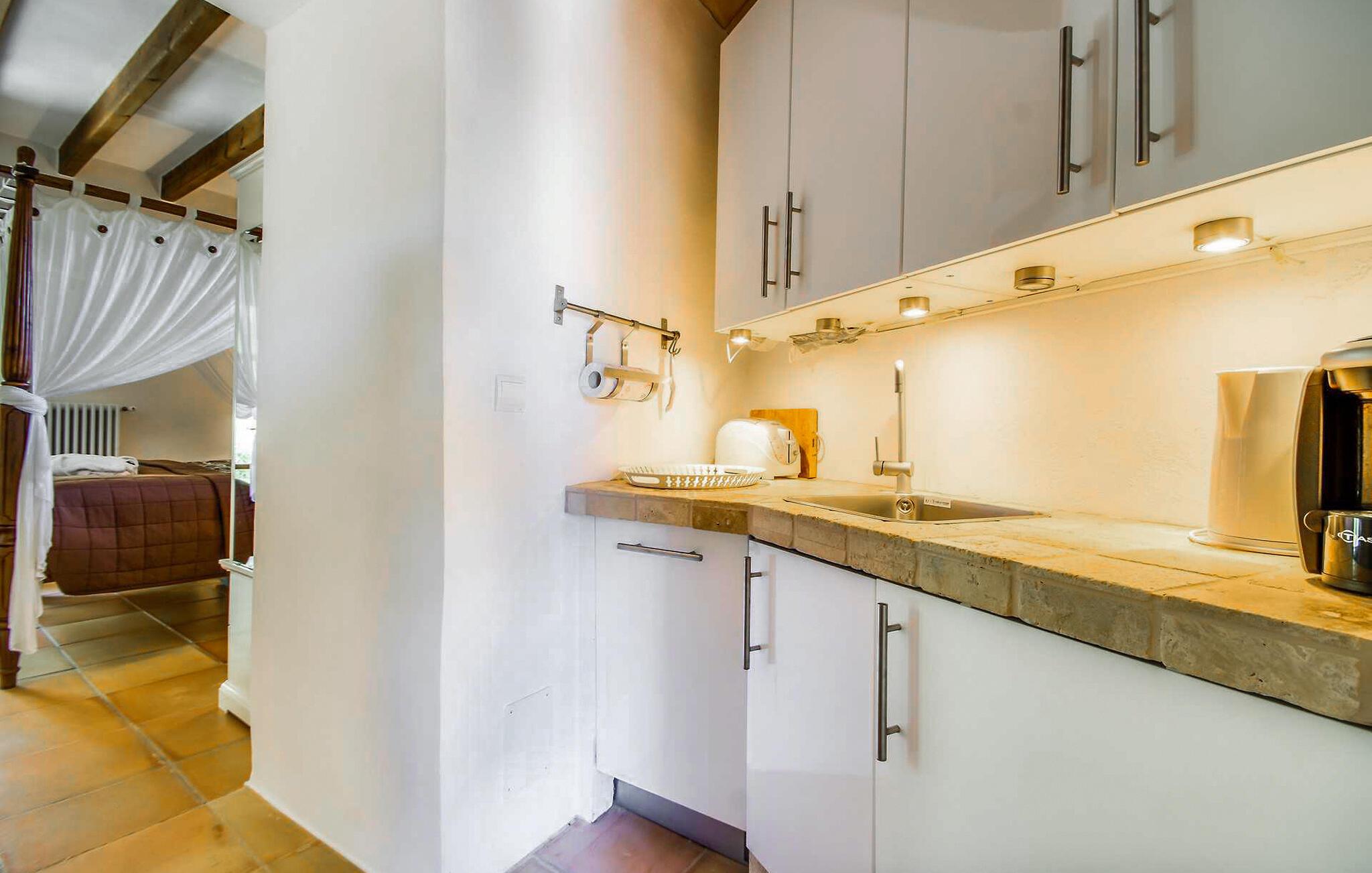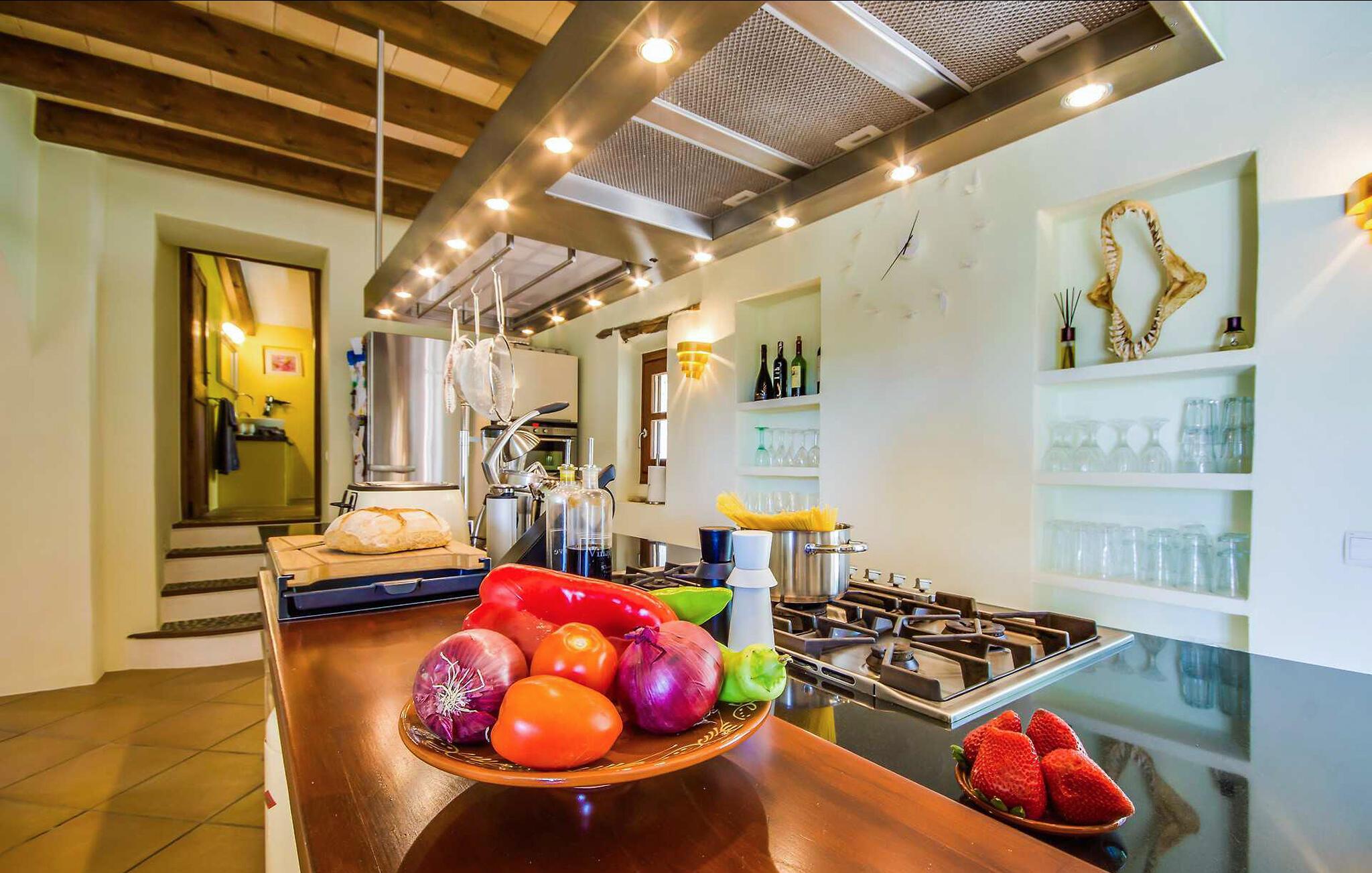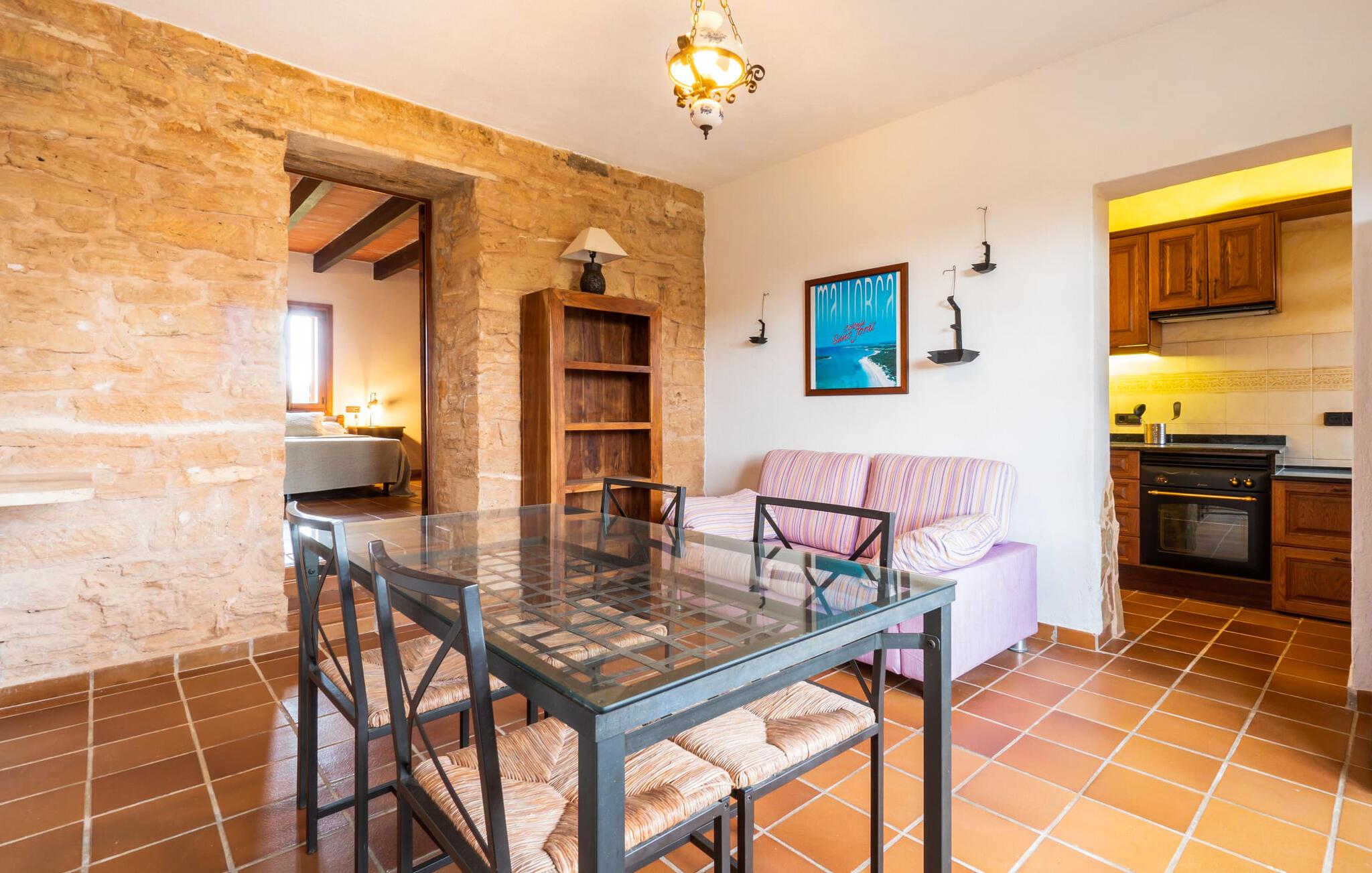 En av höjdpunkterna är det välutrustade köket i högglans där flera amatörkockar kan äta och diskutera tillsammans. Skräddarsydda skulpturer och färgstarka målningar av den kubanske konstnären Ernesto Rodriguez skapar en lyckad kontrast till historiska kuriositeter i det rymliga vardagsrummet: Delar av en gammal talayot är inbäddade i byggnadens grundmurar. Vardagsrummet med sina mysiga fåtöljer och en stor Smart TV (med 300 tyska kanaler) inbjuder till att dröja sig kvar.