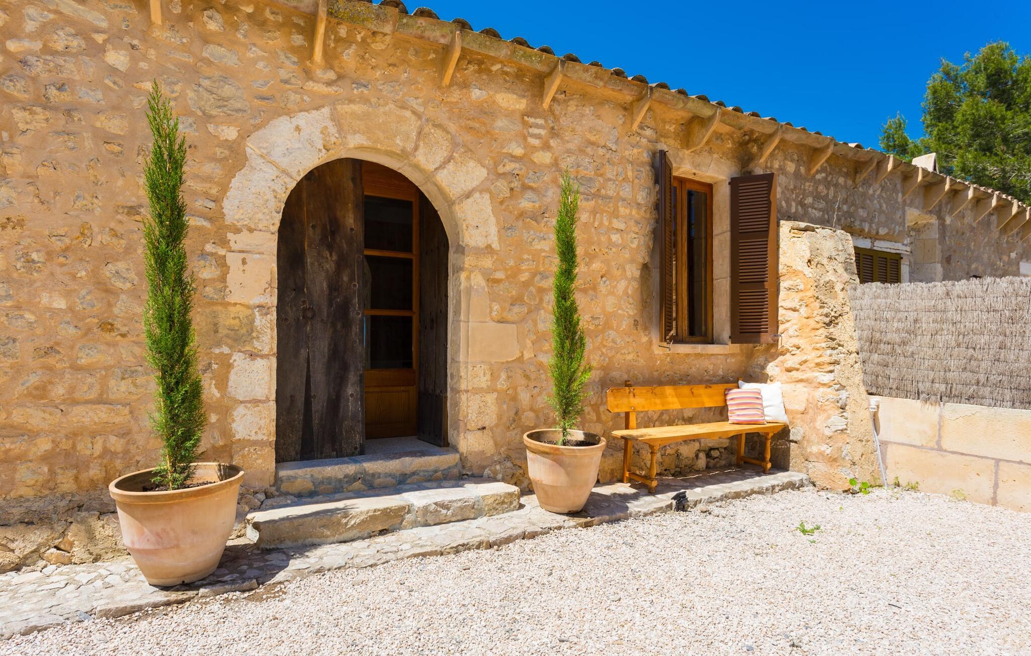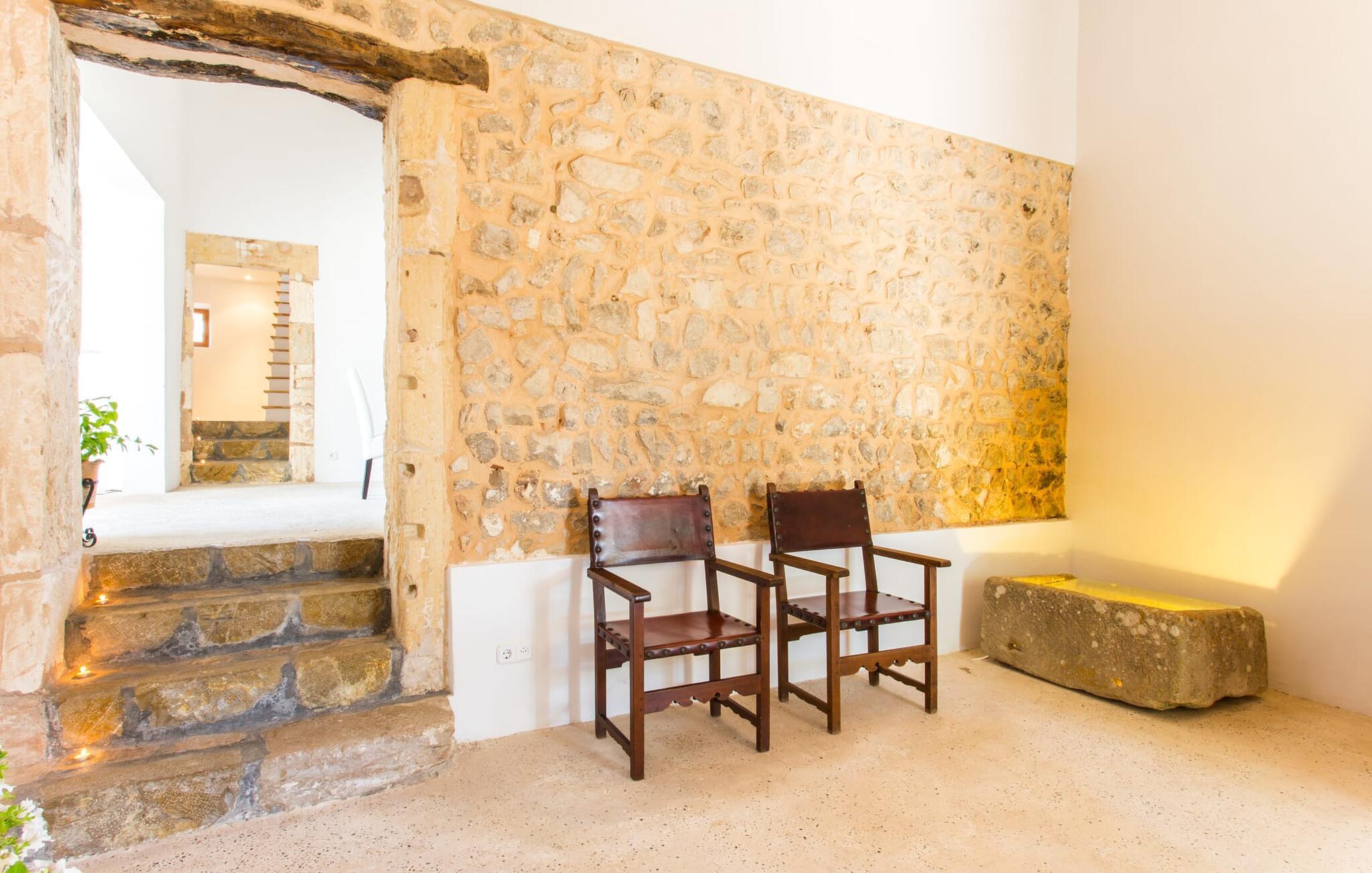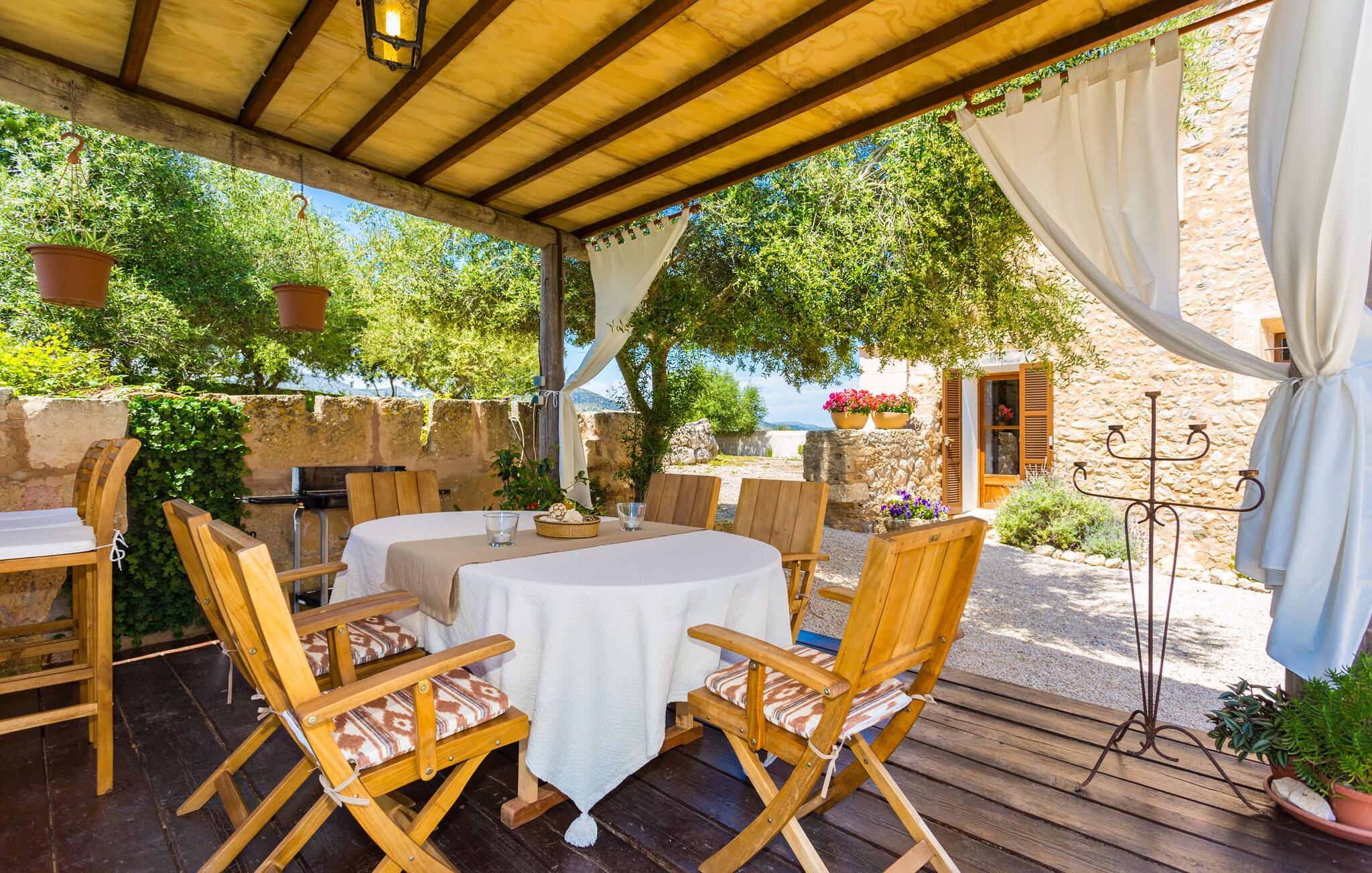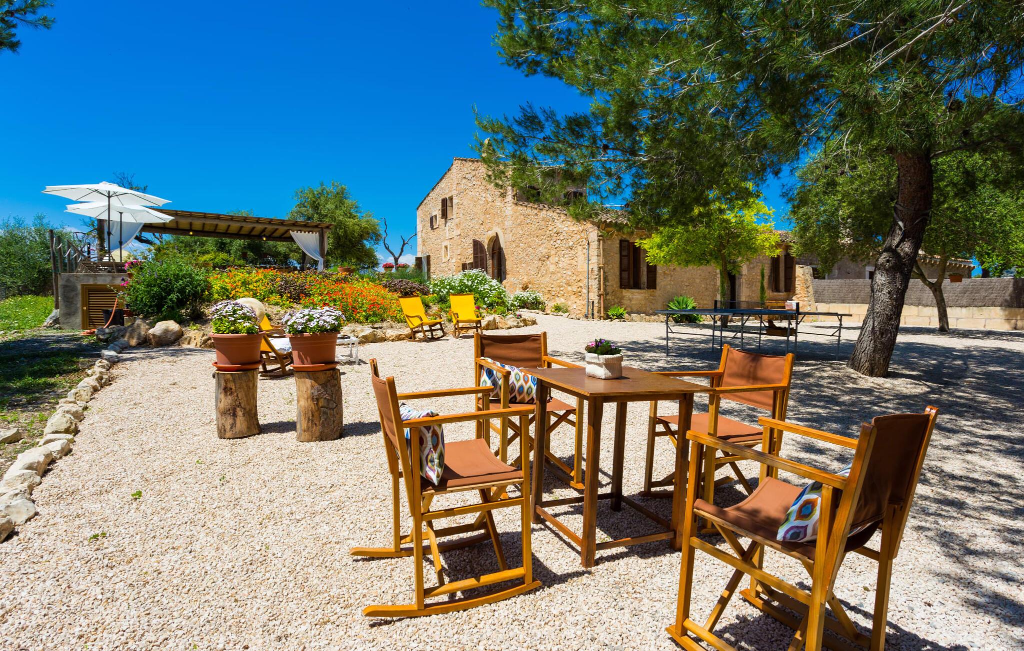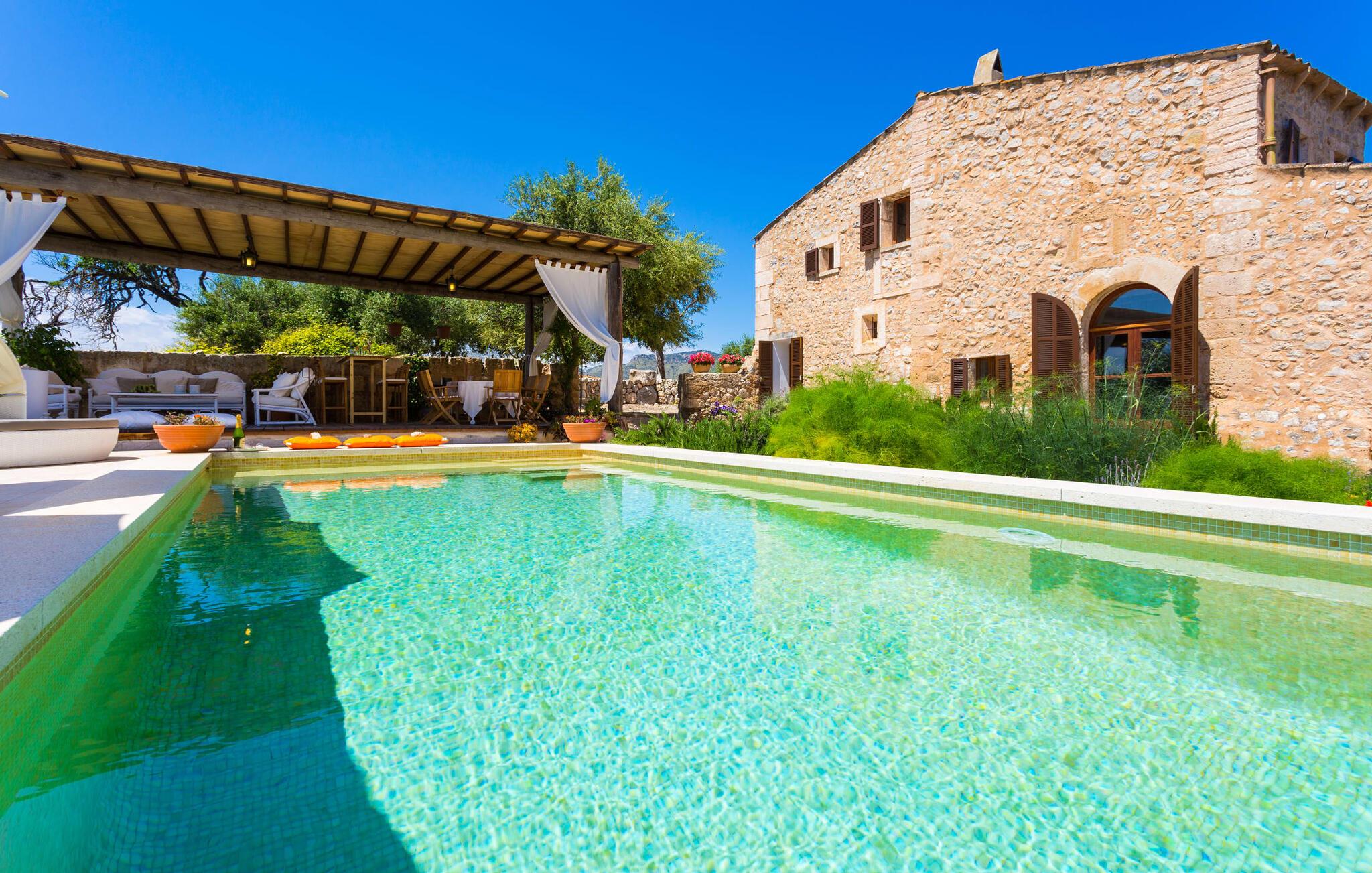 Villa Llucamar är en särskilt charmig fastighet som, bland många andra, framför allt imponerar med sin kärleksfulla inredning och traditionella arkitektur. Det grundades på 1200-talet och tillhörde en gång greve Ayamans, en ättling till James I, erövraren av Mallorca. Så snart man anländer inser man att man verkligen kan känna sig som hemma här: Det här är en smakfull plats att bo på, med en inbjudande modern men ändå typiskt mallorkinsk atmosfär. Utomhusområdet kännetecknas av dekorativa stigar, blomsterrabatter med medelhavsväxter och en mängd olika terrasser. Det vackra poolområdet erbjuder fantastisk utsikt över kullarna på östra delen av ön. Poolen är kaklad med en ljusgrön mosaik och kan lätt nås via trappan ingången. Sex solstolar och två parasoller är den perfekta utrustningen för soldyrkare, som kan koppla av här under Medelhavssolen och lämna vardagen bakom sig. På terrassen, som är täckt med naturmaterial, kan du antingen sitta bekvämt med en drink i den lilla loungehörnan eller njuta av en nylagad måltid vid matbordet. Under varma kvällar serveras smakrika grillkvällar där du kan tillaga och njuta av lokala ingredienser. Andra sittmöjligheter varierar runt fastigheten och ger möjlighet att hitta nya platser att koppla av på, plus att det är lätt att stuva undan.