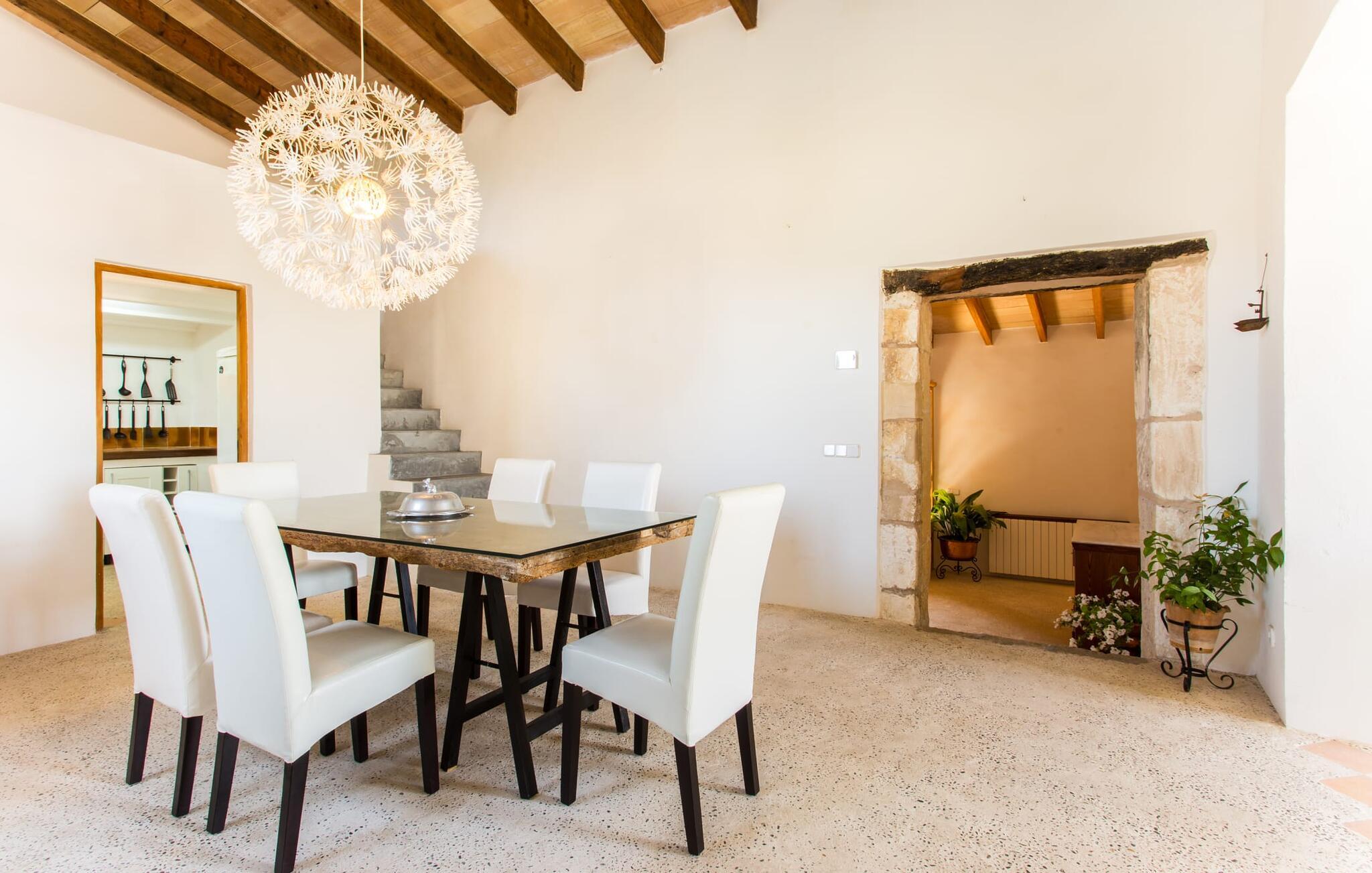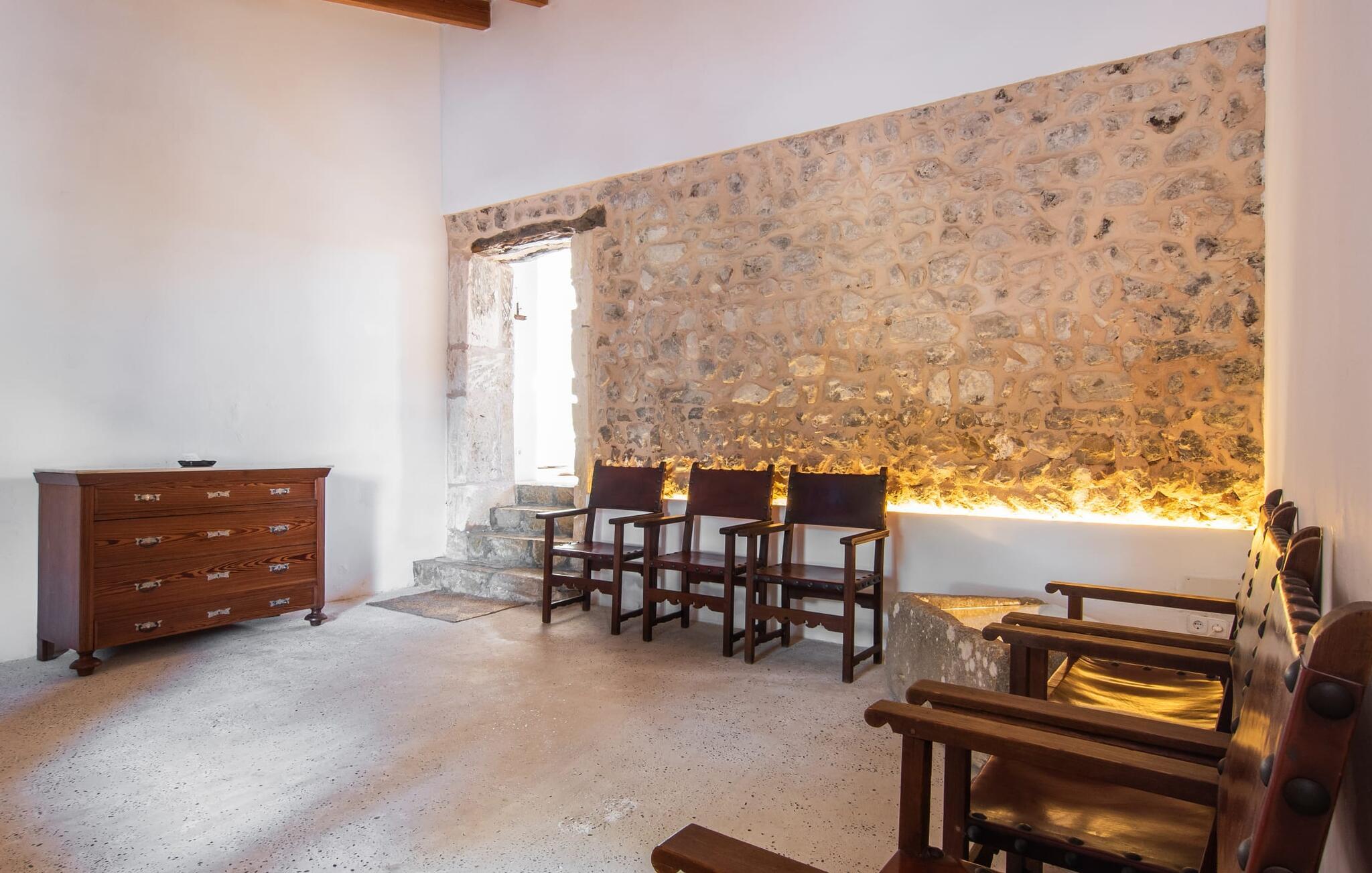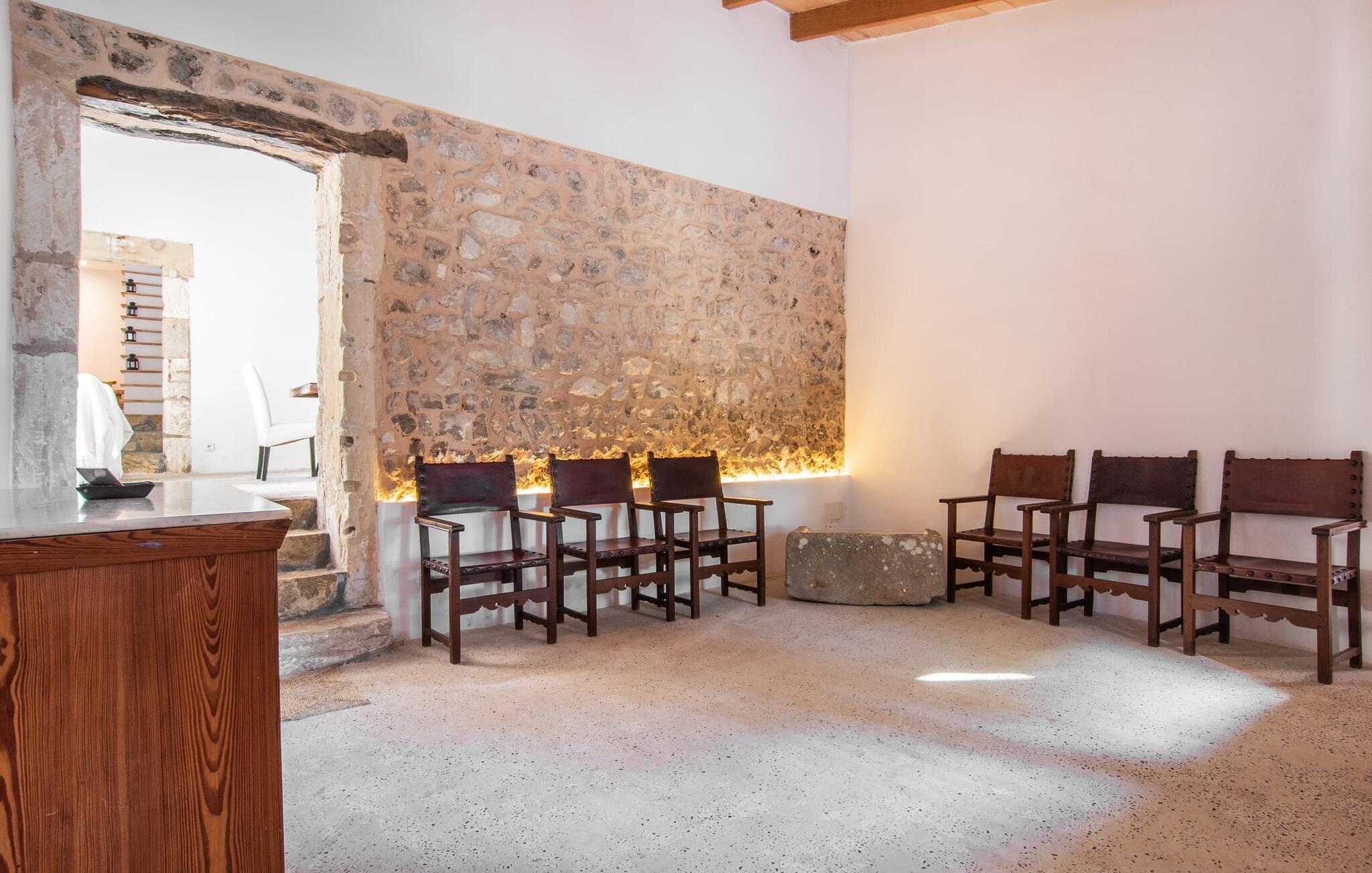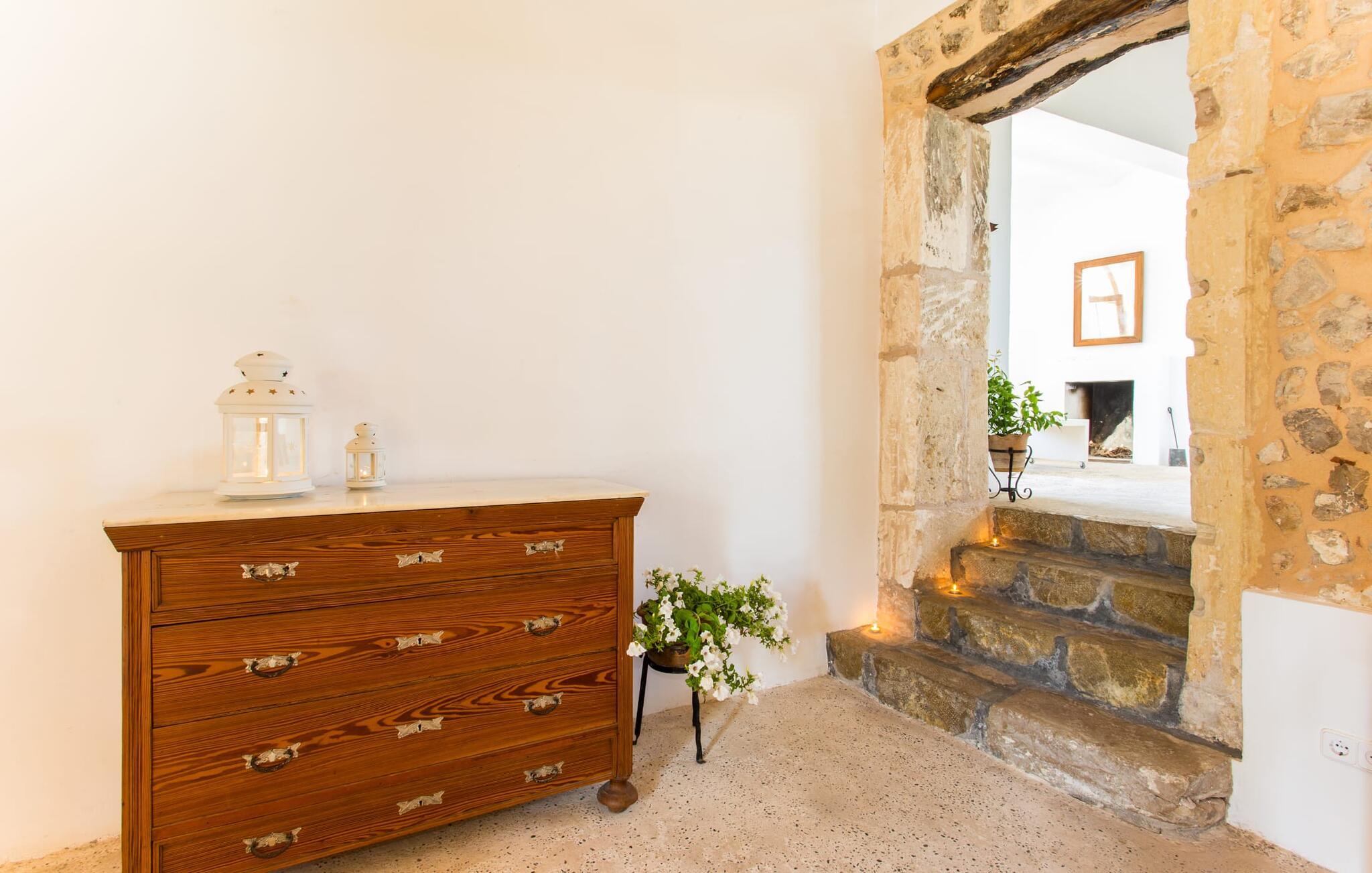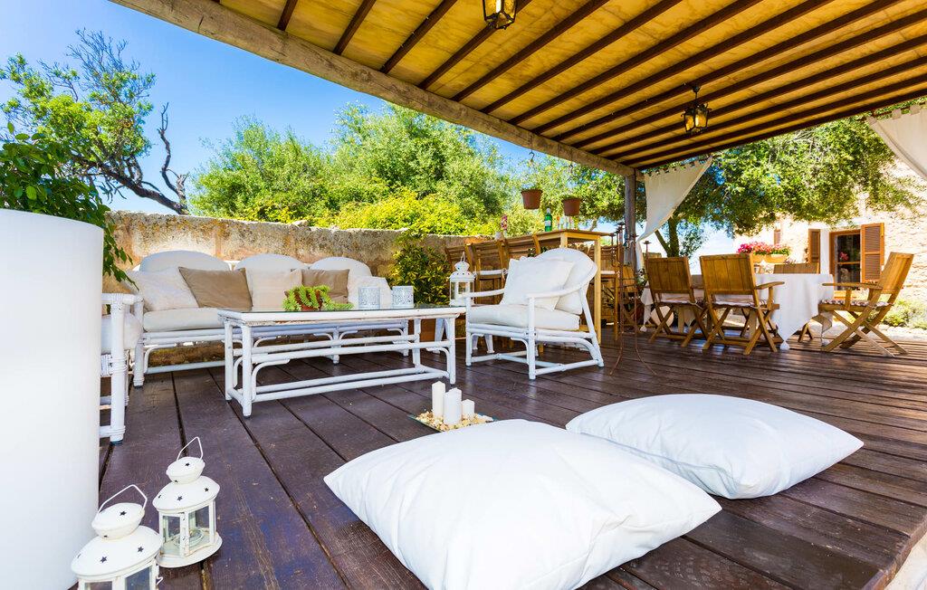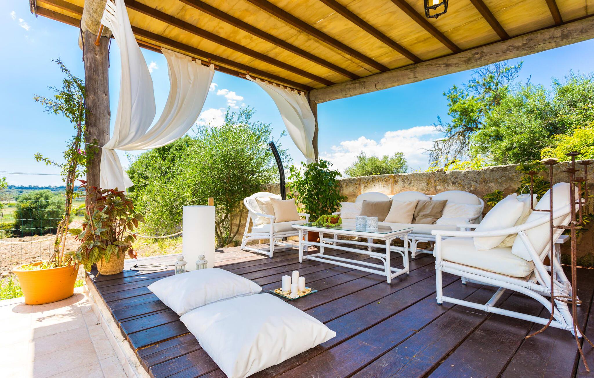 Villa Llucamar är en särskilt charmig fastighet som, bland många andra, framför allt imponerar med sin kärleksfulla inredning och traditionella arkitektur. Det grundades på 1200-talet och tillhörde en gång greve Ayamans, en ättling till James I, erövraren av Mallorca. Så snart man anländer inser man att man verkligen kan känna sig som hemma här: Det här är en smakfull plats att bo på, med en inbjudande modern men ändå typiskt mallorkinsk atmosfär. Utomhusområdet kännetecknas av dekorativa stigar, blomsterrabatter med medelhavsväxter och en mängd olika terrasser. Det vackra poolområdet erbjuder fantastisk utsikt över kullarna på östra delen av ön. Poolen är kaklad med en ljusgrön mosaik och kan lätt nås via trappan ingången. Sex solstolar och två parasoller är den perfekta utrustningen för soldyrkare, som kan koppla av här under Medelhavssolen och lämna vardagen bakom sig. På terrassen, som är täckt med naturmaterial, kan du antingen sitta bekvämt med en drink i den lilla loungehörnan eller njuta av en nylagad måltid vid matbordet. Under varma kvällar serveras smakrika grillkvällar där du kan tillaga och njuta av lokala ingredienser. Andra sittmöjligheter varierar runt fastigheten och ger möjlighet att hitta nya platser att koppla av på, plus att det är lätt att stuva undan.