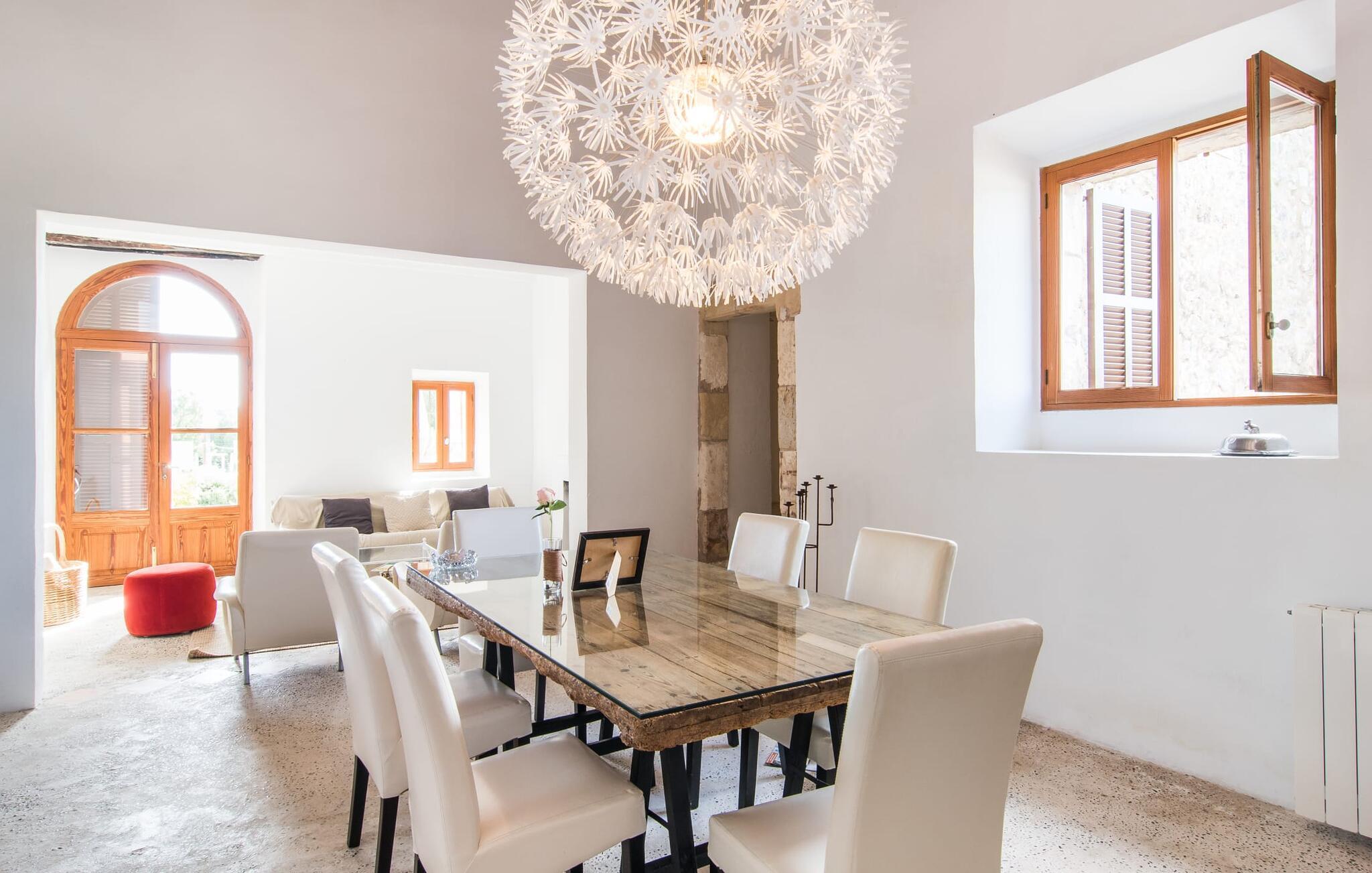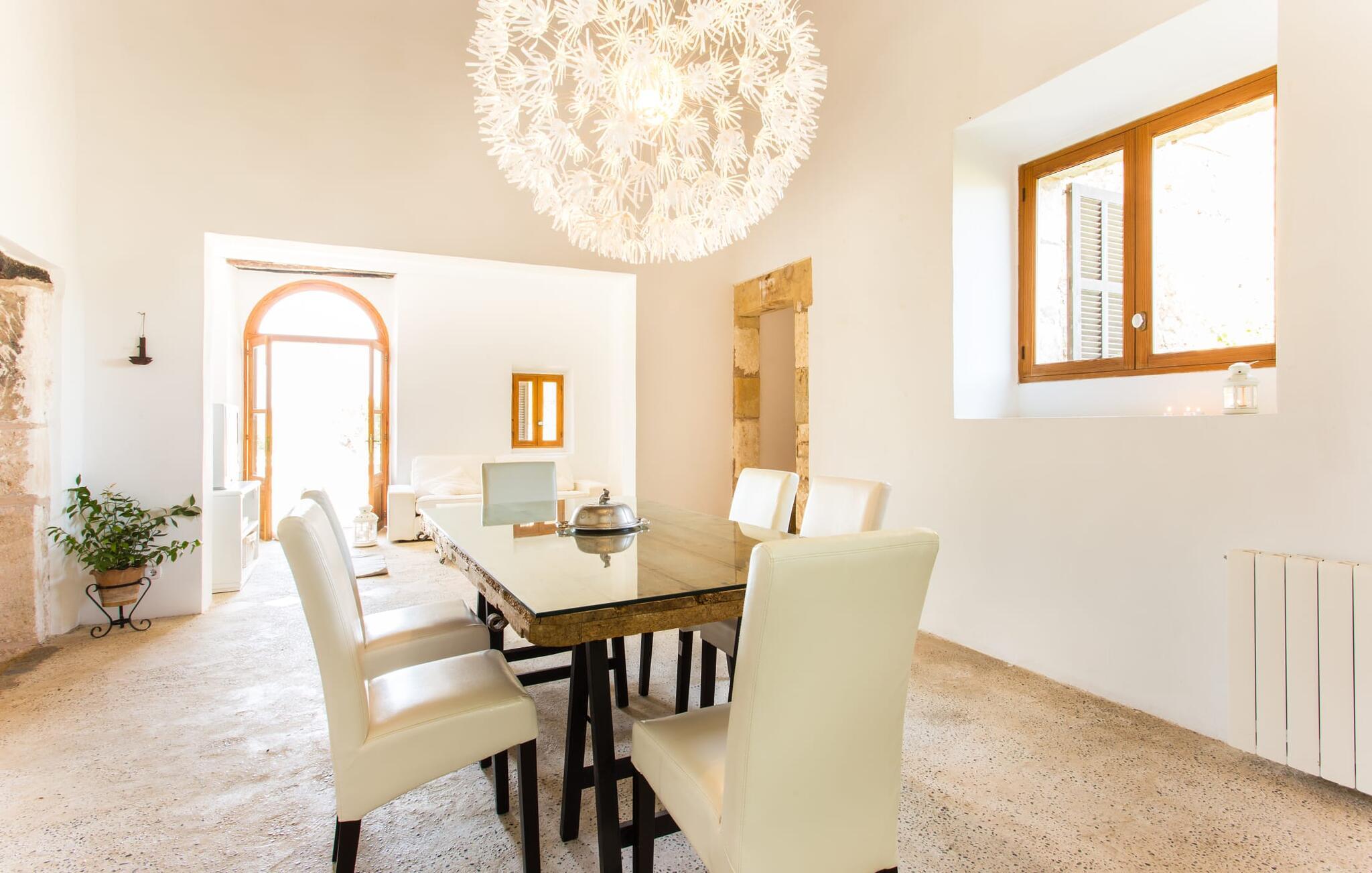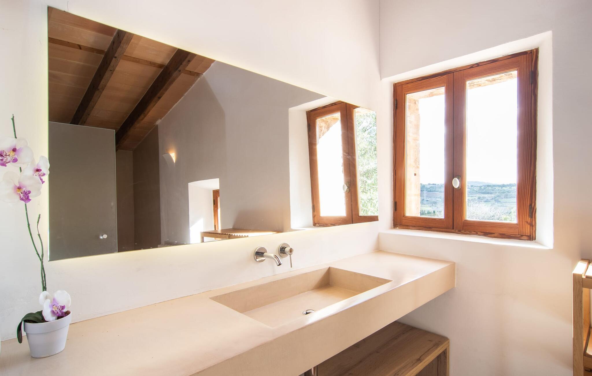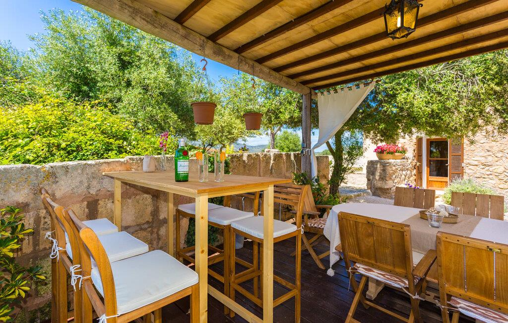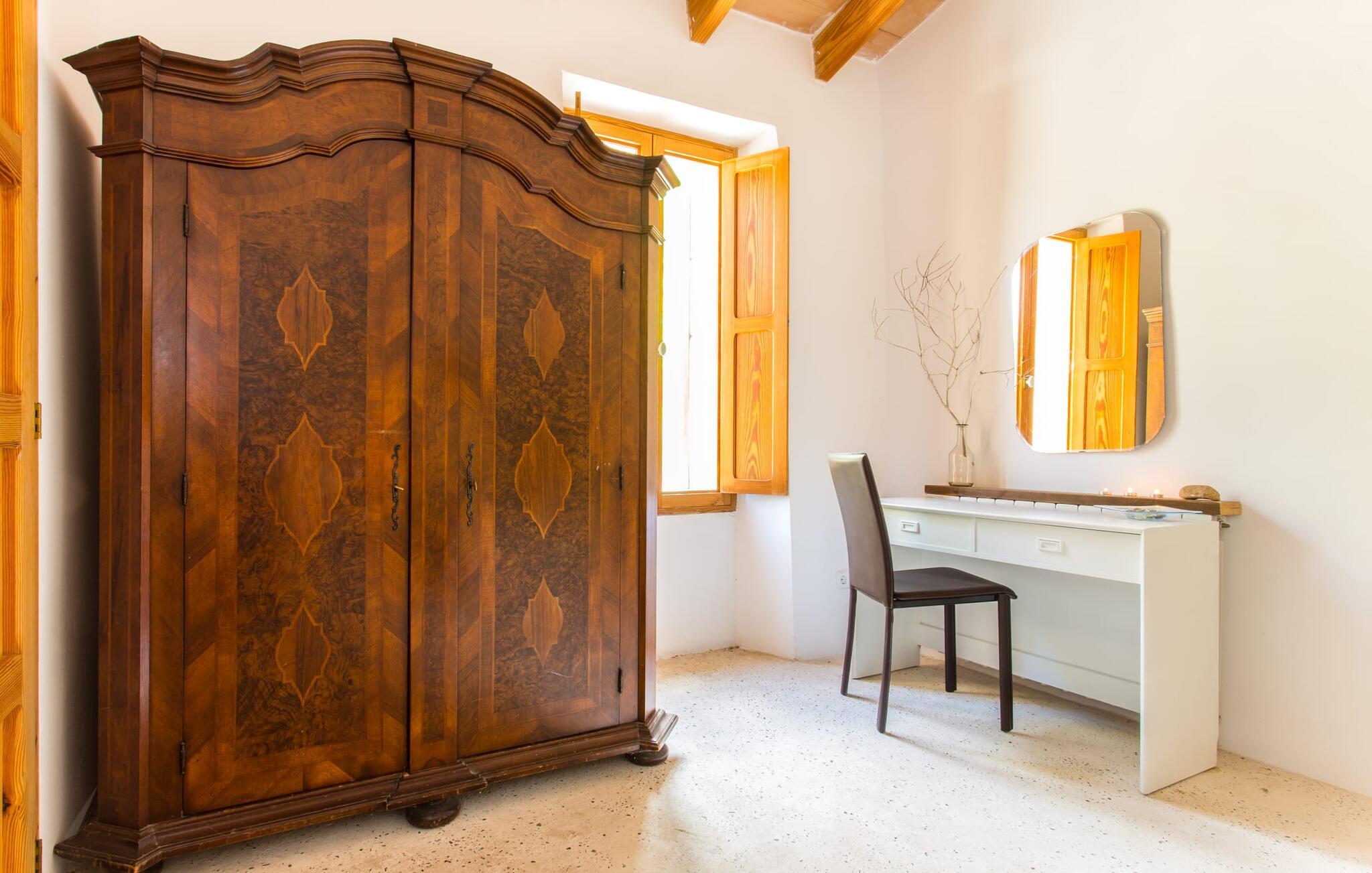 Villa Llucamar är en särskilt charmig fastighet som, bland många andra, framför allt imponerar med sin kärleksfulla inredning och traditionella arkitektur. Det grundades på 1200-talet och tillhörde en gång greve Ayamans, en ättling till James I, erövraren av Mallorca. Så snart man anländer inser man att man verkligen kan känna sig som hemma här: Det här är en smakfull plats att bo på, med en inbjudande modern men ändå typiskt mallorkinsk atmosfär. Utomhusområdet kännetecknas av dekorativa stigar, blomsterrabatter med medelhavsväxter och en mängd olika terrasser. Det vackra poolområdet erbjuder fantastisk utsikt över kullarna på östra delen av ön. Poolen är kaklad med en ljusgrön mosaik och kan lätt nås via trappan ingången. Sex solstolar och två parasoller är den perfekta utrustningen för soldyrkare, som kan koppla av här under Medelhavssolen och lämna vardagen bakom sig. På terrassen, som är täckt med naturmaterial, kan du antingen sitta bekvämt med en drink i den lilla loungehörnan eller njuta av en nylagad måltid vid matbordet. Under varma kvällar serveras smakrika grillkvällar där du kan tillaga och njuta av lokala ingredienser. Andra sittmöjligheter varierar runt fastigheten och ger möjlighet att hitta nya platser att koppla av på, plus att det är lätt att stuva undan.