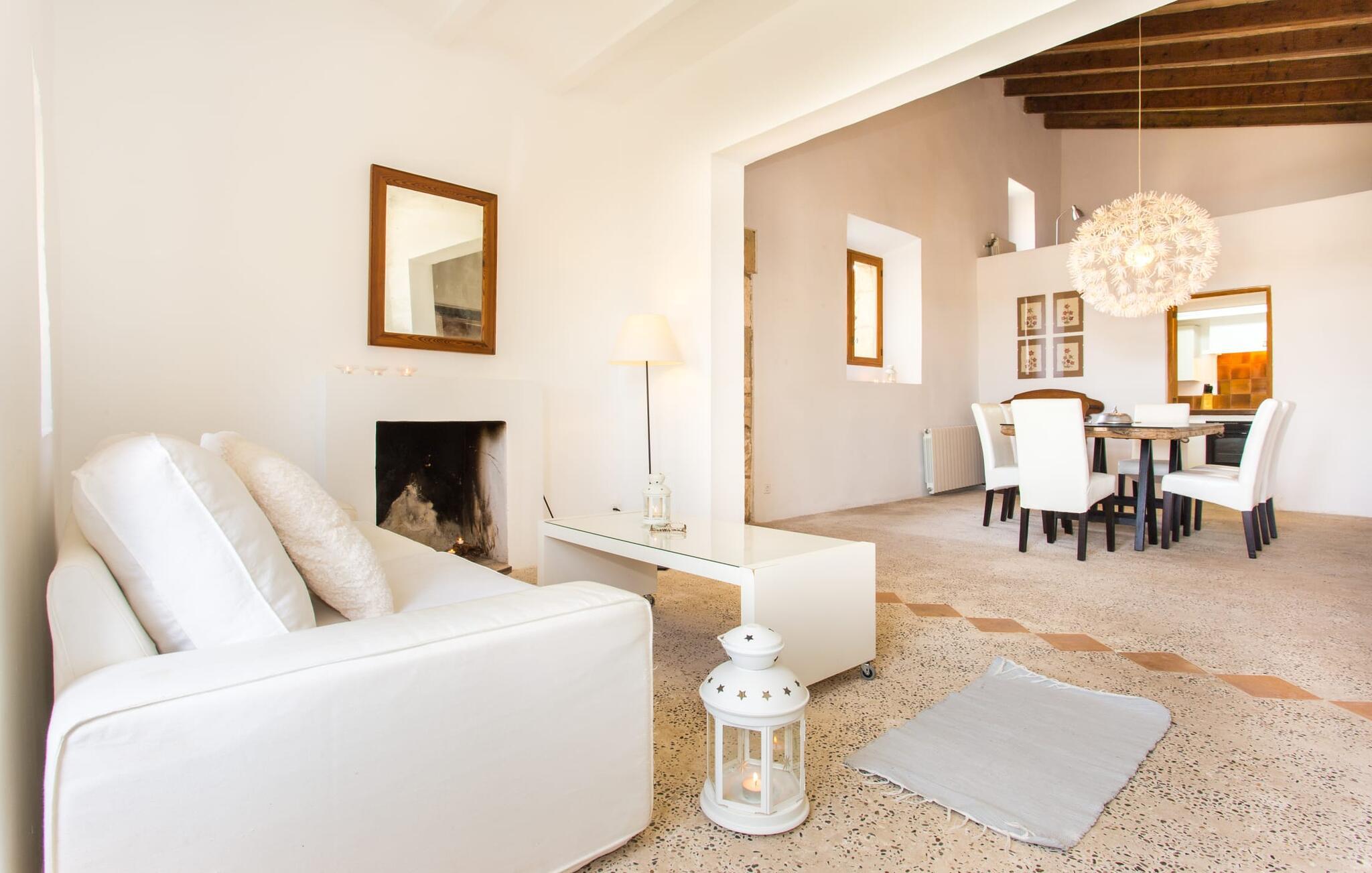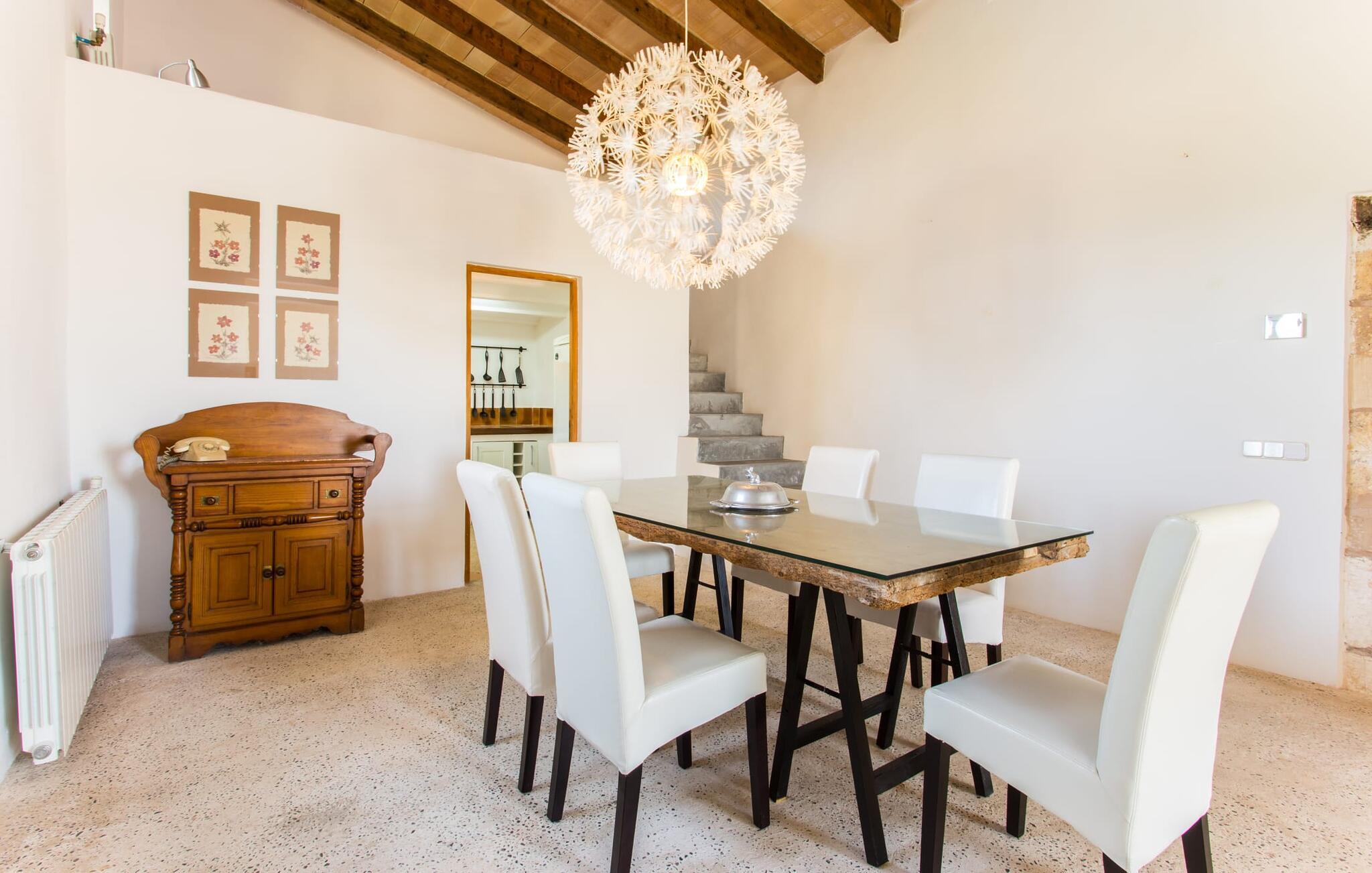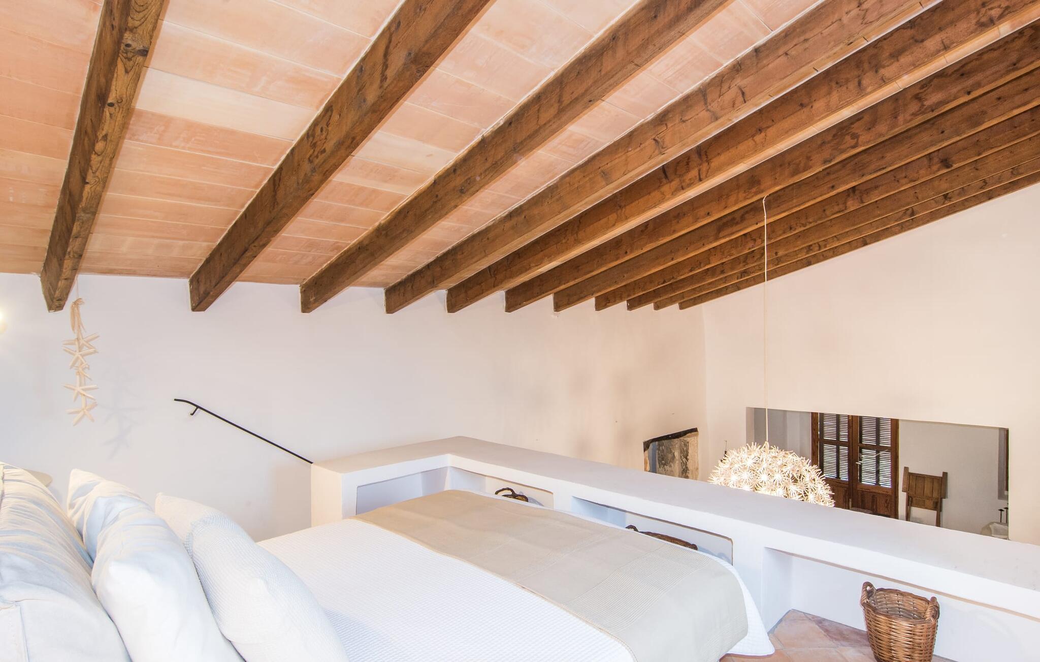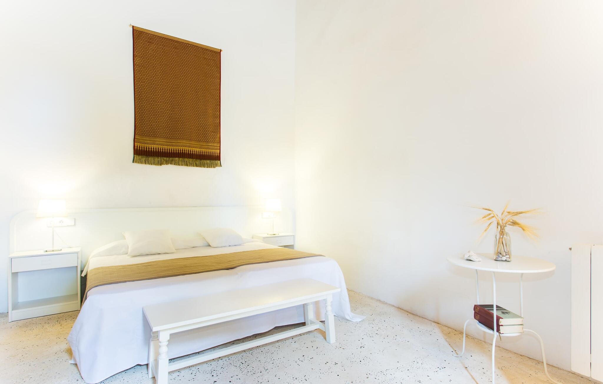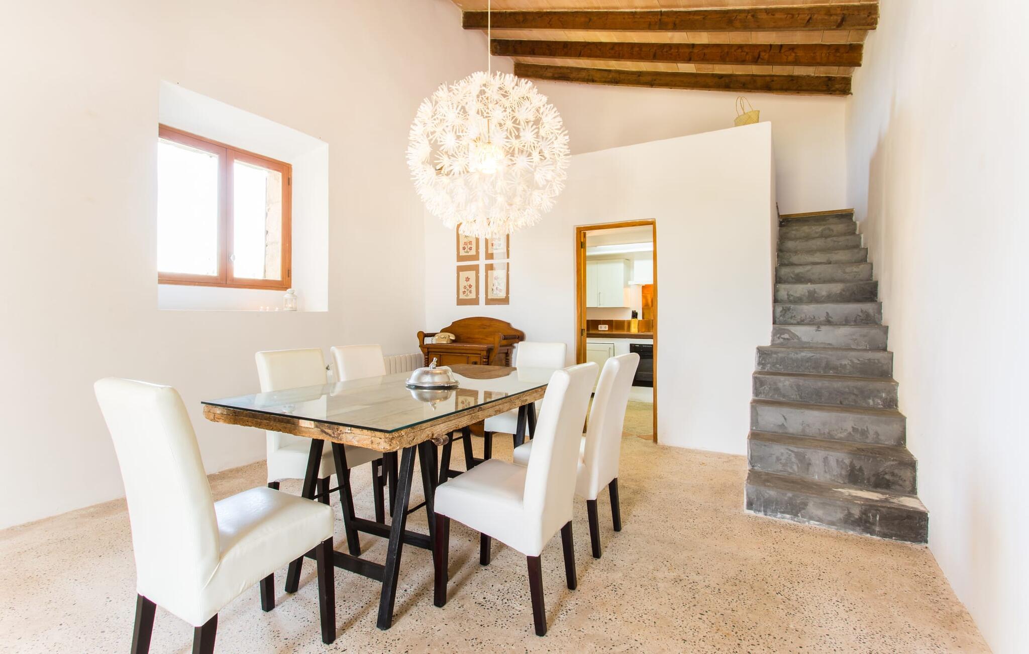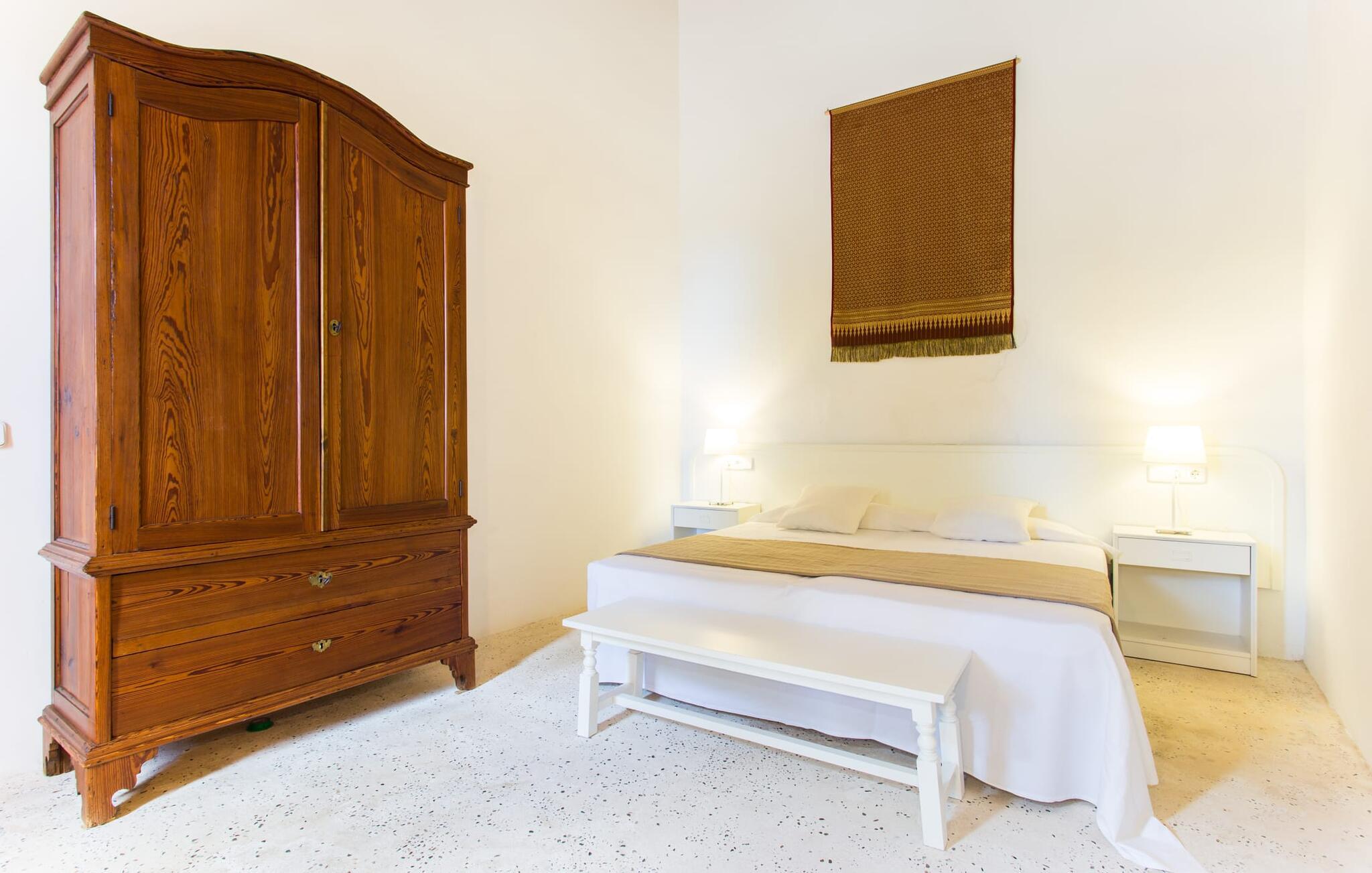 Villa Llucamar är en särskilt charmig fastighet som, bland många andra, framför allt imponerar med sin kärleksfulla inredning och traditionella arkitektur. Det grundades på 1200-talet och tillhörde en gång greve Ayamans, en ättling till James I, erövraren av Mallorca. Så snart man anländer inser man att man verkligen kan känna sig som hemma här: Det här är en smakfull plats att bo på, med en inbjudande modern men ändå typiskt mallorkinsk atmosfär. Utomhusområdet kännetecknas av dekorativa stigar, blomsterrabatter med medelhavsväxter och en mängd olika terrasser. Det vackra poolområdet erbjuder fantastisk utsikt över kullarna på östra delen av ön. Poolen är kaklad med en ljusgrön mosaik och kan lätt nås via trappan ingången. Sex solstolar och två parasoller är den perfekta utrustningen för soldyrkare, som kan koppla av här under Medelhavssolen och lämna vardagen bakom sig. På terrassen, som är täckt med naturmaterial, kan du antingen sitta bekvämt med en drink i den lilla loungehörnan eller njuta av en nylagad måltid vid matbordet. Under varma kvällar serveras smakrika grillkvällar där du kan tillaga och njuta av lokala ingredienser. Andra sittmöjligheter varierar runt fastigheten och ger möjlighet att hitta nya platser att koppla av på, plus att det är lätt att stuva undan.