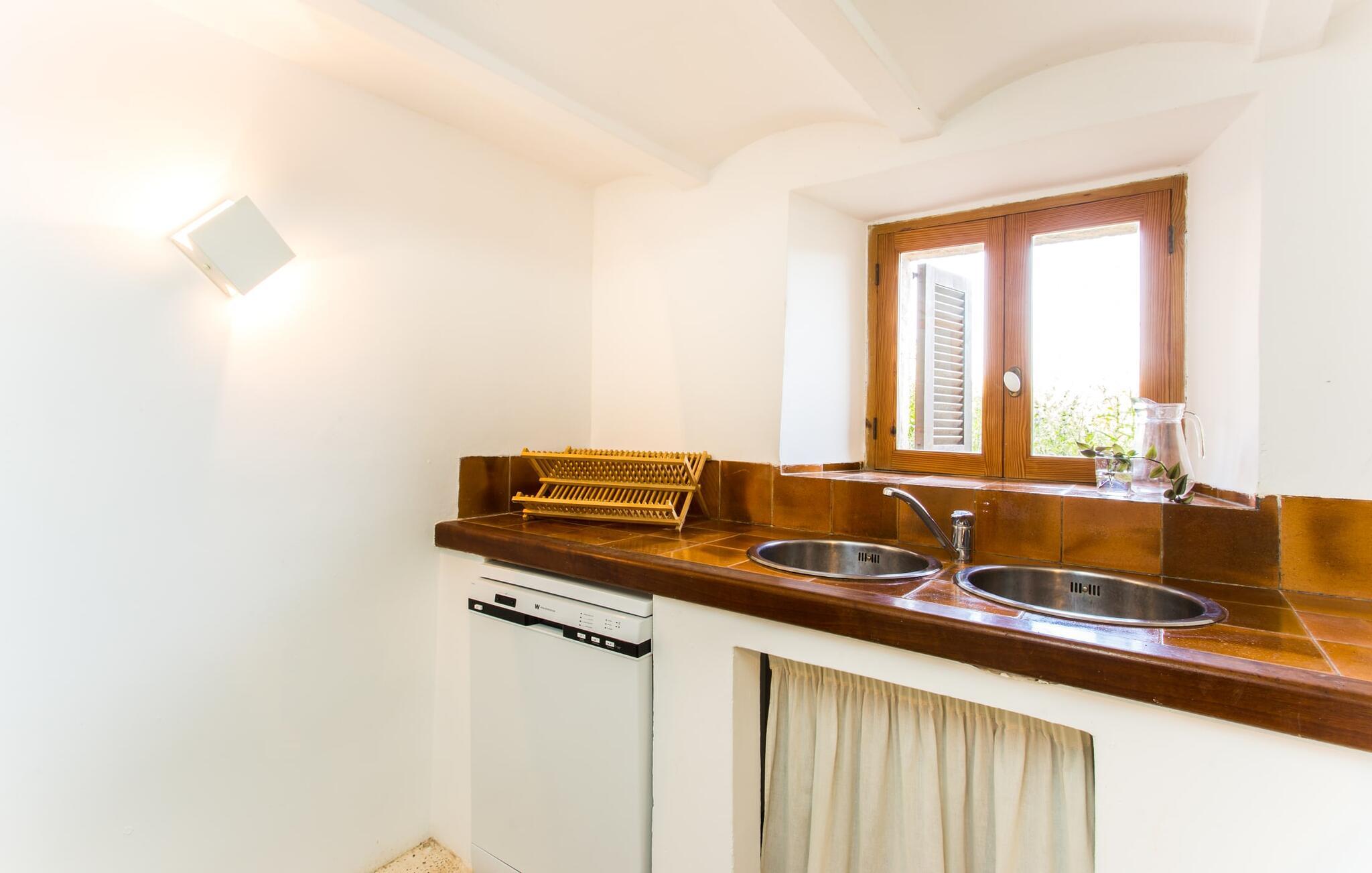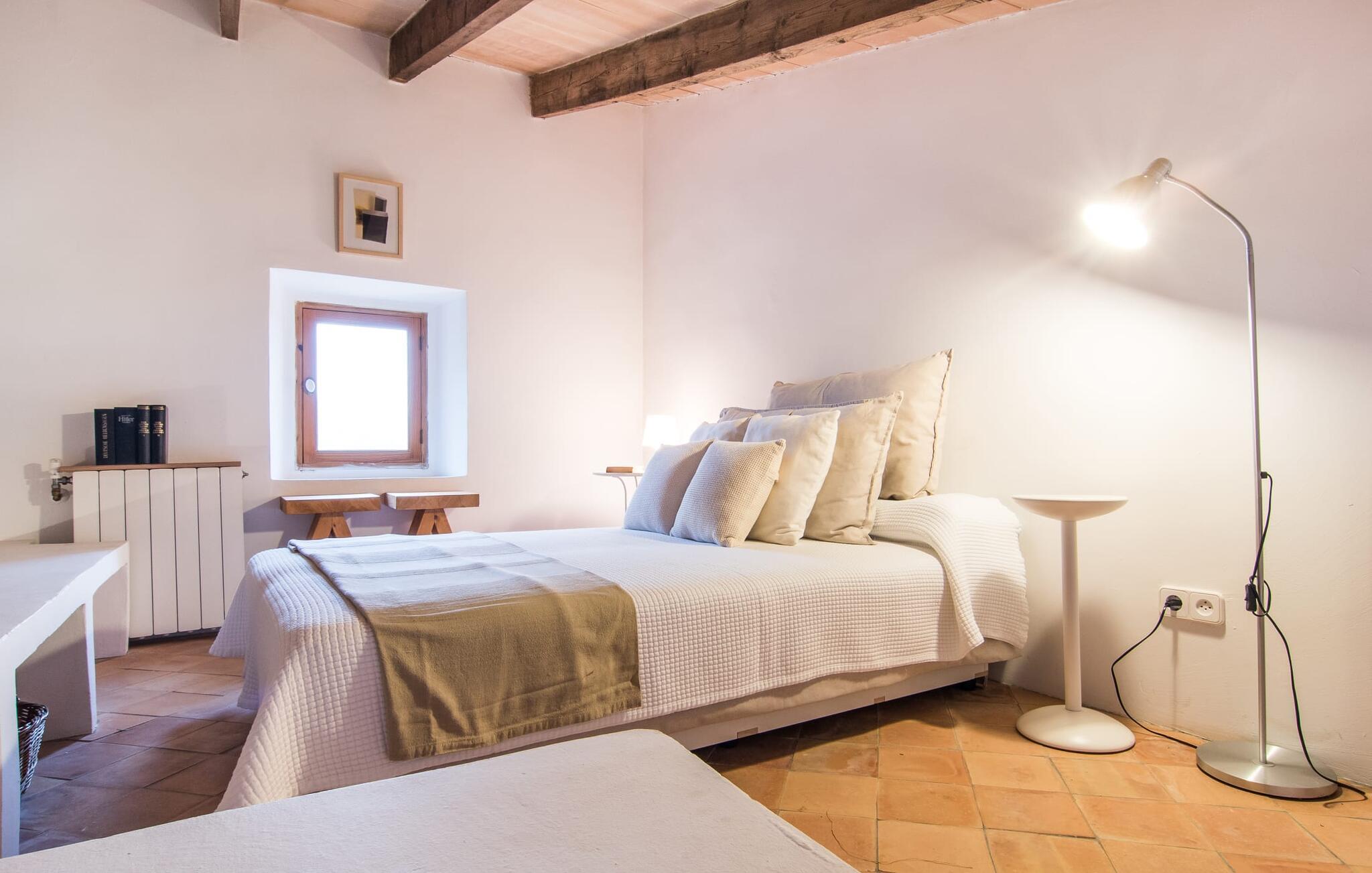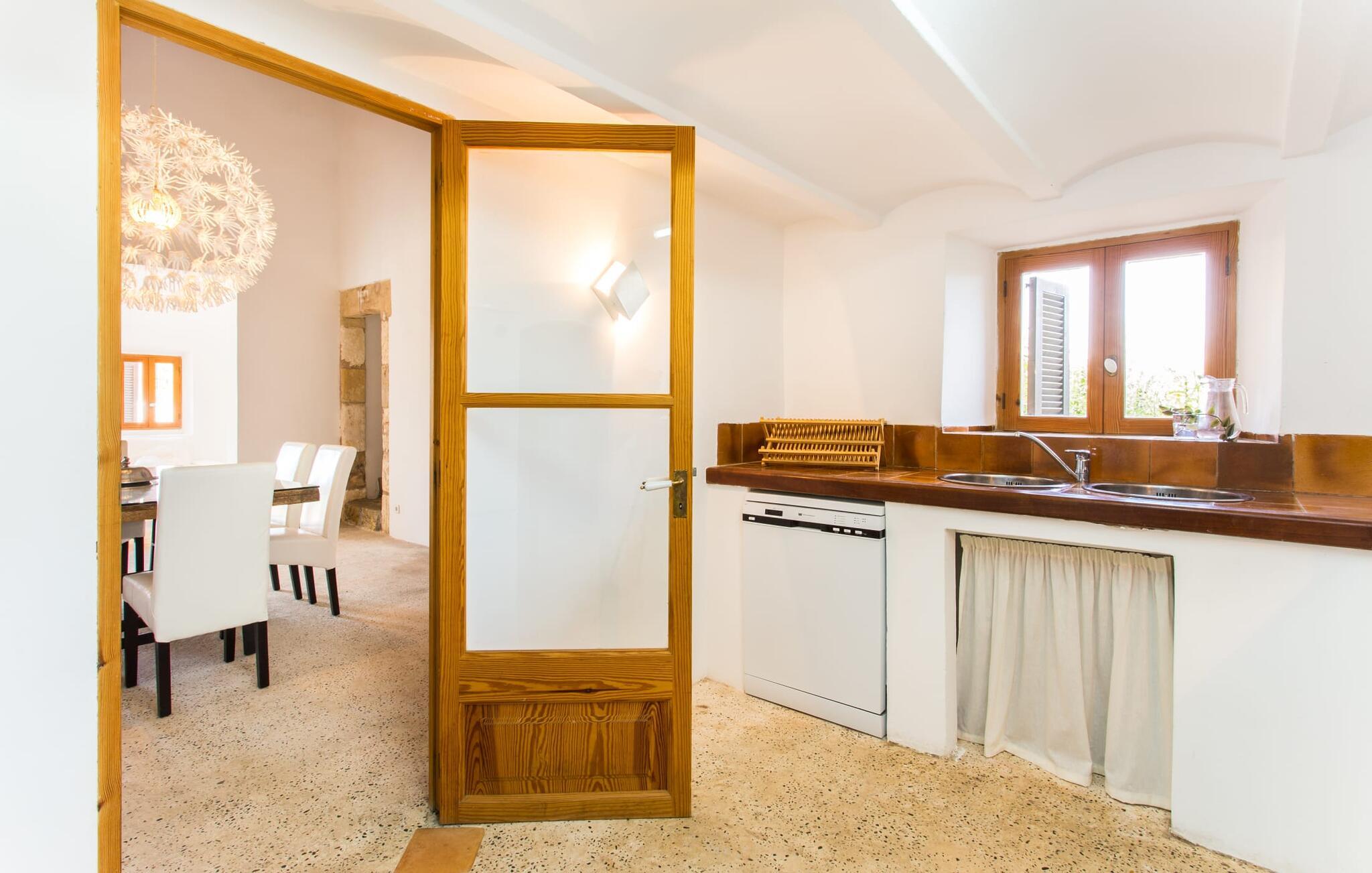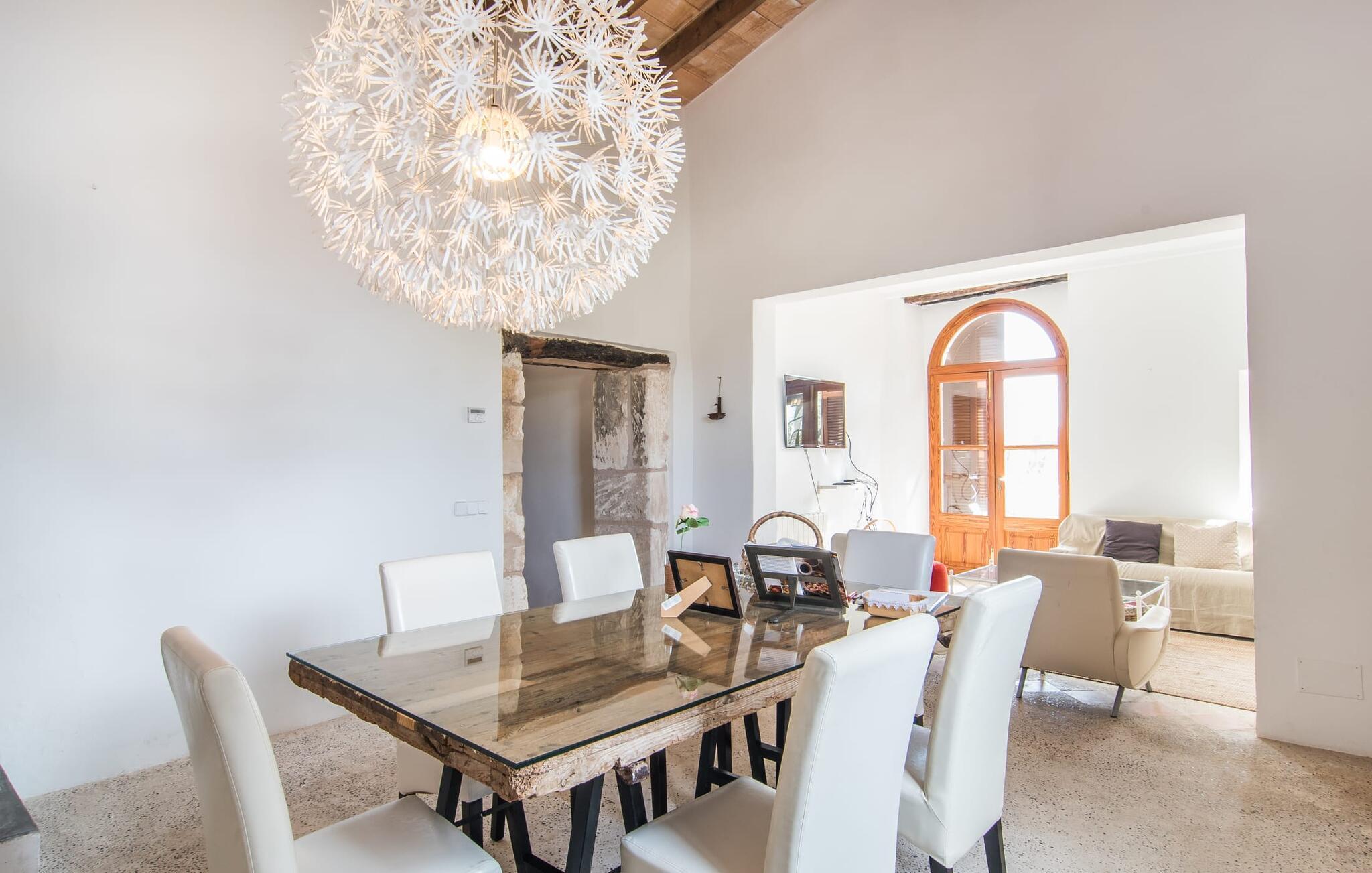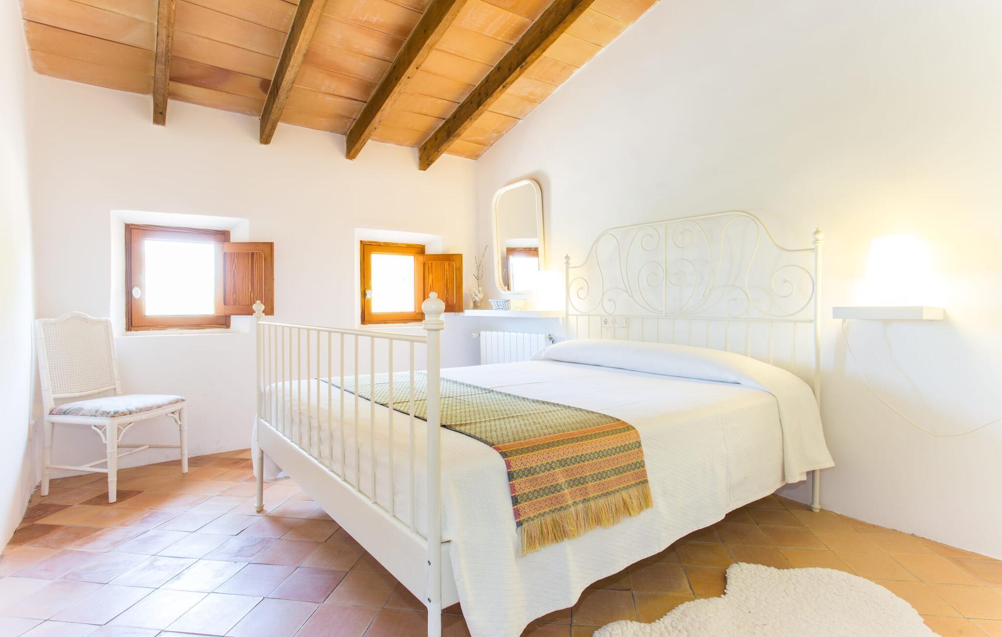 Villa Llucamar är en särskilt charmig fastighet som, bland många andra, framför allt imponerar med sin kärleksfulla inredning och traditionella arkitektur. Det grundades på 1200-talet och tillhörde en gång greve Ayamans, en ättling till James I, erövraren av Mallorca. Så snart man anländer inser man att man verkligen kan känna sig som hemma här: Det här är en smakfull plats att bo på, med en inbjudande modern men ändå typiskt mallorkinsk atmosfär. Utomhusområdet kännetecknas av dekorativa stigar, blomsterrabatter med medelhavsväxter och en mängd olika terrasser. Det vackra poolområdet erbjuder fantastisk utsikt över kullarna på östra delen av ön. Poolen är kaklad med en ljusgrön mosaik och kan lätt nås via trappan ingången. Sex solstolar och två parasoller är den perfekta utrustningen för soldyrkare, som kan koppla av här under Medelhavssolen och lämna vardagen bakom sig. På terrassen, som är täckt med naturmaterial, kan du antingen sitta bekvämt med en drink i den lilla loungehörnan eller njuta av en nylagad måltid vid matbordet. Under varma kvällar serveras smakrika grillkvällar där du kan tillaga och njuta av lokala ingredienser. Andra sittmöjligheter varierar runt fastigheten och ger möjlighet att hitta nya platser att koppla av på, plus att det är lätt att stuva undan.