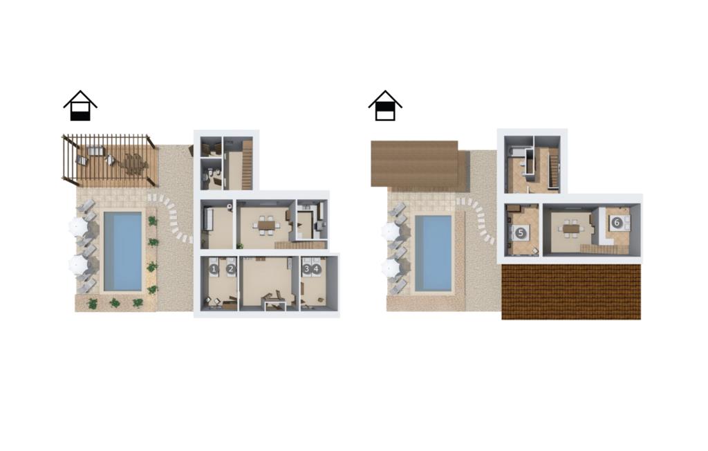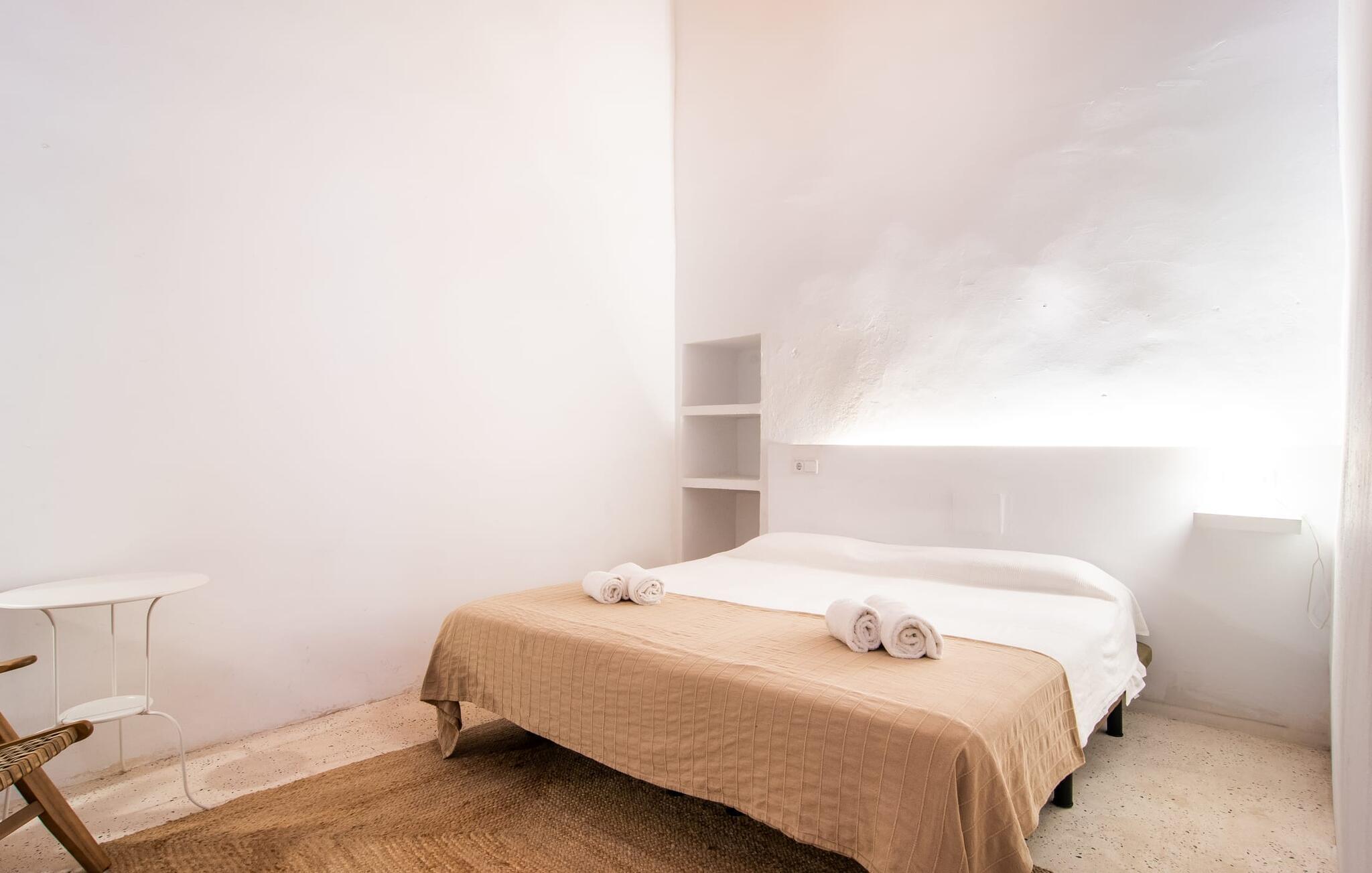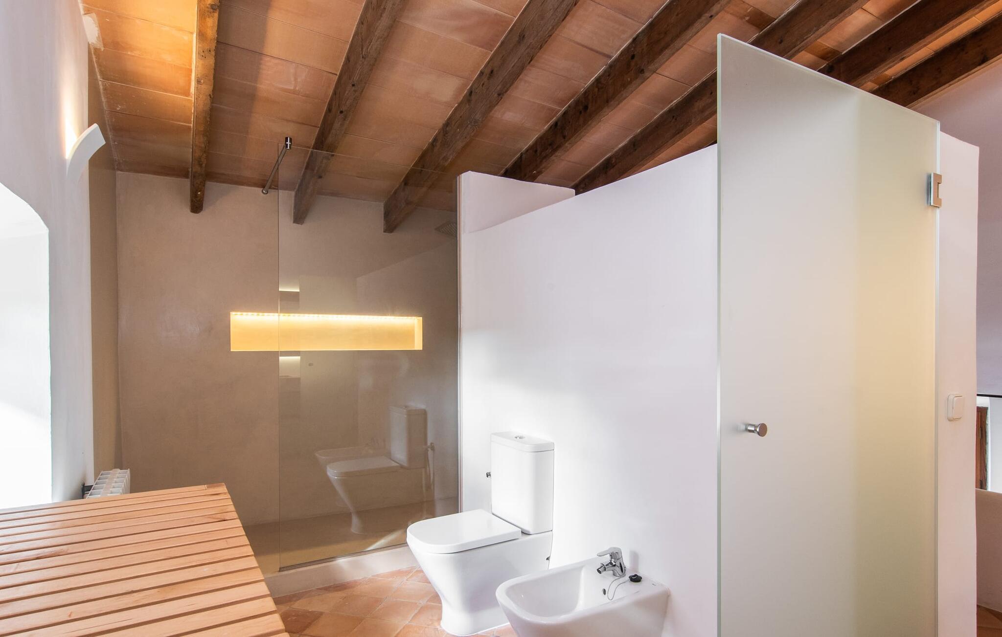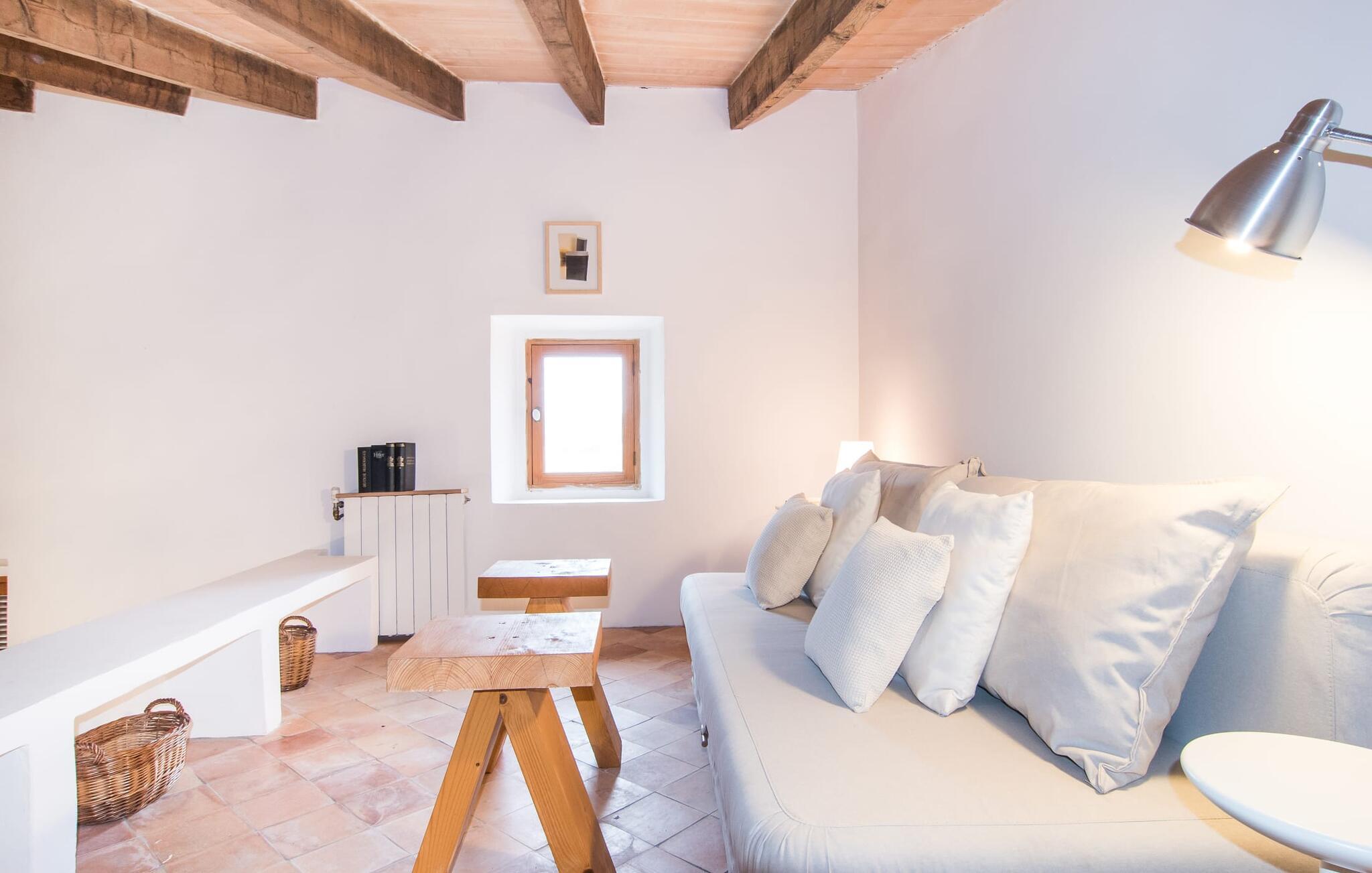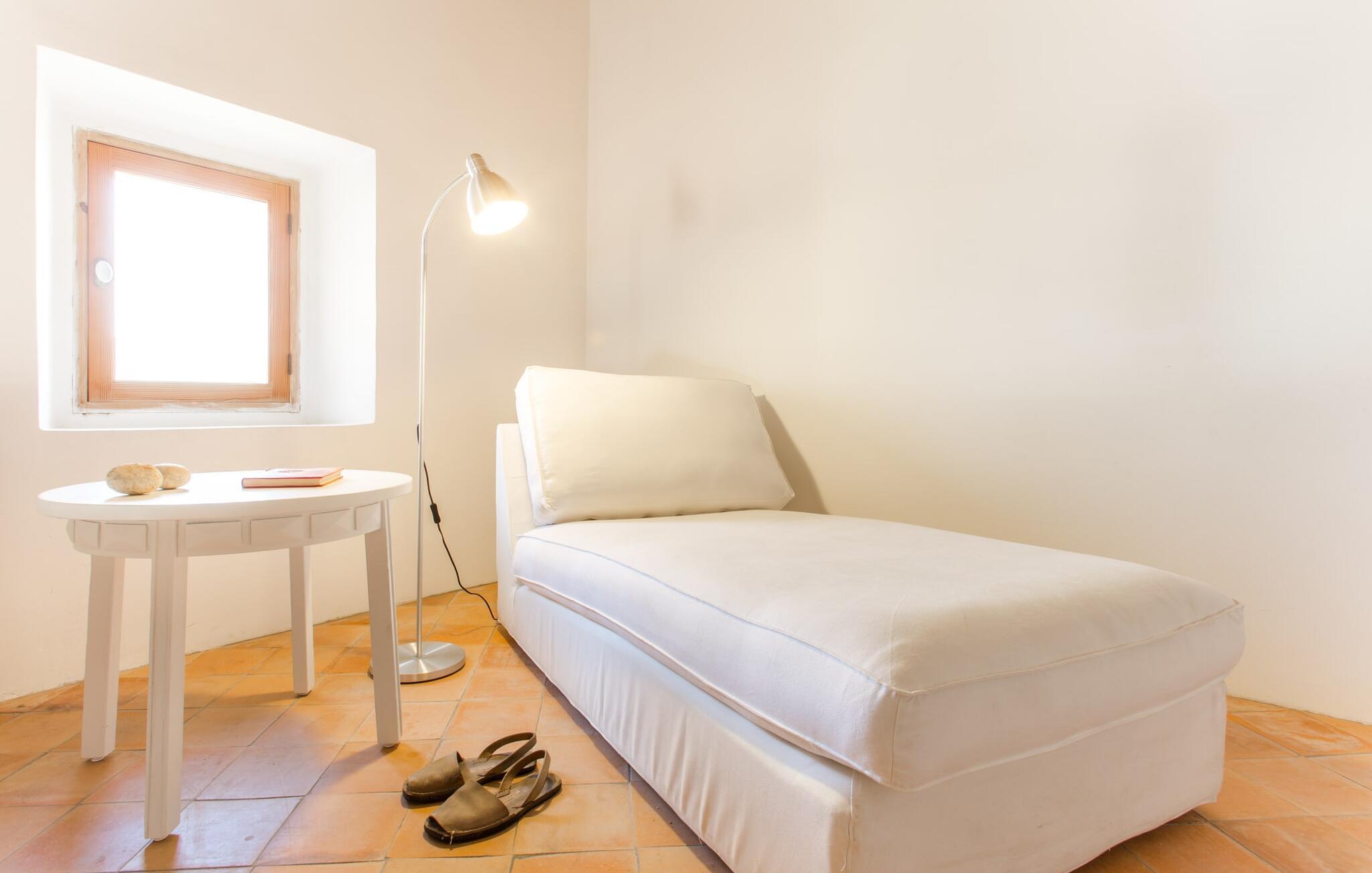 Husets interiör skiner i ljusa färger och eleganta möbler. Här kombineras originalelement perfekt med en modern, snygg design. De ursprungliga sten- och träelementen har bevarats väl under de olika renoveringarna i det förflutna. Traditionella synliga takbjälkar och naturstenselement skapar en imponerande effekt i denna atmosfär. Du kan äta inomhus i matsalen, som är tillgänglig från utsidan. Det rymliga köket är bekvämt beläget intill. Det är utrustat med allt du behöver för daglig användning, inklusive en vattenkokare och filterkaffebryggare. Det mysiga vardagsrummet, som bara skiljs från matplatsen genom en bred passage, erbjuder supermysig avkoppling med en soffa vid den öppna spisen och TV för bra underhållning. Tre estetiska sovrum inbjuder dig att koppla av. Den medvetna avsaknaden av distraherande tillbehör understryker den klara, avslappnade atmosfären. Totalt finns fyra sängar som mäter 0,90 x 1,90 meter och en som mäter 1,60 x 1,90 meter. Ytterligare attraktiva gångar och ett öppet galleri direkt under taket avrundar på ett imponerande sätt det generösa utrymme som erbjuds i detta hus. På övervåningen finns en bekväm bäddsoffa för två personer. De vackra badrummen är också ljust utformade och erbjuder funktionella armaturer och inredning samt naturligt dagsljus. Hårtork och strykjärn finns i bostaden. Du behöver inte oroa dig för att packa.