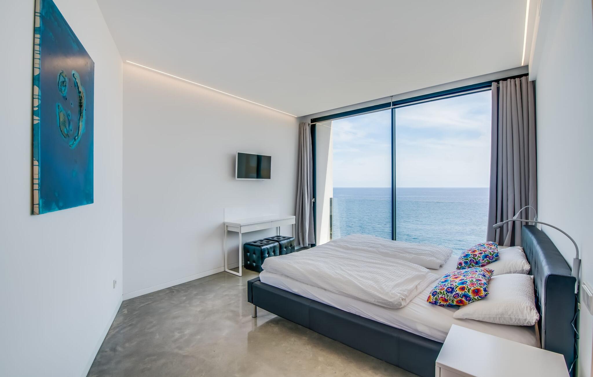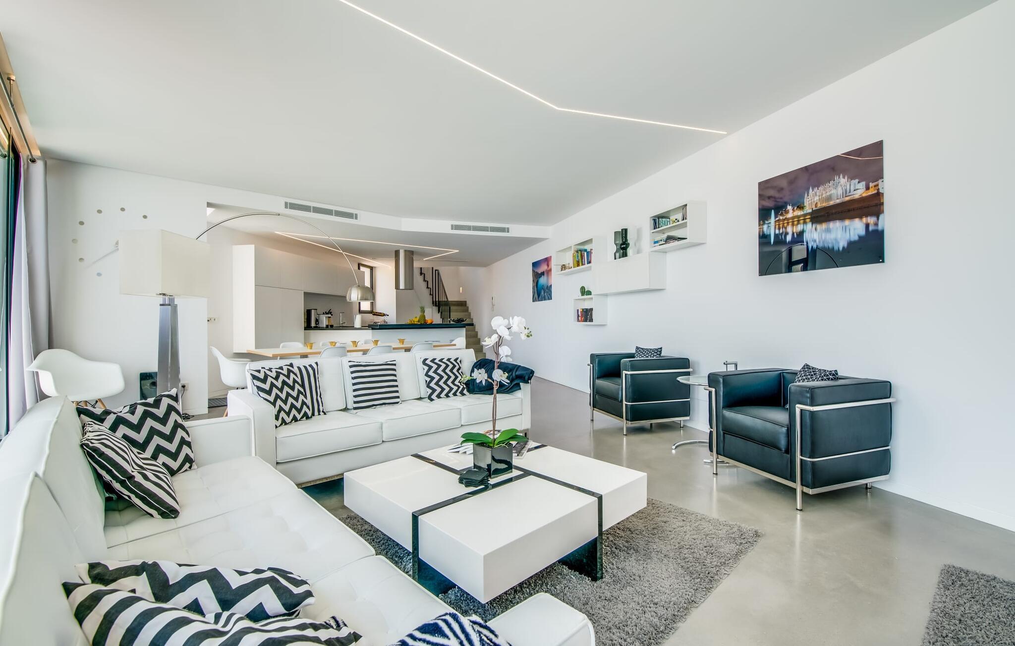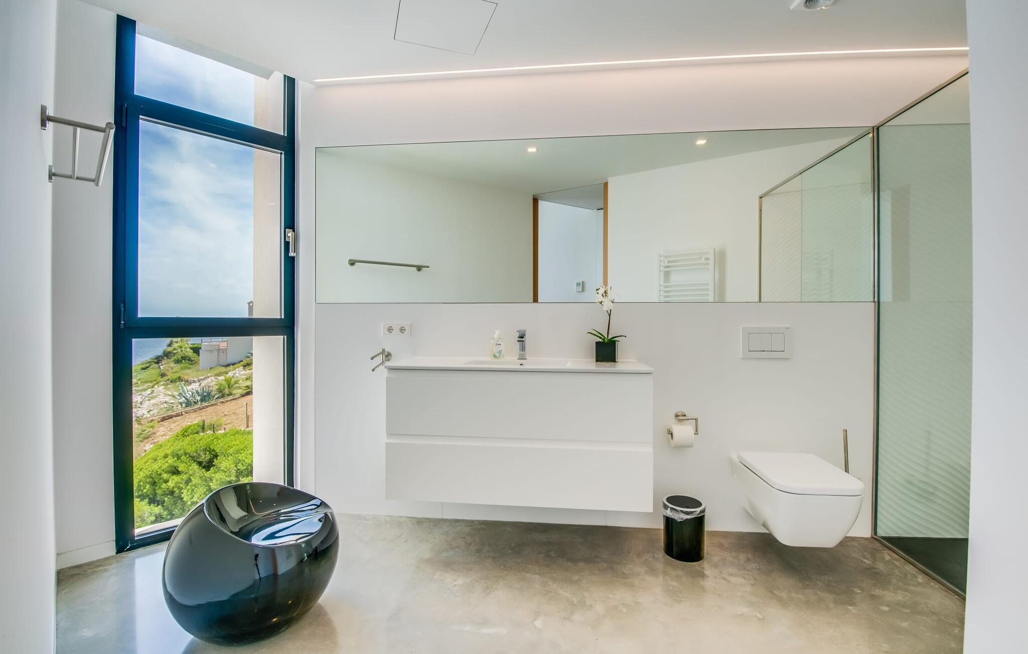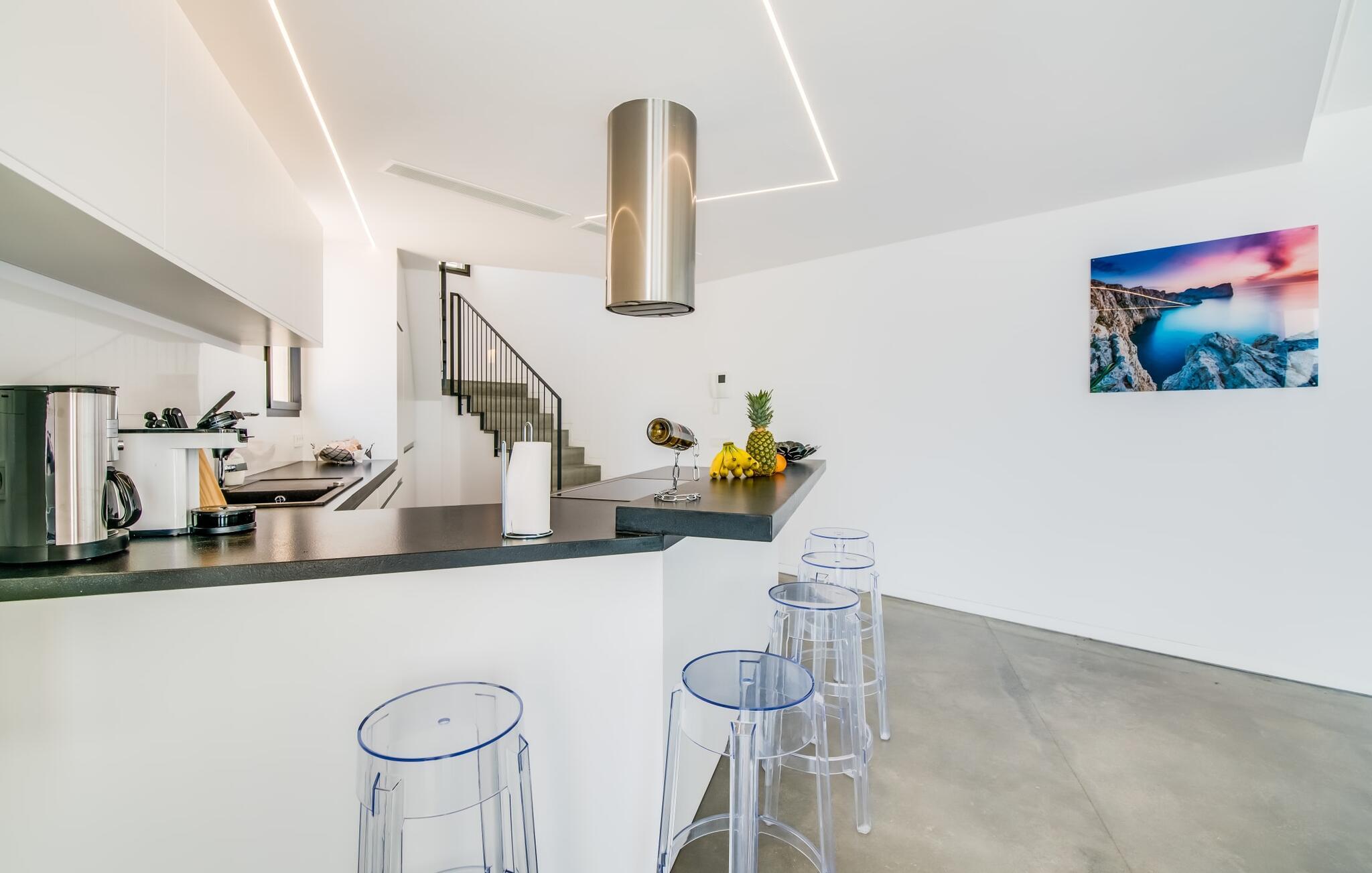 Från havssidan ger de 12 meter höga vertikala pelarna villan ett utseende av ett extremt modernt slottsliknande komplex. Samtidigt är det genomarbetade belysningskonceptet oöverträffat, eftersom horisontella lameller i byggnadshöjd släpper in rikligt med solljus från öst och väst och elegant betonar de dominerande interiörfärgerna grått, svart och vitt. Stora skjutfönster med panoramautsikt förmedlar också en utomhuskänsla i det eleganta vardagsrummet, matsalen och matlagningsområdet: köket, som uppfyller även de högsta kraven, är vitt med en bänkskiva och diskbänk av hamrad svart Zaire-granit, en espressomaskin, en professionell kaffemaskin för åtta personer, en diskmaskin och en kyl/frys är bara några av de delikatesser som gör ditt liv här enklare. Otaliga designklassiker och eleganta blickfång, bland annat i bokträ, ger varaktig inspiration. Alla sovrum är fördelade på två våningar och har smakfulla badrum, luftkonditionering, TV och havsutsikt, medan konstverk på väggarna ger subtila accenter. Det finns också en gästtoalett på bottenvåningen.