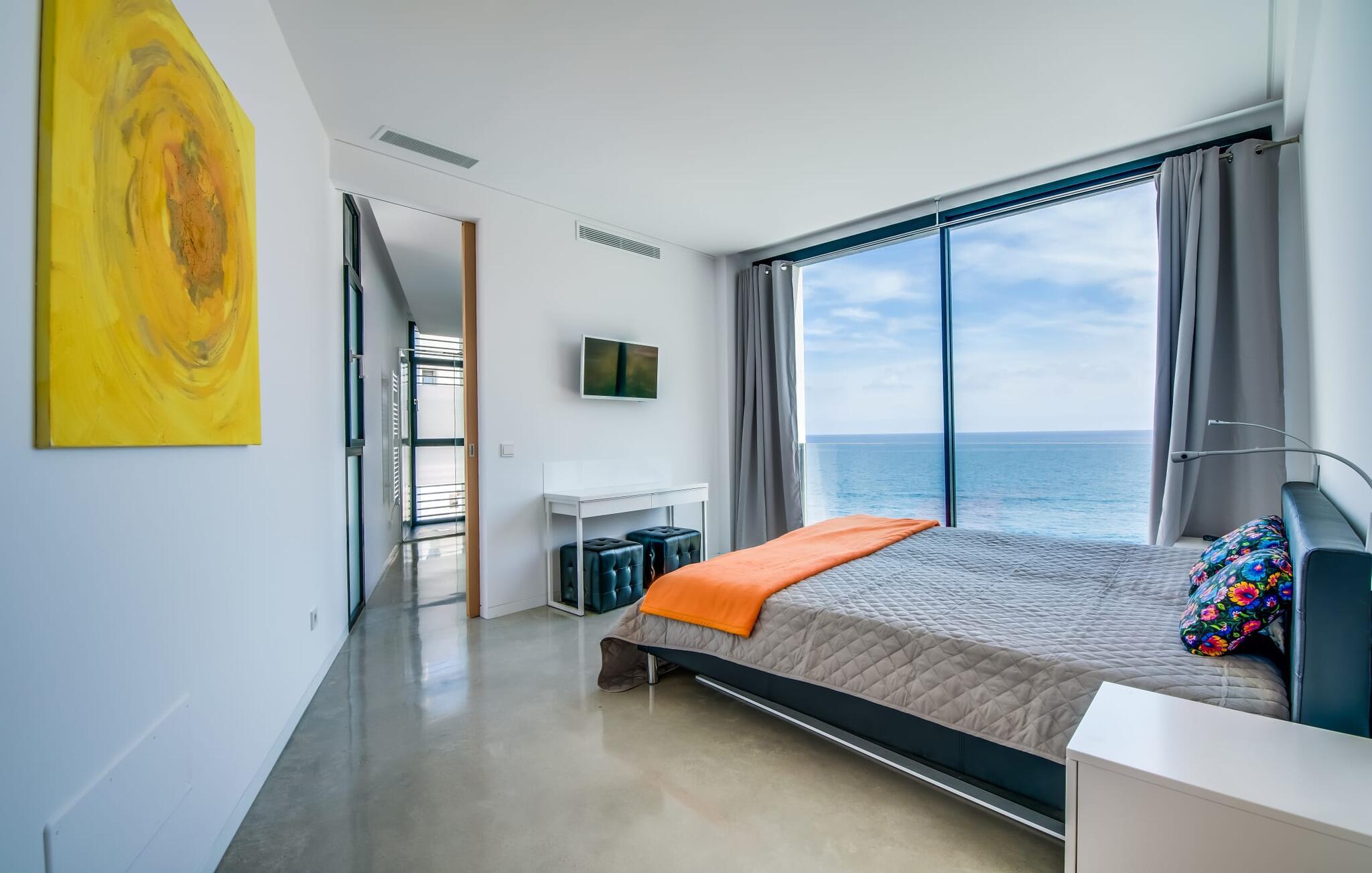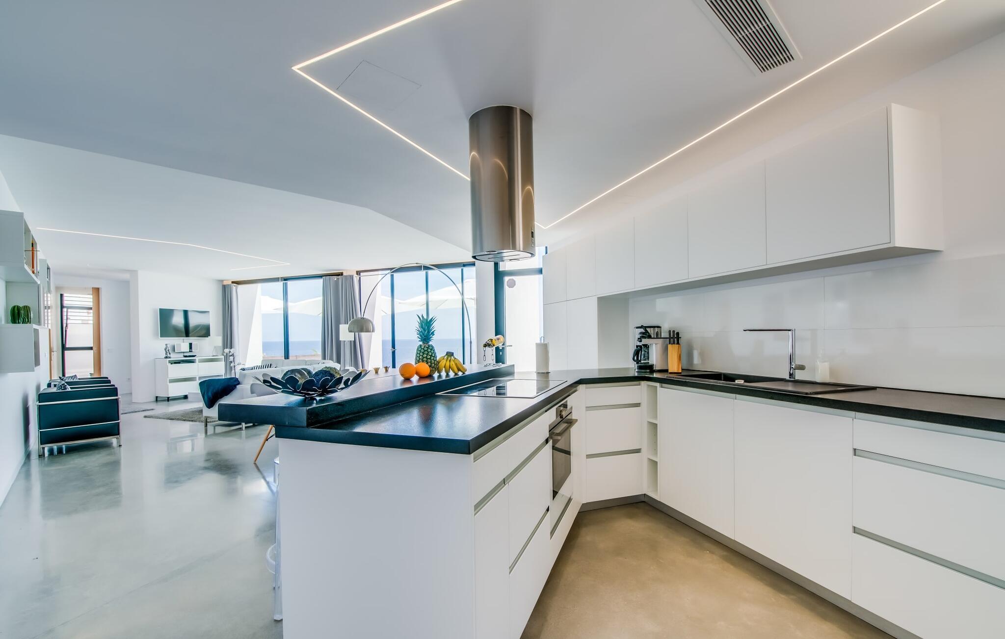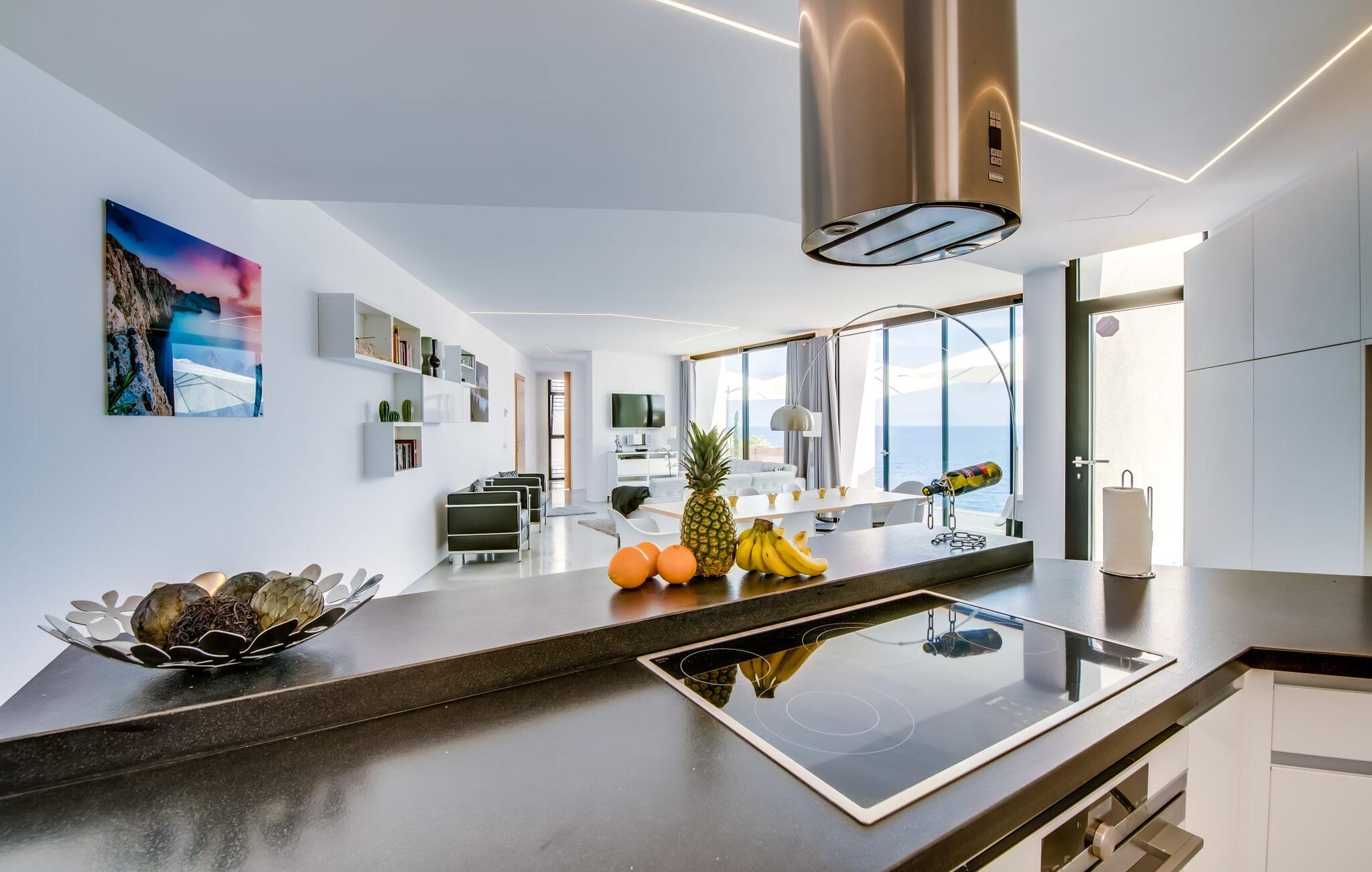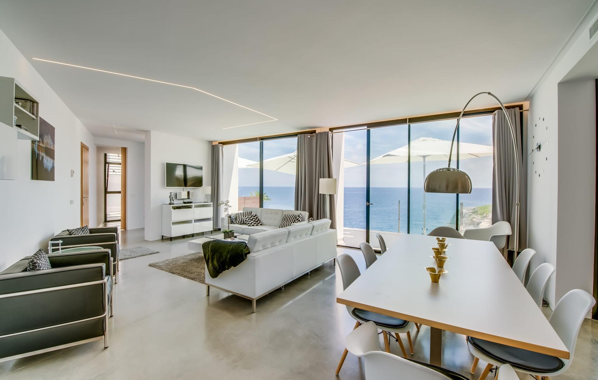 Från havssidan ger de 12 meter höga vertikala pelarna villan ett utseende av ett extremt modernt slottsliknande komplex. Samtidigt är det genomarbetade belysningskonceptet oöverträffat, eftersom horisontella lameller i byggnadshöjd släpper in rikligt med solljus från öst och väst och elegant betonar de dominerande interiörfärgerna grått, svart och vitt. Stora skjutfönster med panoramautsikt förmedlar också en utomhuskänsla i det eleganta vardagsrummet, matsalen och matlagningsområdet: köket, som uppfyller även de högsta kraven, är vitt med en bänkskiva och diskbänk av hamrad svart Zaire-granit, en espressomaskin, en professionell kaffemaskin för åtta personer, en diskmaskin och en kyl/frys är bara några av de delikatesser som gör ditt liv här enklare. Otaliga designklassiker och eleganta blickfång, bland annat i bokträ, ger varaktig inspiration. Alla sovrum är fördelade på två våningar och har smakfulla badrum, luftkonditionering, TV och havsutsikt, medan konstverk på väggarna ger subtila accenter. Det finns också en gästtoalett på bottenvåningen.