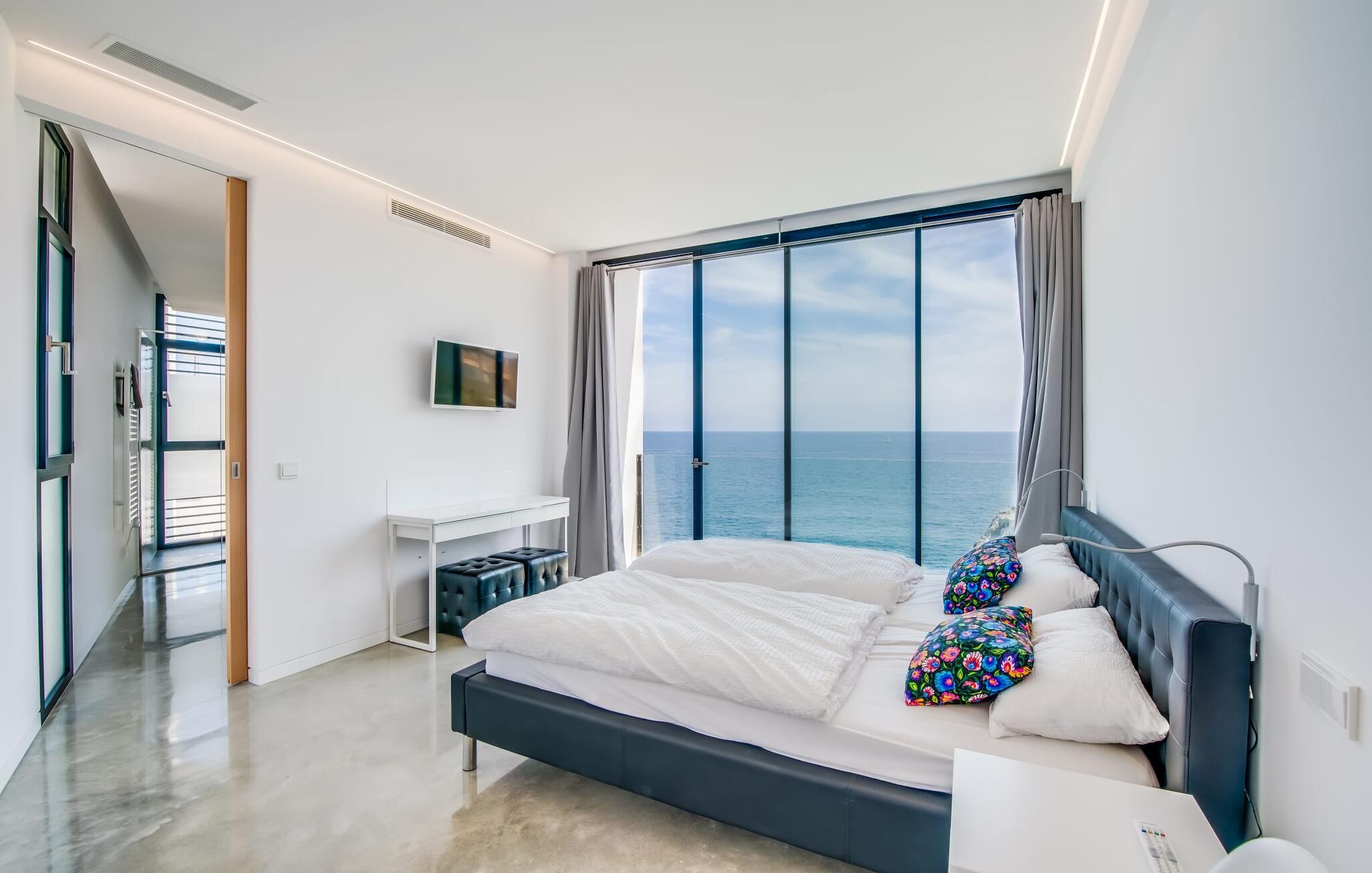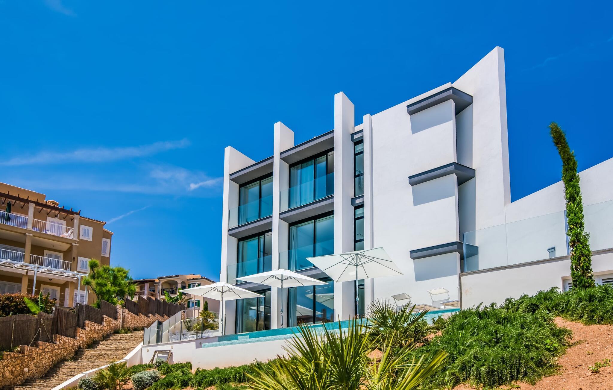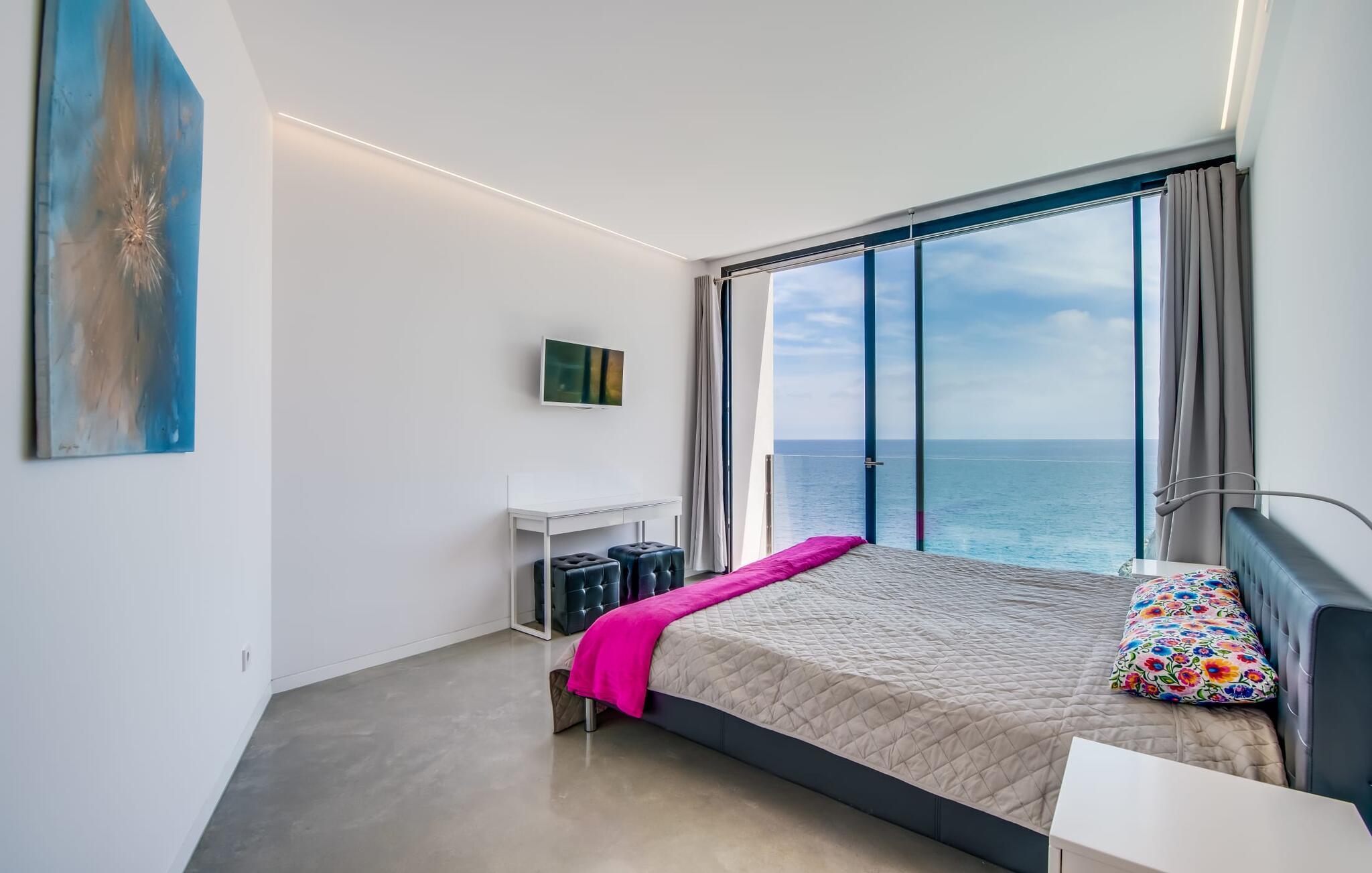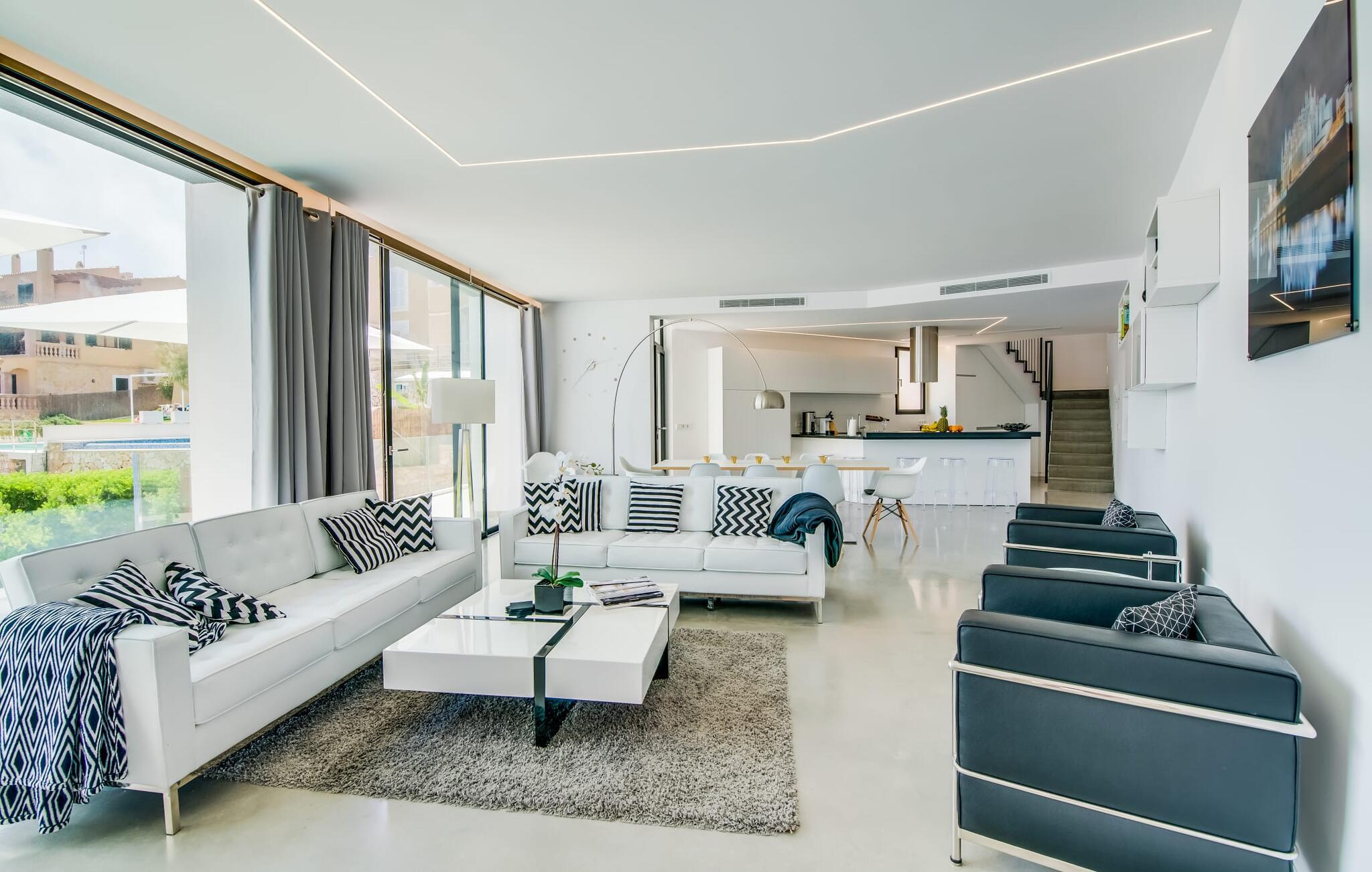Från havssidan ger de 12 meter höga vertikala pelarna villan ett utseende av ett extremt modernt slottsliknande komplex. Samtidigt är det genomarbetade belysningskonceptet oöverträffat, eftersom horisontella lameller i byggnadshöjd släpper in rikligt med solljus från öst och väst och elegant betonar de dominerande interiörfärgerna grått, svart och vitt. Stora skjutfönster med panoramautsikt förmedlar också en utomhuskänsla i det eleganta vardagsrummet, matsalen och matlagningsområdet: köket, som uppfyller även de högsta kraven, är vitt med en bänkskiva och diskbänk av hamrad svart Zaire-granit, en espressomaskin, en professionell kaffemaskin för åtta personer, en diskmaskin och en kyl/frys är bara några av de delikatesser som gör ditt liv här enklare. Otaliga designklassiker och eleganta blickfång, bland annat i bokträ, ger varaktig inspiration. Alla sovrum är fördelade på två våningar och har smakfulla badrum, luftkonditionering, TV och havsutsikt, medan konstverk på väggarna ger subtila accenter. Det finns också en gästtoalett på bottenvåningen.
