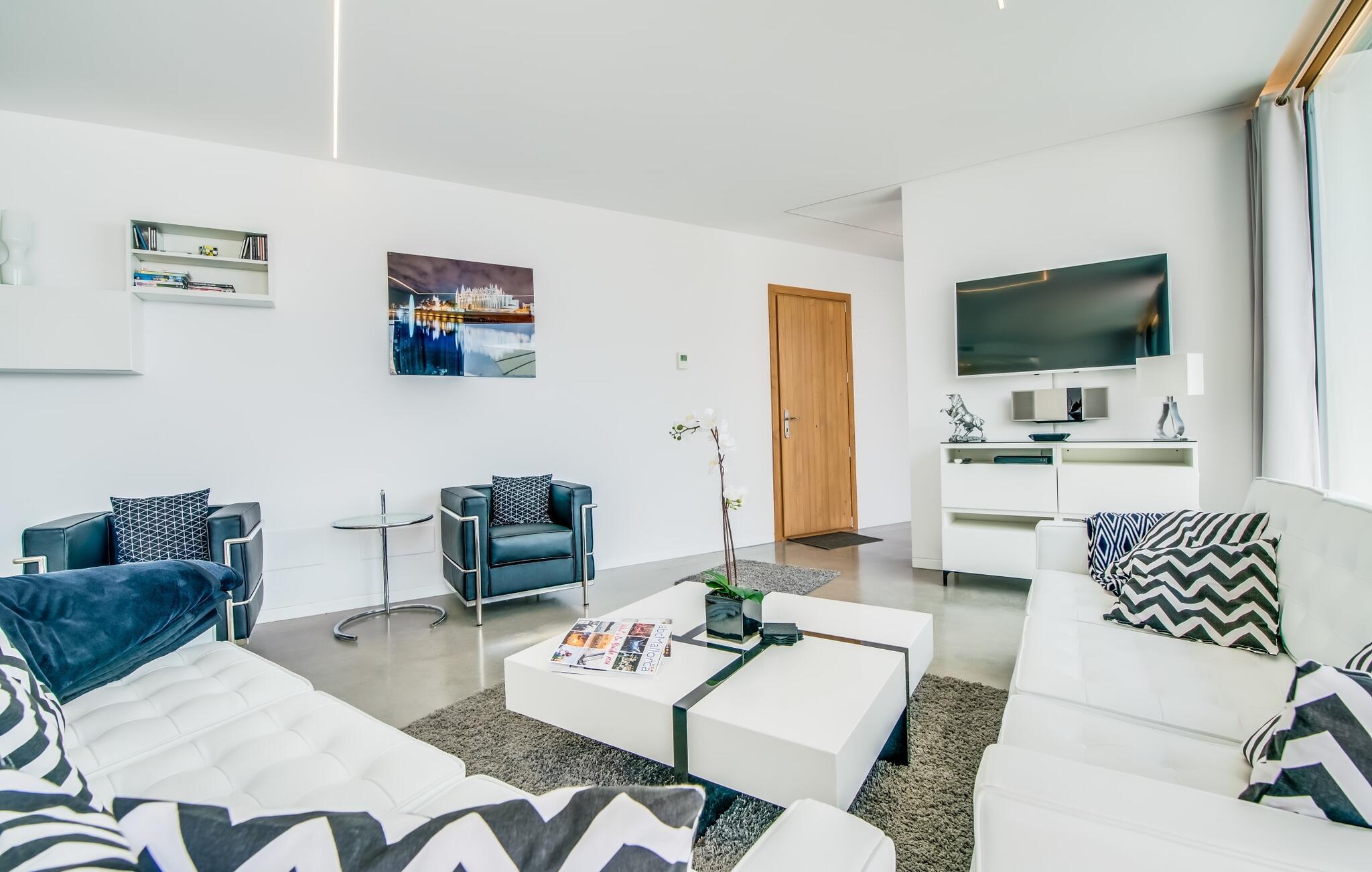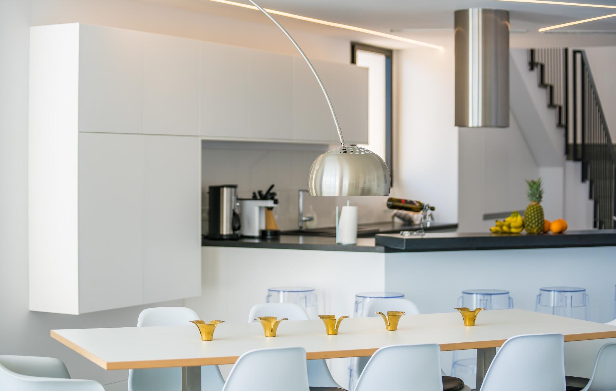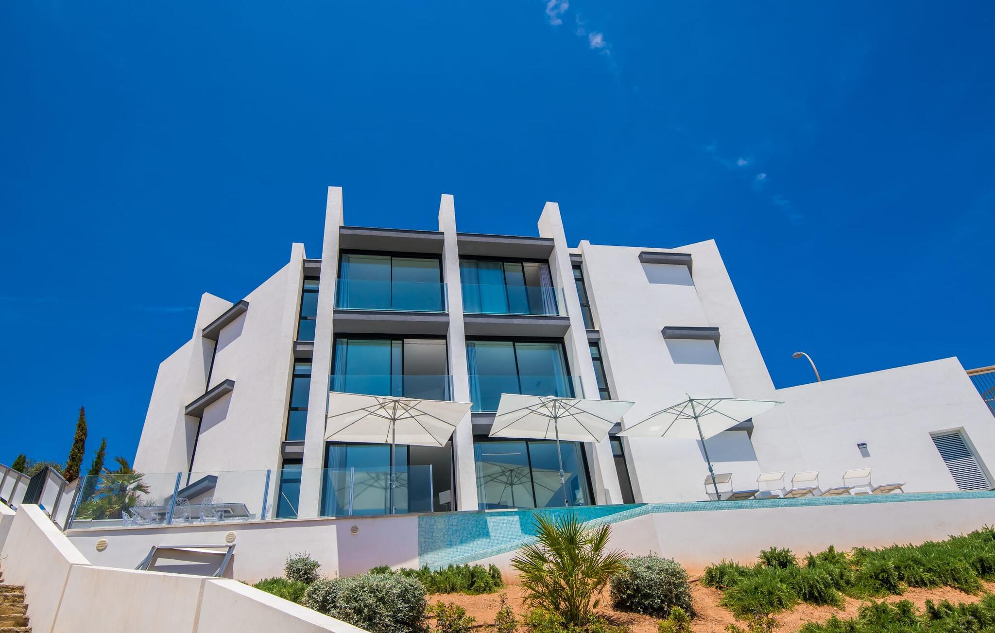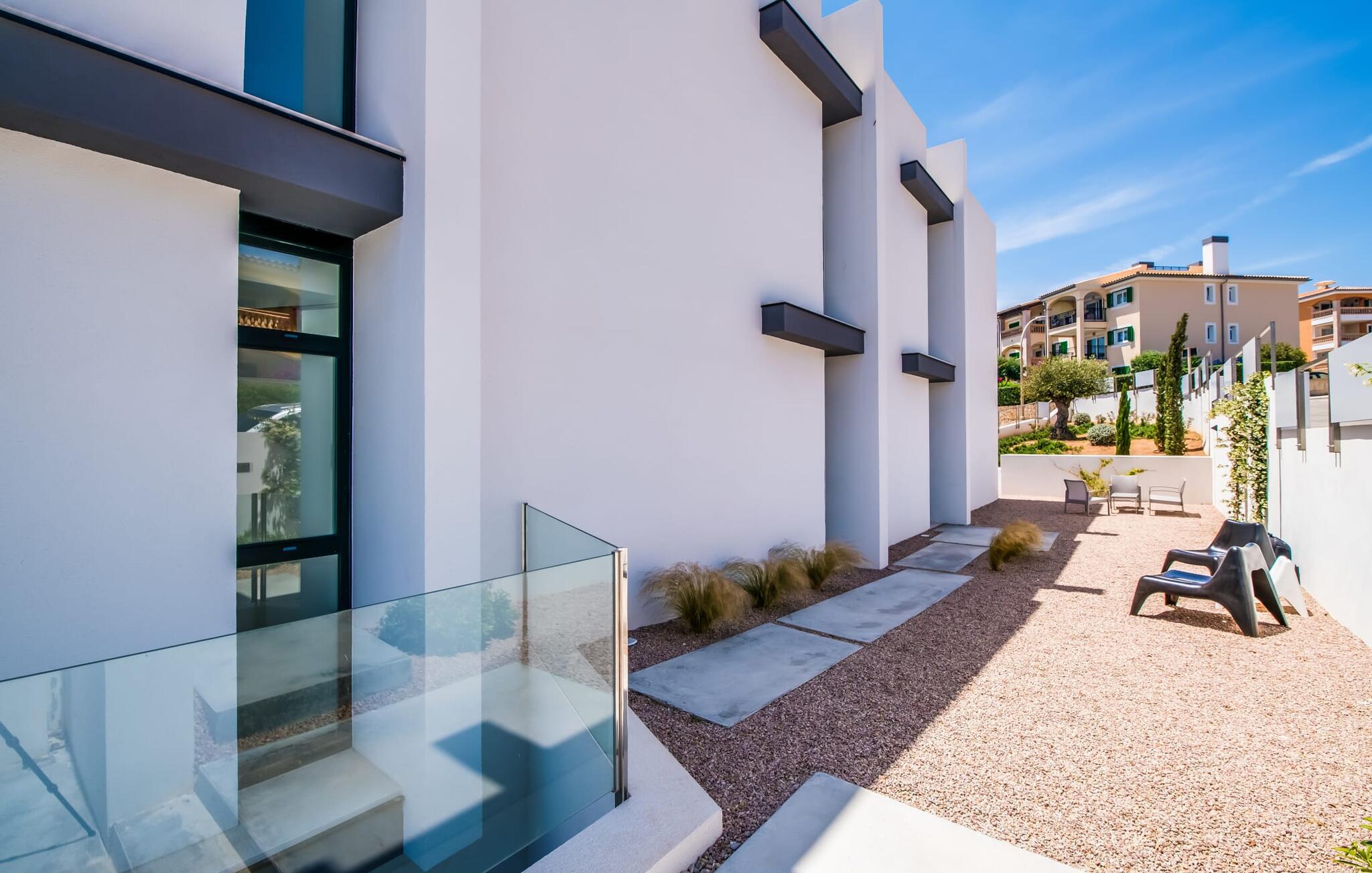 Från havssidan ger de 12 meter höga vertikala pelarna villan ett utseende av ett extremt modernt slottsliknande komplex. Samtidigt är det genomarbetade belysningskonceptet oöverträffat, eftersom horisontella lameller i byggnadshöjd släpper in rikligt med solljus från öst och väst och elegant betonar de dominerande interiörfärgerna grått, svart och vitt. Stora skjutfönster med panoramautsikt förmedlar också en utomhuskänsla i det eleganta vardagsrummet, matsalen och matlagningsområdet: köket, som uppfyller även de högsta kraven, är vitt med en bänkskiva och diskbänk av hamrad svart Zaire-granit, en espressomaskin, en professionell kaffemaskin för åtta personer, en diskmaskin och en kyl/frys är bara några av de delikatesser som gör ditt liv här enklare. Otaliga designklassiker och eleganta blickfång, bland annat i bokträ, ger varaktig inspiration. Alla sovrum är fördelade på två våningar och har smakfulla badrum, luftkonditionering, TV och havsutsikt, medan konstverk på väggarna ger subtila accenter. Det finns också en gästtoalett på bottenvåningen.