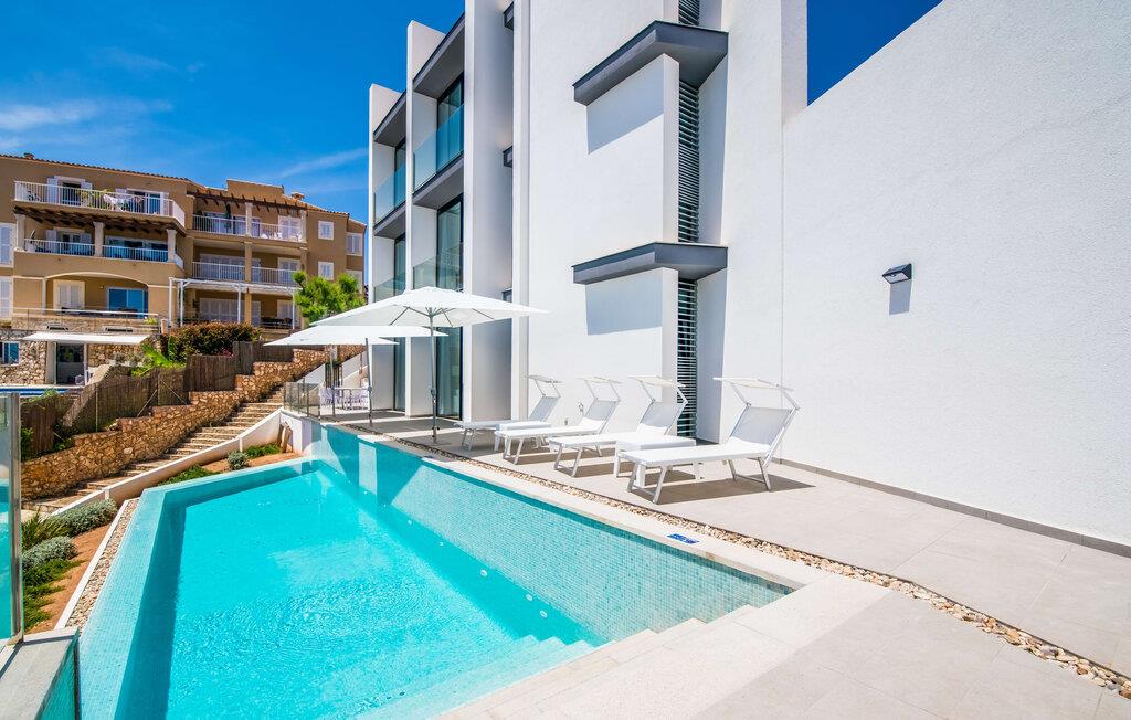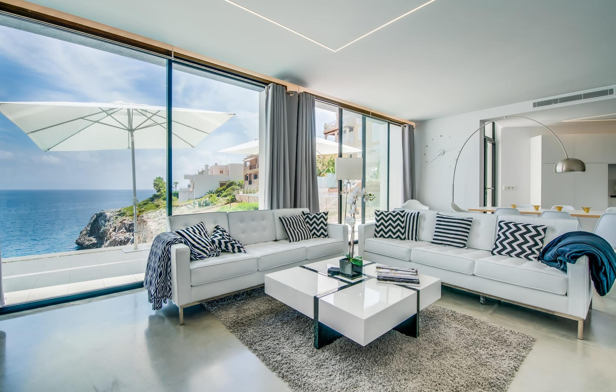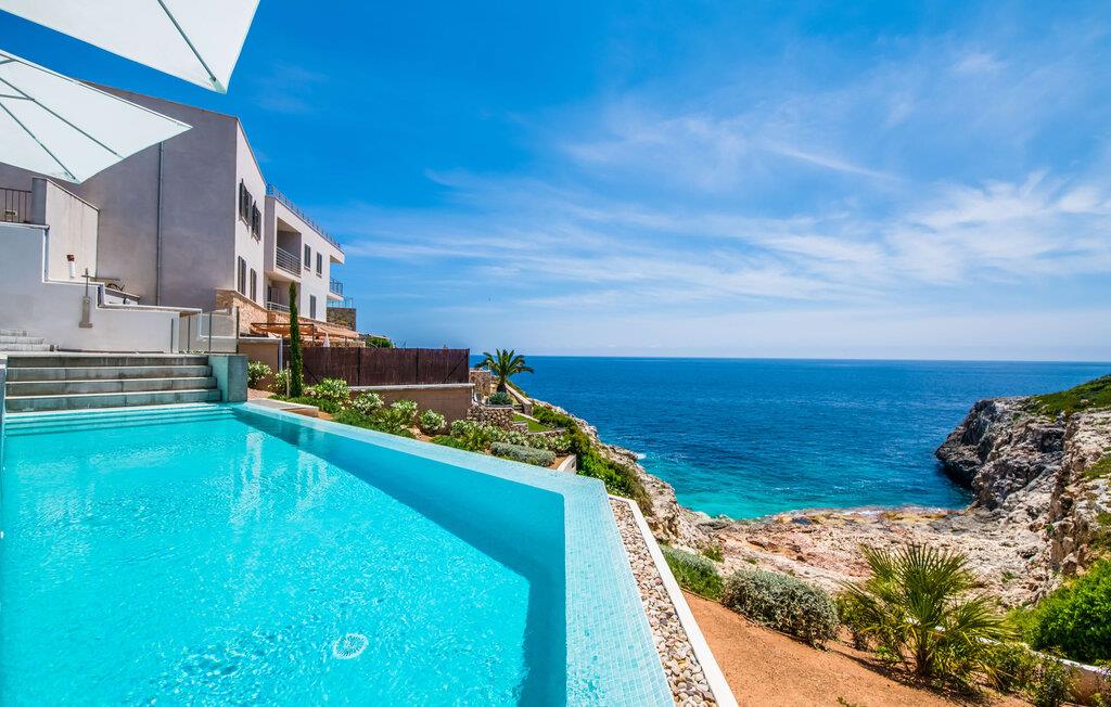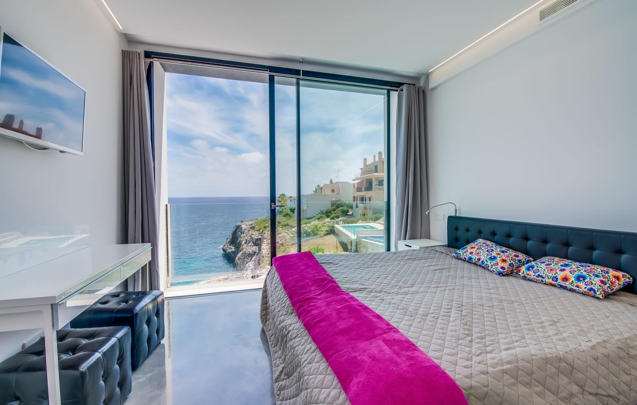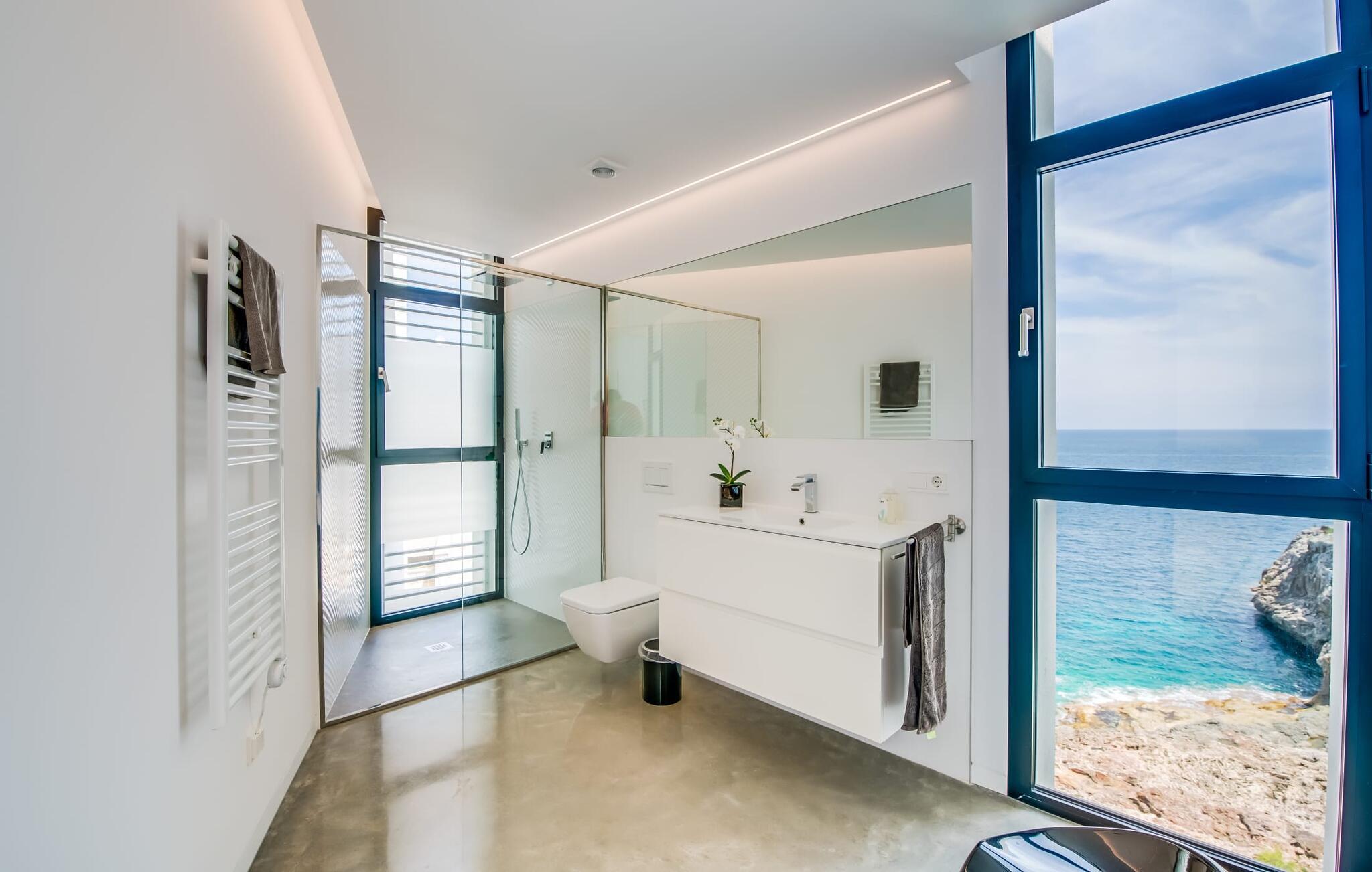 Du har länge sett fram emot din semester; förväntningarna växte ännu mer på flyget till Mallorca och när du har lämnat Palma flygplats liv och rörelse bakom dig står du framför havsvillan: rosmarin och timjan pryder palmer och cypresser samt ett olivträd vaktar vid entrén. Det som arkitekterna har tänkt ut och förverkligat här i omedelbar närhet (500 m) av en grönskande vik kommer att få dig att bli hänförd på nolltid: Fastigheten ligger inbäddad i sluttningen och ståtar med en av de mest havsnära infinitypooler som området har att erbjuda: Härifrån kan du njuta av en utsikt som är uppfriskande i sig själv. När du simmar några avkopplande varv medan du njuter av utsikten, beundrar de turkosa mosaikplattorna på botten av poolen genom vattnet och ser fram emot de delikatesser som väntar dig senare vid grillen, kommer din avslappningsfaktor att öka avsevärt. Solstolar finns ovanför poolen, perfekt för att sola efter en simtur.