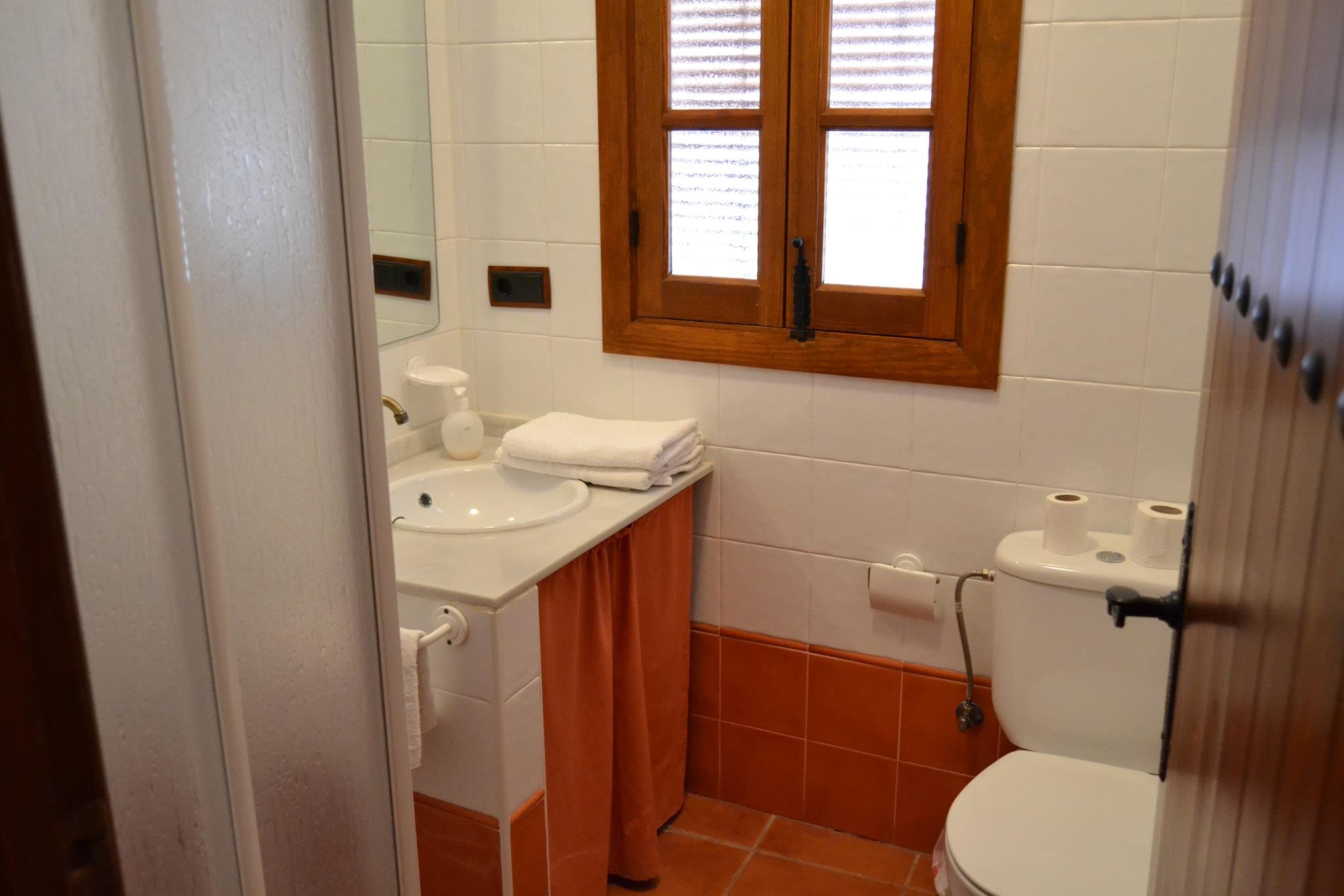 Bottenvåningen: (Hall(gemensam entré)) På våning 1: (Kök(spis(Spis med 4 kokplattor, keramisk), mikrovågsugn, diskmaskin, kyl och frys), ardags- och matrum(TV, matbord, öppen spis, sitthörna), Bedroom with bathroom(dubbelsäng, badkar med dusch, handfat, toalett , bidé), Bedroom with bathroom(2x enkelsäng, badkar, dusch, handfat, toalett , bidé), Bedroom with bathroom(2x enkelsäng, badkar, dusch, handfat, toalett , bidé), Bedroom with bathroom(dubbelsäng, dusch, handfat, toalett , bidé), balkong) värme(elektrisk), luftkonditionering, uteplats(delas med andra gäster ), terrass(privat), trädgård(delas med andra gäster , inhägnad), trädgårdsmöbler, parkering, swimmingpool(delas med andra gäster , opened from 1/2 May upto and including 1/2 Sep), spjälsäng