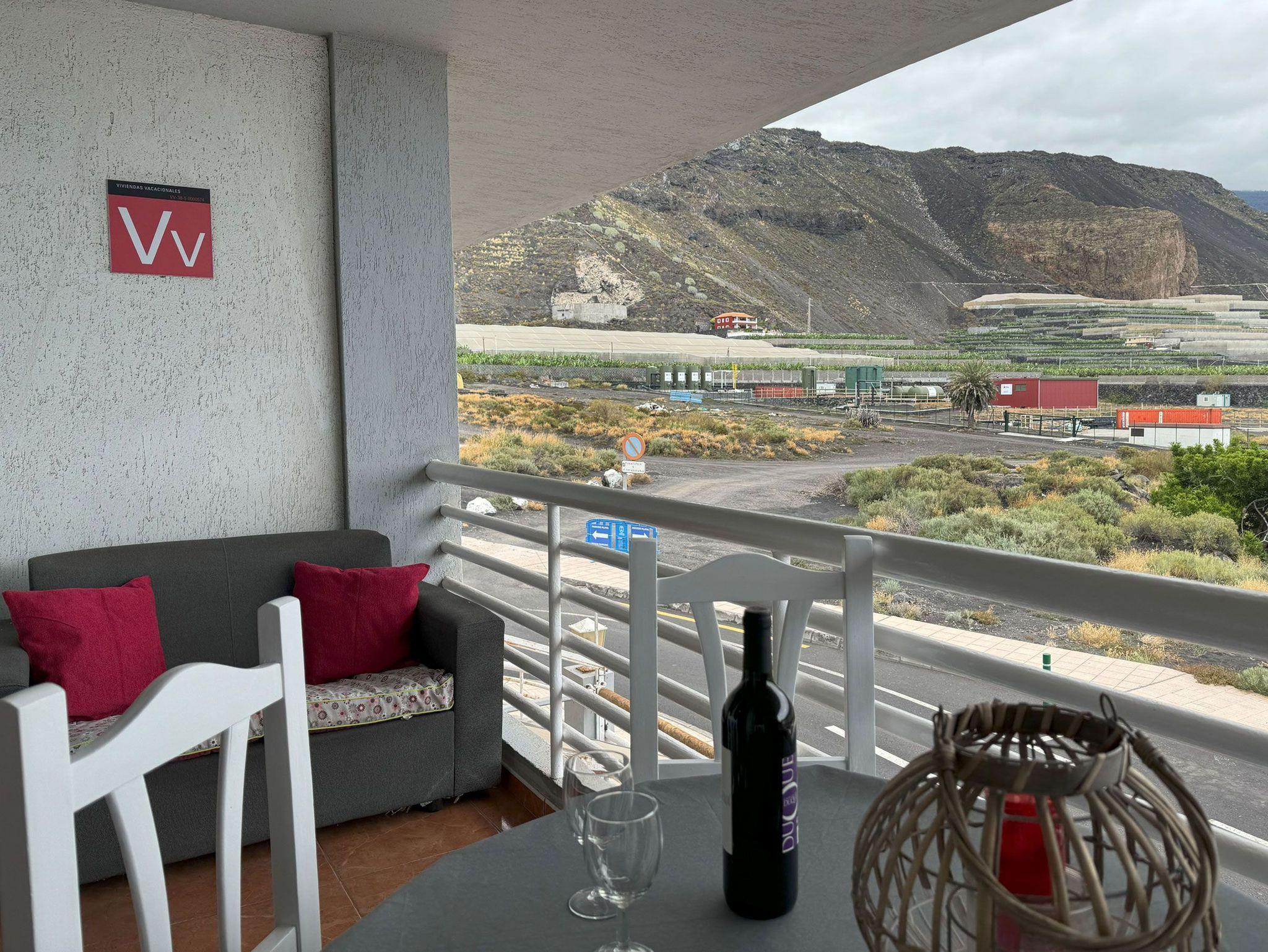 Der überdachte Balkon mit seitlichem Meerblick bietet auf ca. 6qm Platz für einen Tisch mit 3 Stühlen, ein kleines Sofa sowie einen Getränkekühlschrank. Das Wetter in Puerto Naos lädt ganzjährig dazu ein, auf dem Balkon zu frühstücken.