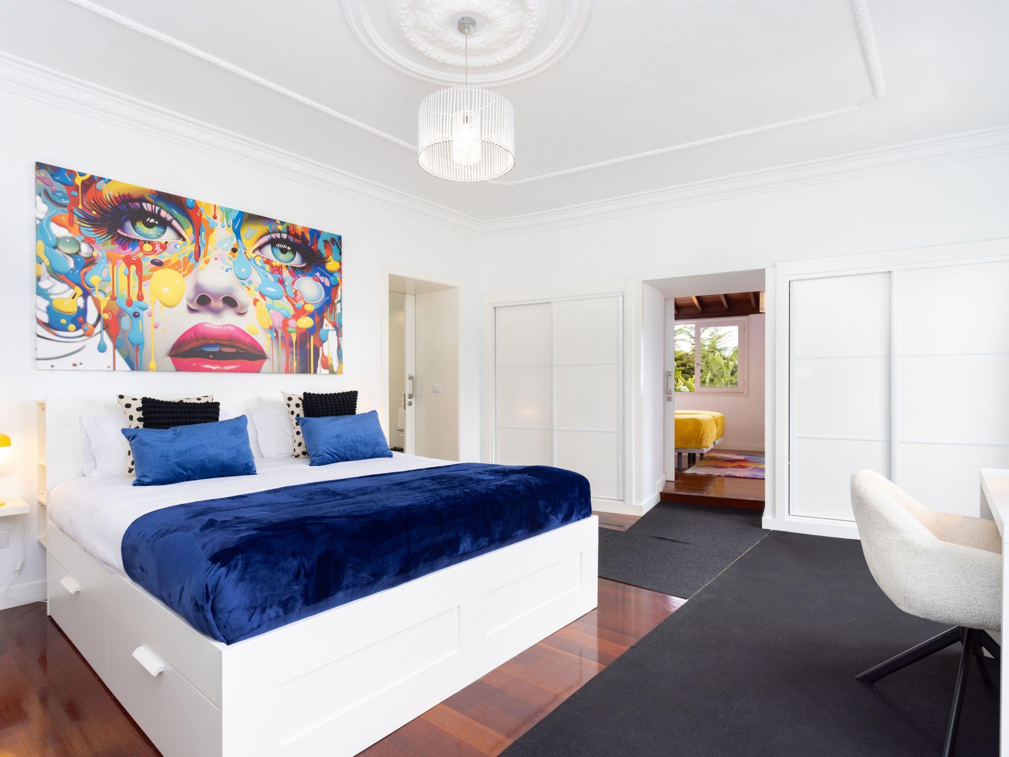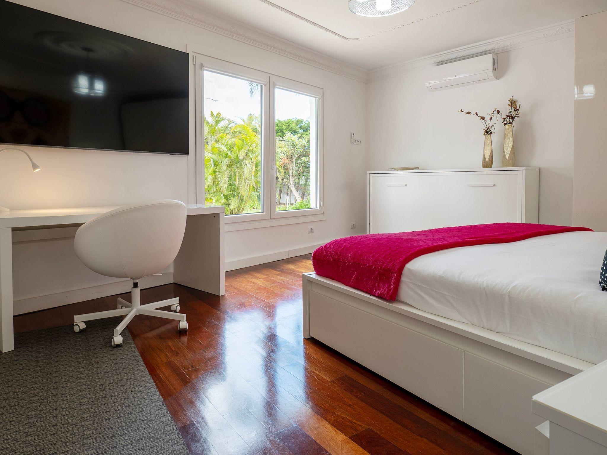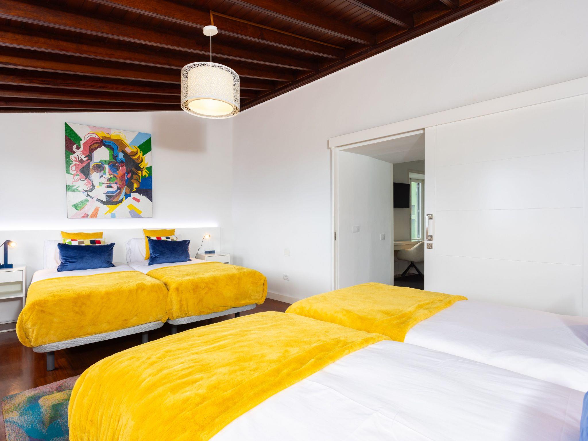The next bedroom is a spacious family room, with a main room with double bed and en-suite bathroom with shower, and another room with 2 single beds that can be used as a children's room or by adults, as there is an intermediate door. With a total size of 44 m2, this room offers enough space for everyone and a wonderful view of the garden.