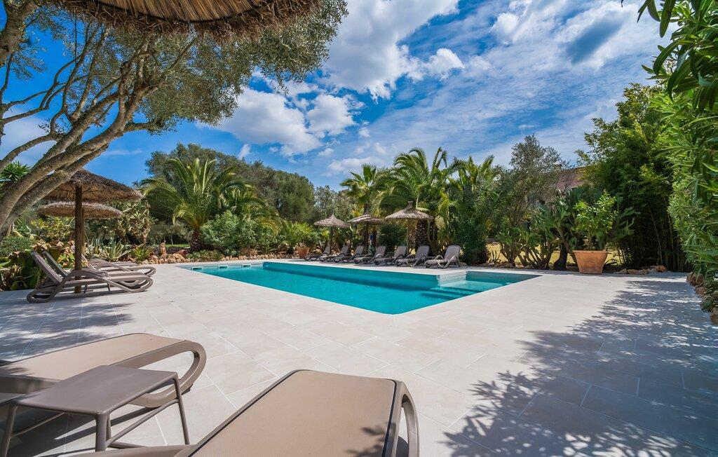 Terrassen är möblerad med högkvalitativa teakmöbler, perfekt för avkoppling. En stor, gemensam, upplyst pool med en omgivande solterrass och gott om solstolar och parasoller inbjuder till svalka och avkoppling. En vänlig åsna, "Toni", ger glädje åt barnen och bidrar till charmen i detta ekologiskt förvaltade hem.