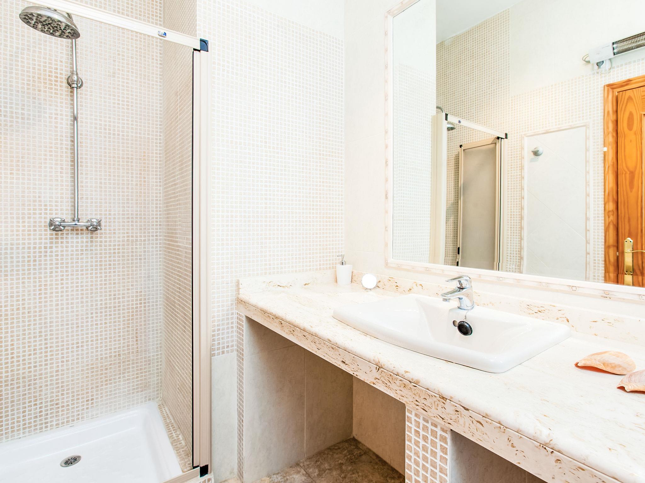 "Paraje los cabreras", 8-room house 413 m2 on 3 levels, south-east facing position. Spacious, practical furnishings: living room with open-hearth fireplace, digital TV, air conditioning, forced-air heating and boiler (100 litres). 1 room with 1 french bed (1 x 135 cm), shower/WC, air conditioning and forced-air heating. Living/dining room. Exit to the terrace. Open kitchen (5 hot plates, oven, dishwasher, toaster, kettle, microwave, freezer, electric coffee machine, cooking island) with dining table. Exit to the terrace. Sep. WC. On the lower ground floor: 1 room with 1 french bed (1 x 150 cm, length 200 cm), fan. 1 room with 1 french bed (1 x 150 cm, length 200 cm), fan. Lounge with TV. Bath/shower. Upper floor: 1 room with 1 french bed (1 x 150 cm, length 200 cm), bath/bidet/WC, air conditioning and forced-air heating. Exit to the terrace, south facing position. 1 room with 1 french bed (1 x 150 cm, length 200 cm). Exit to the balcony. 2nd upper floor: with sloping ceilings, 1 room with 2 french beds (1 x 150 cm, length 200 cm), shower/bidet/WC, air conditioning and forced-air heating. Shower/bidet/WC. Patio. Terrace furniture, barbecue, deck chairs (4). Partial view of the sea. Facilities: washing machine, iron, hair dryer. Internet (WiFi, free). Parking. Please note: TV only ES. VUT/MA/02216 // Reg. Nr.: ESFCTU0000290250003268700000000000000000VUT/MA/022168